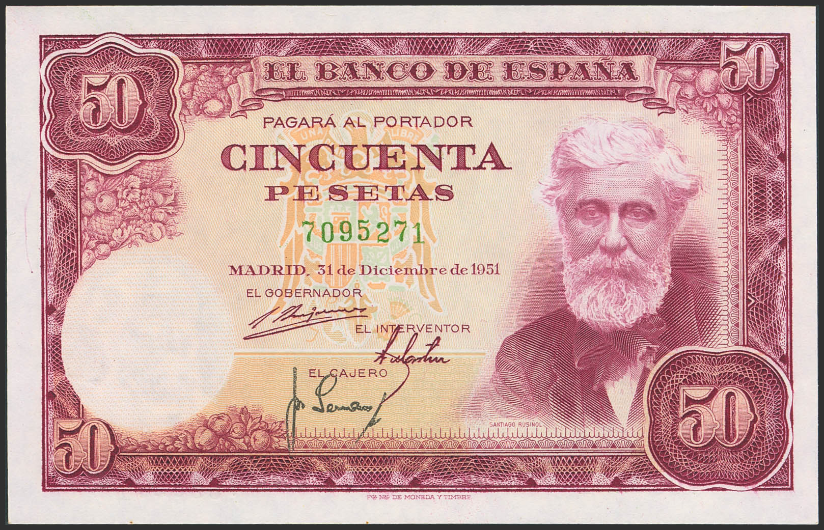 50 Pesetas. December 31, 1951. No series. (Edifil 2023: 462). Original marking. Uncirculated-.