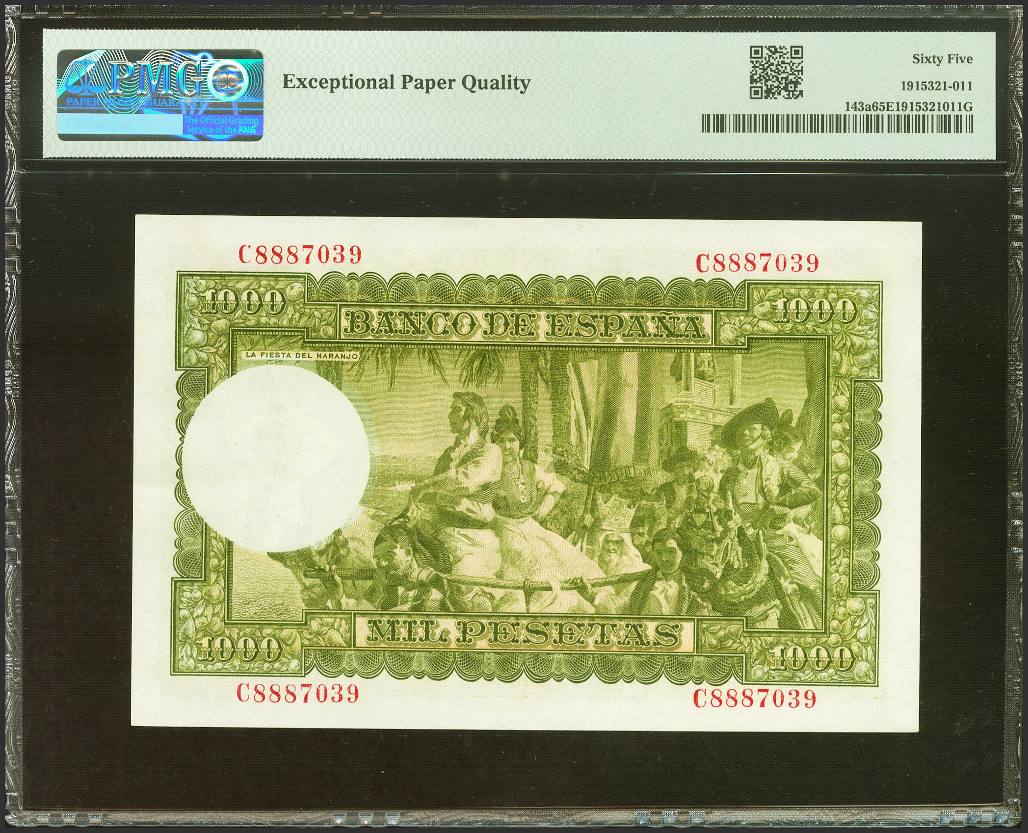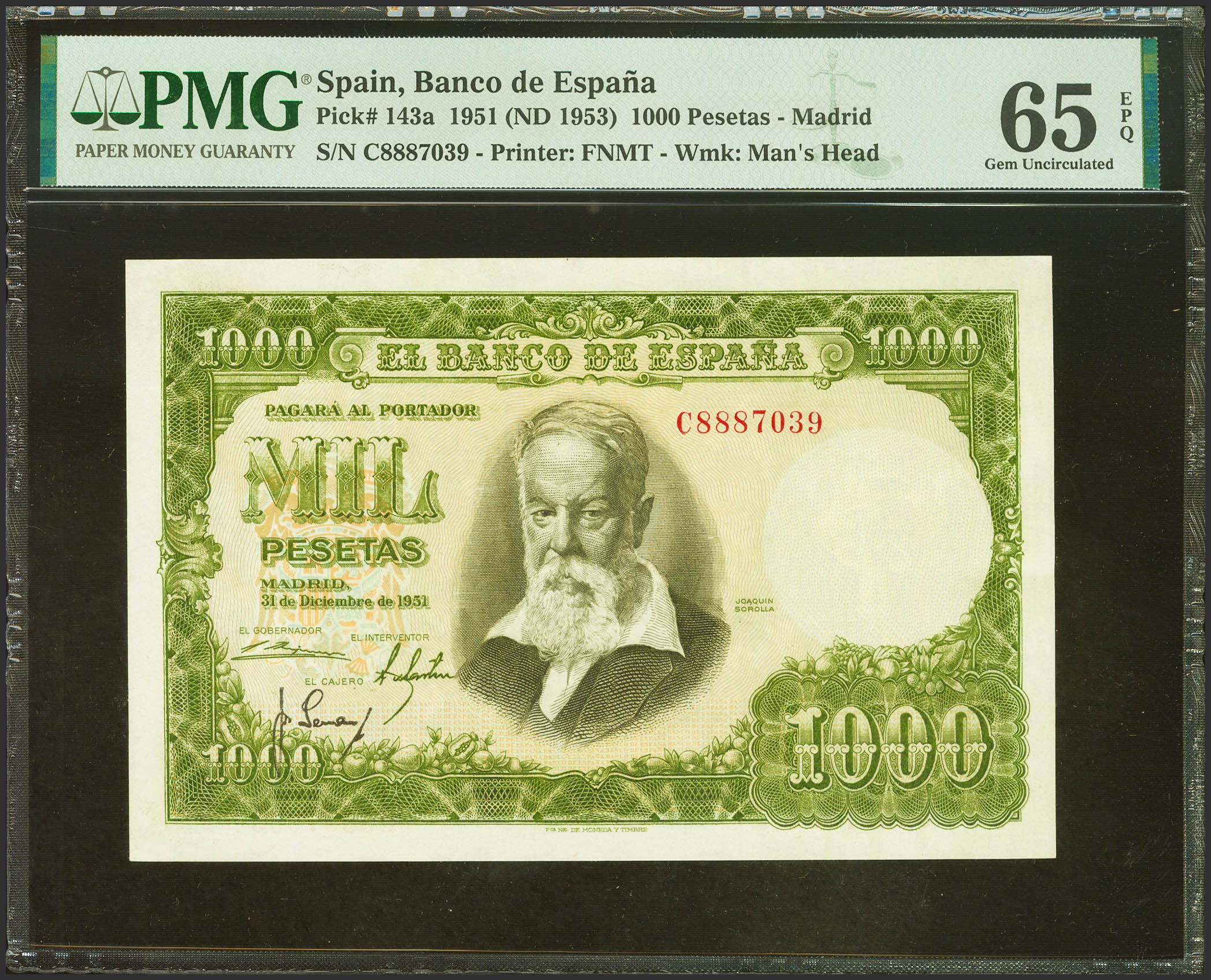 English 1000 Pesetas. December 31, 1951. Series C, last series issued. (Edifil 2023: 463b, Pick: 143a). Rare in this exceptional quality, original finish. Uncirculated. Encapsulated PMG65EPQ.