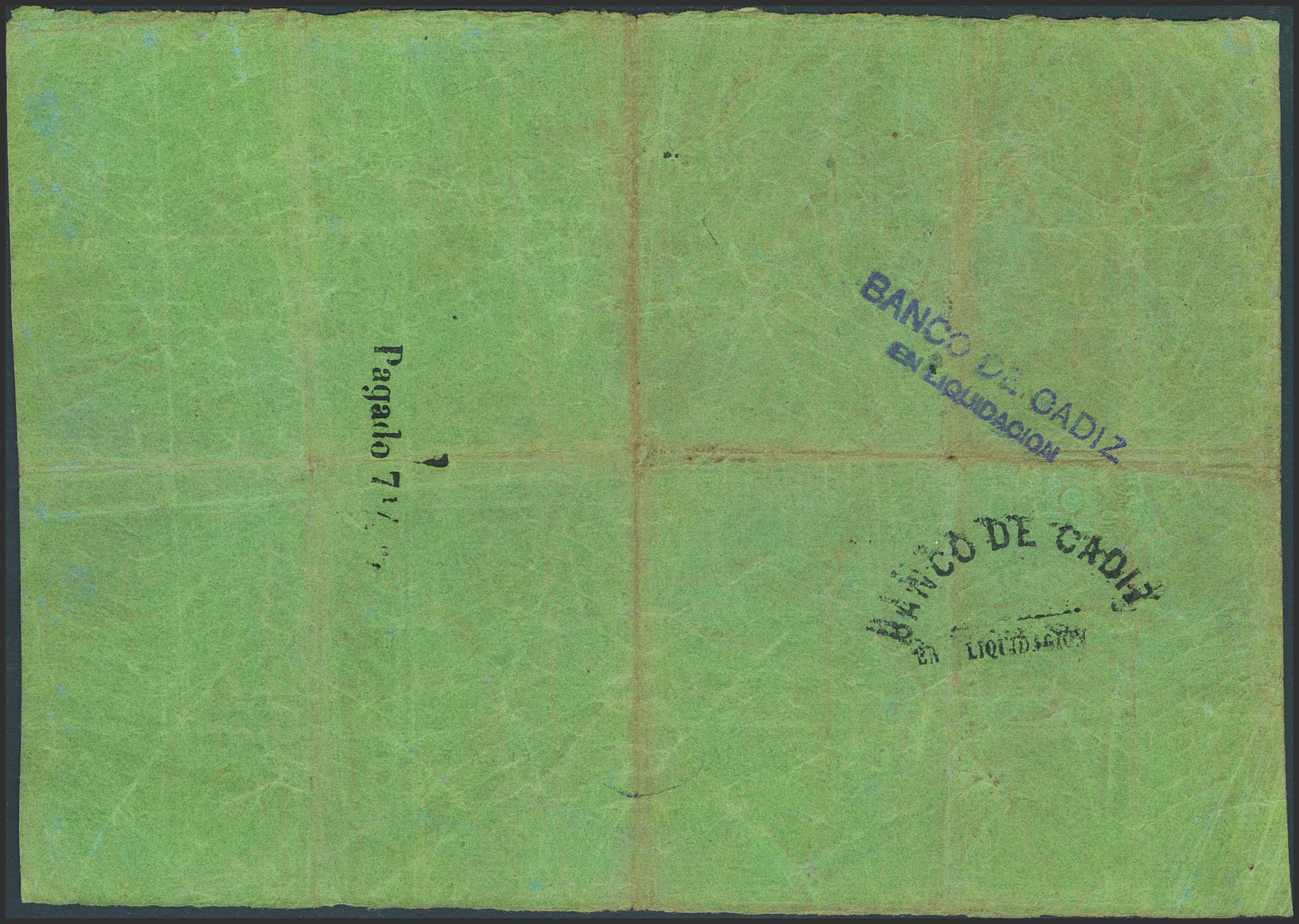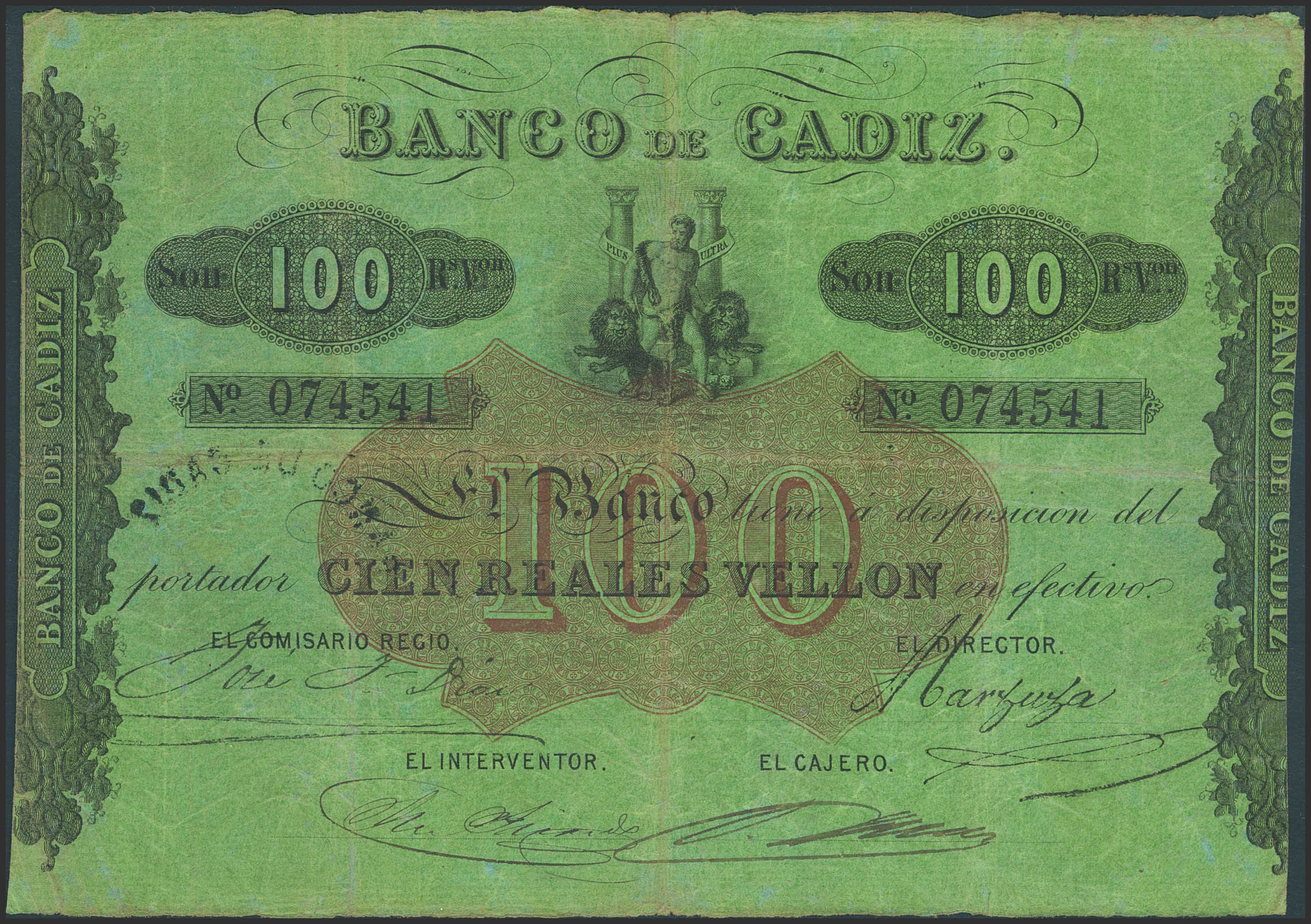 BANCO DE CADIZ. Issue III. 100 Reales (undated). Four signatures and dry overprint. (Edifil 2023: 78). Rare, usual erosions accompanying the folds. VF+.