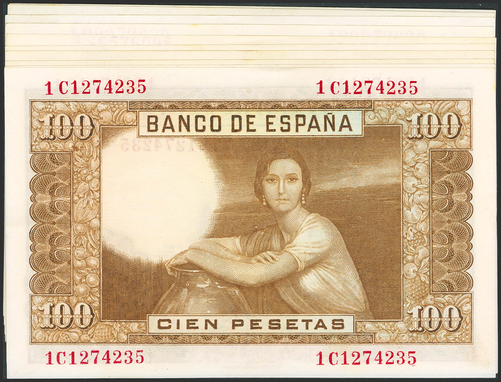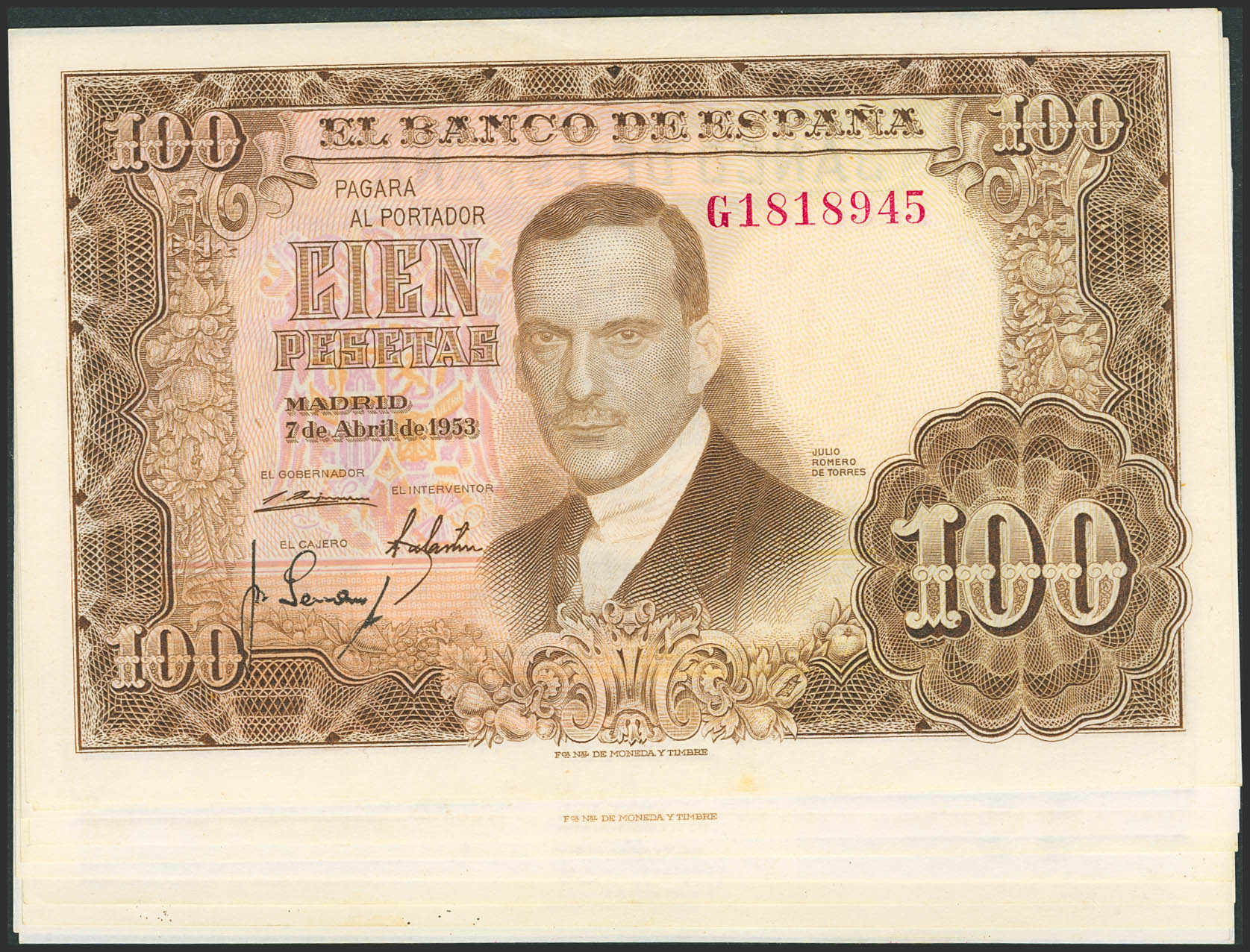 Set of 10 100 Pesetas banknotes, most of them consecutive, issued on April 7, 1953, with the series G, 1A, 1C, 1P, 1S and 1X, respectively (Edifil 2023: 464b, 464c). Uncirculated/Extremely Fine.
