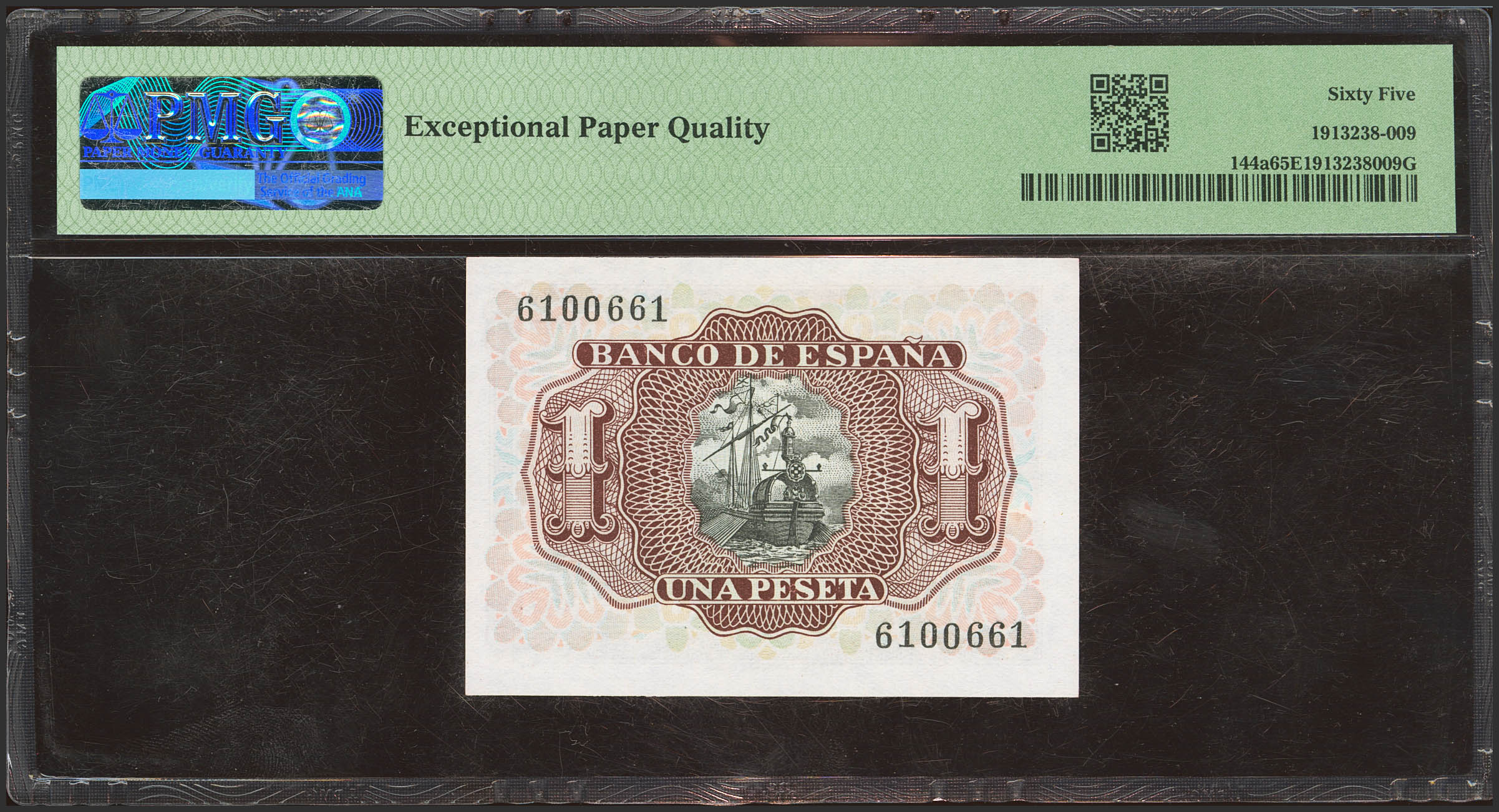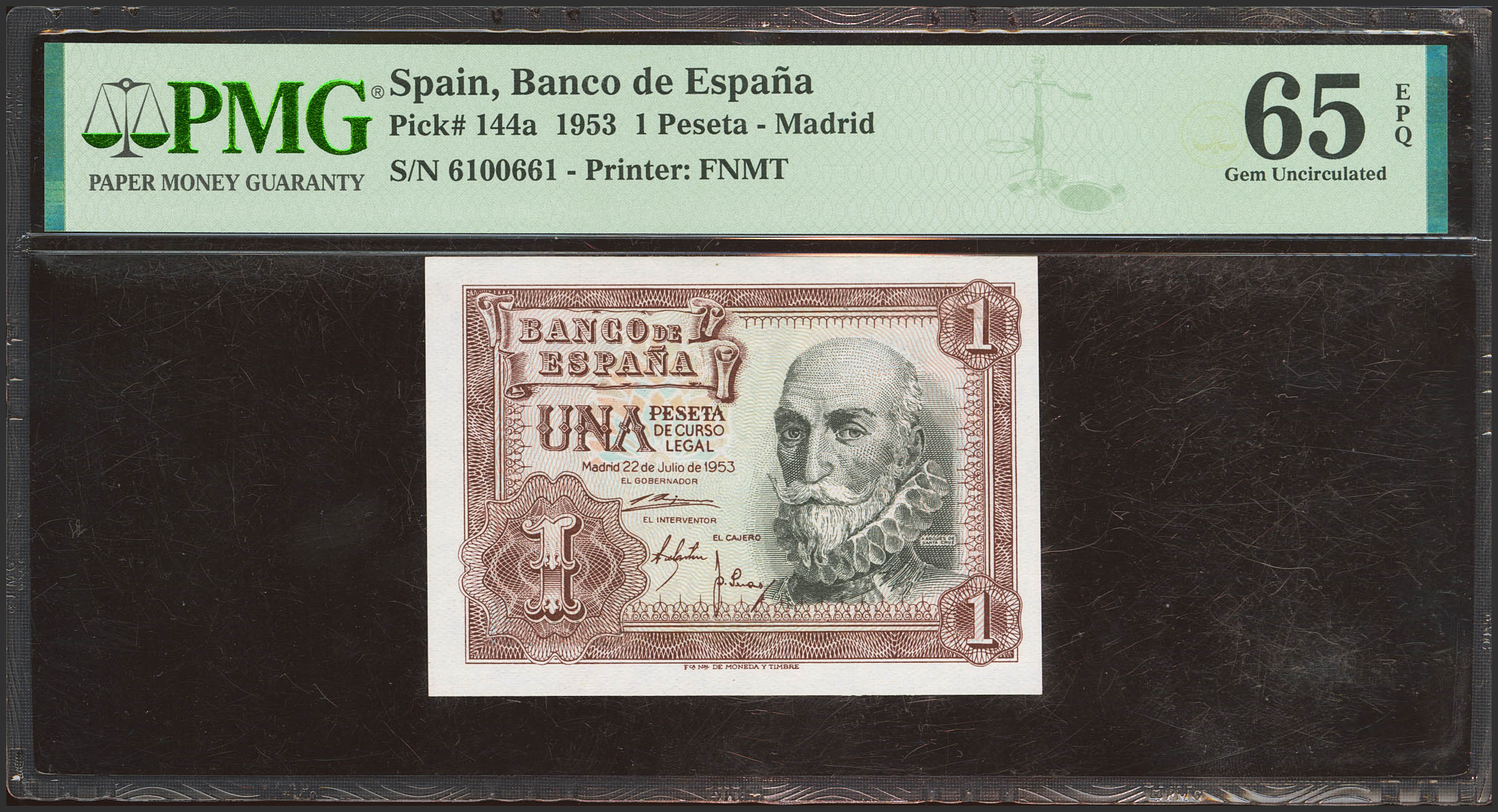 1 Peseta. July 22, 1953. No series. (Edifil 2023: 465, Pick: 144a). Rare in this quality, original finish. Uncirculated. Encapsulated PMG65EPQ.