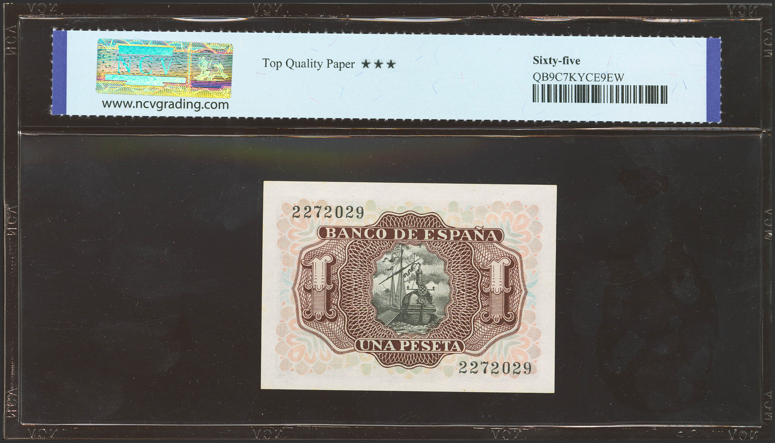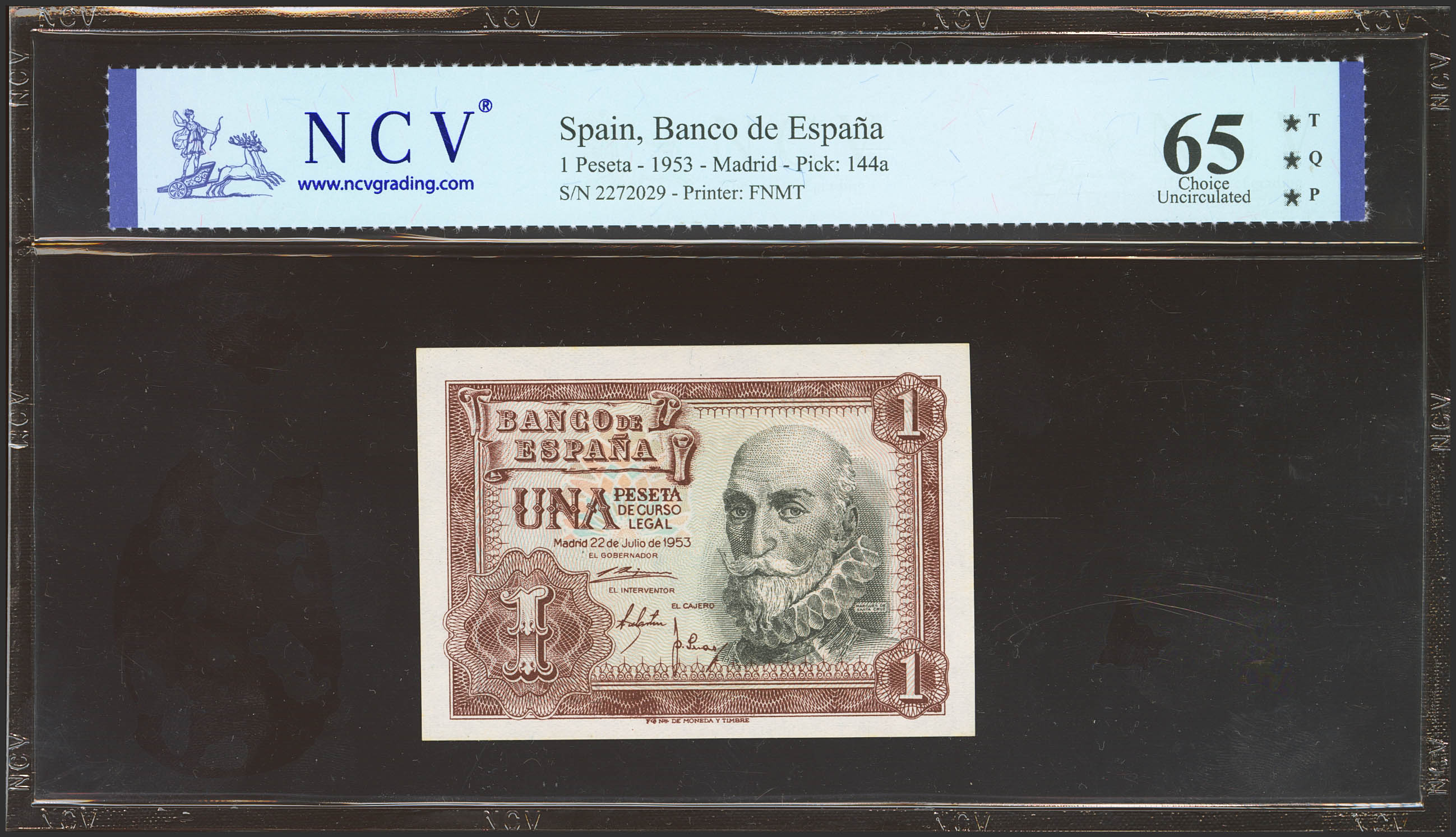 1 Peseta. July 22, 1953. No series. (Edifil 2023: 465, Pick: 144a). Original marking. Uncirculated. Encapsulated NCV65TQP.