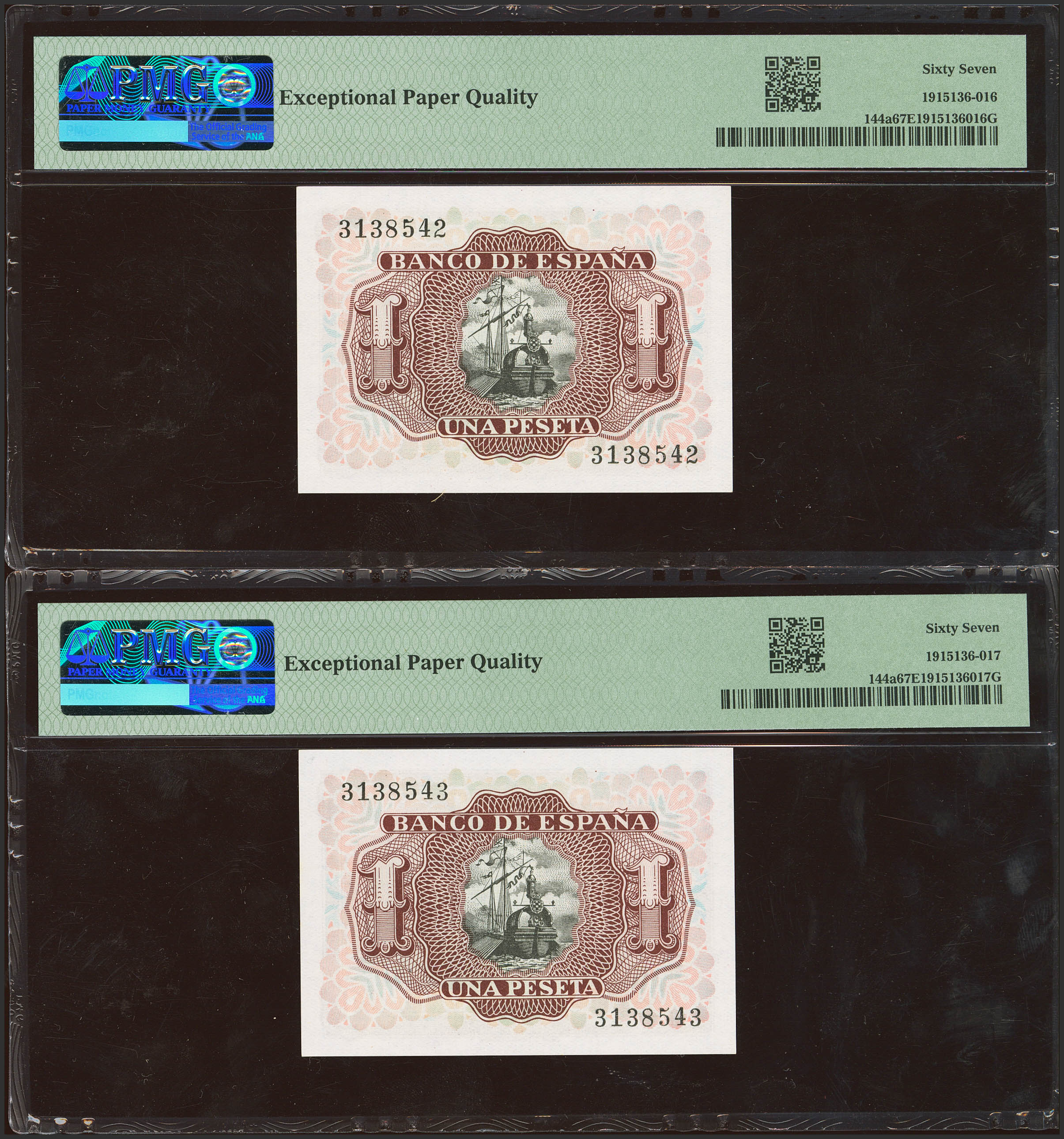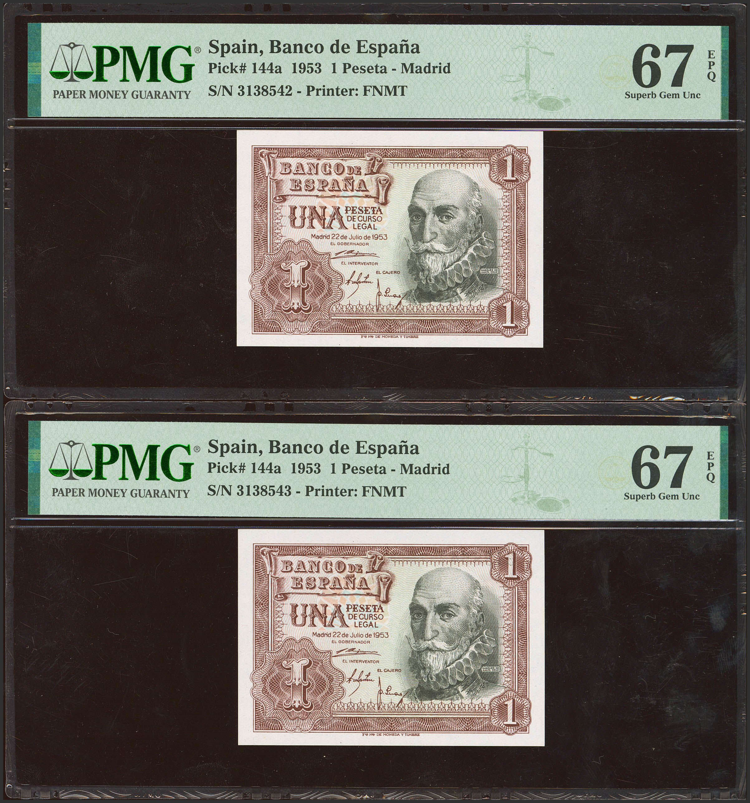 1 Peseta. July 22, 1953. Correlative pair. No series. (Edifil 2023: 465, Pick: 144a). Unusual in this quality, original finish. Uncirculated. Encapsulated PMG67EPQ, both.