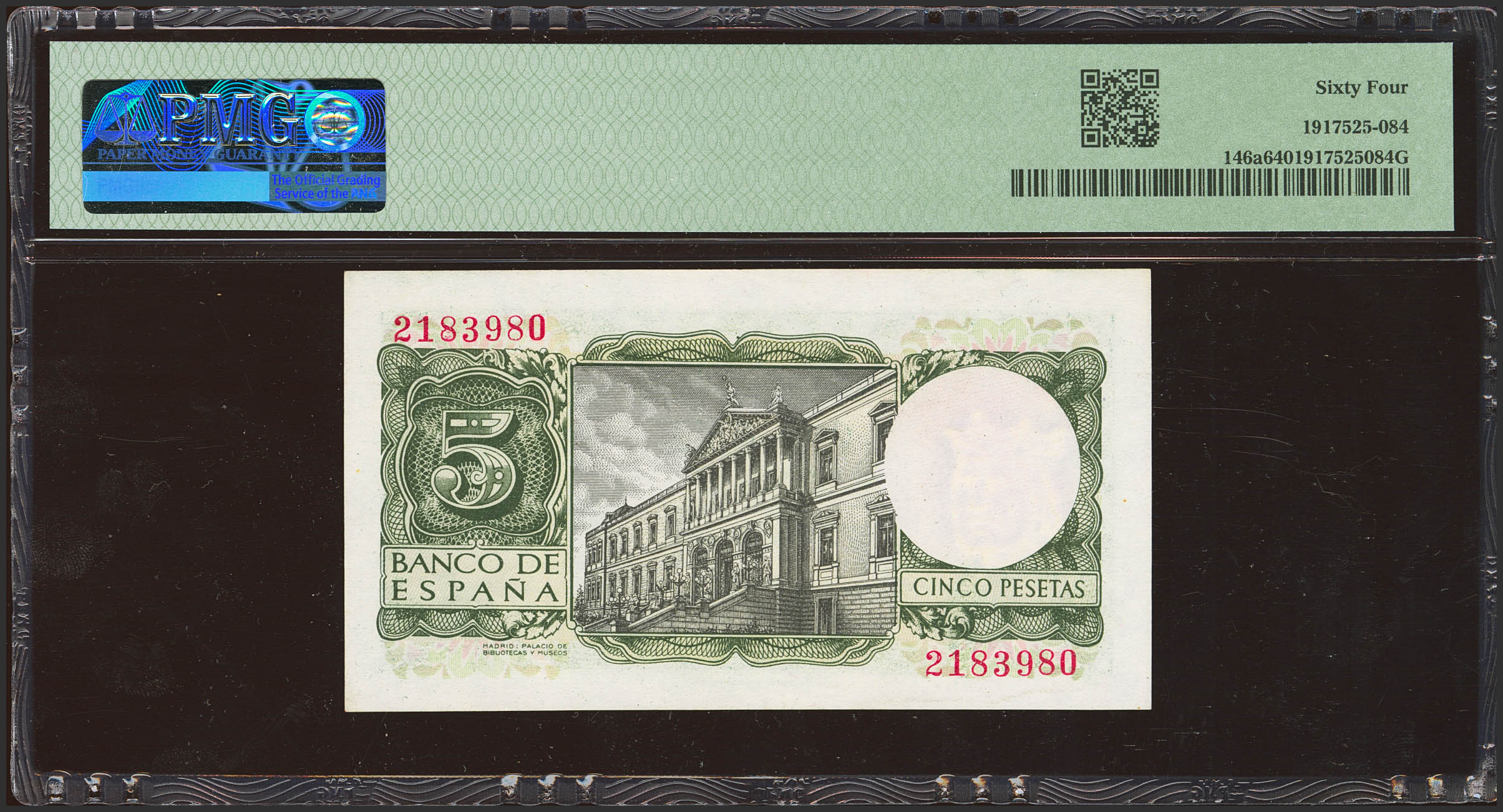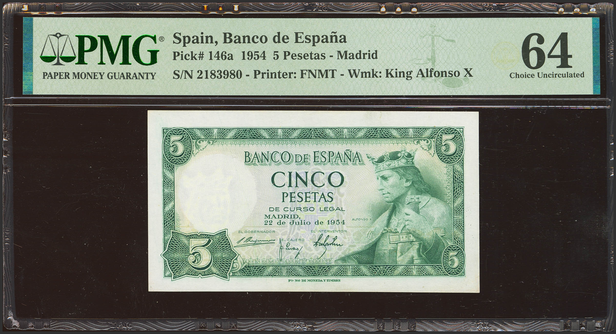 5 Pesetas. July 22, 1954. No series. (Edifil 2023: 466, Pick: 146a). Uncirculated. Encapsulated PMG64.