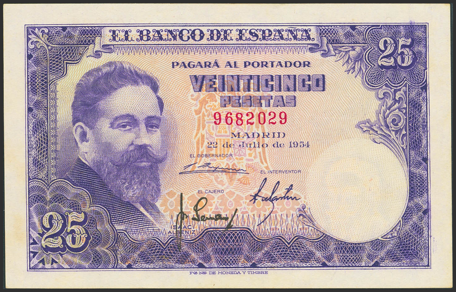 25 Pesetas. July 22, 1954. No series. (Edifil 2021: 467). It retains much of the original finish. Extremely Fine.