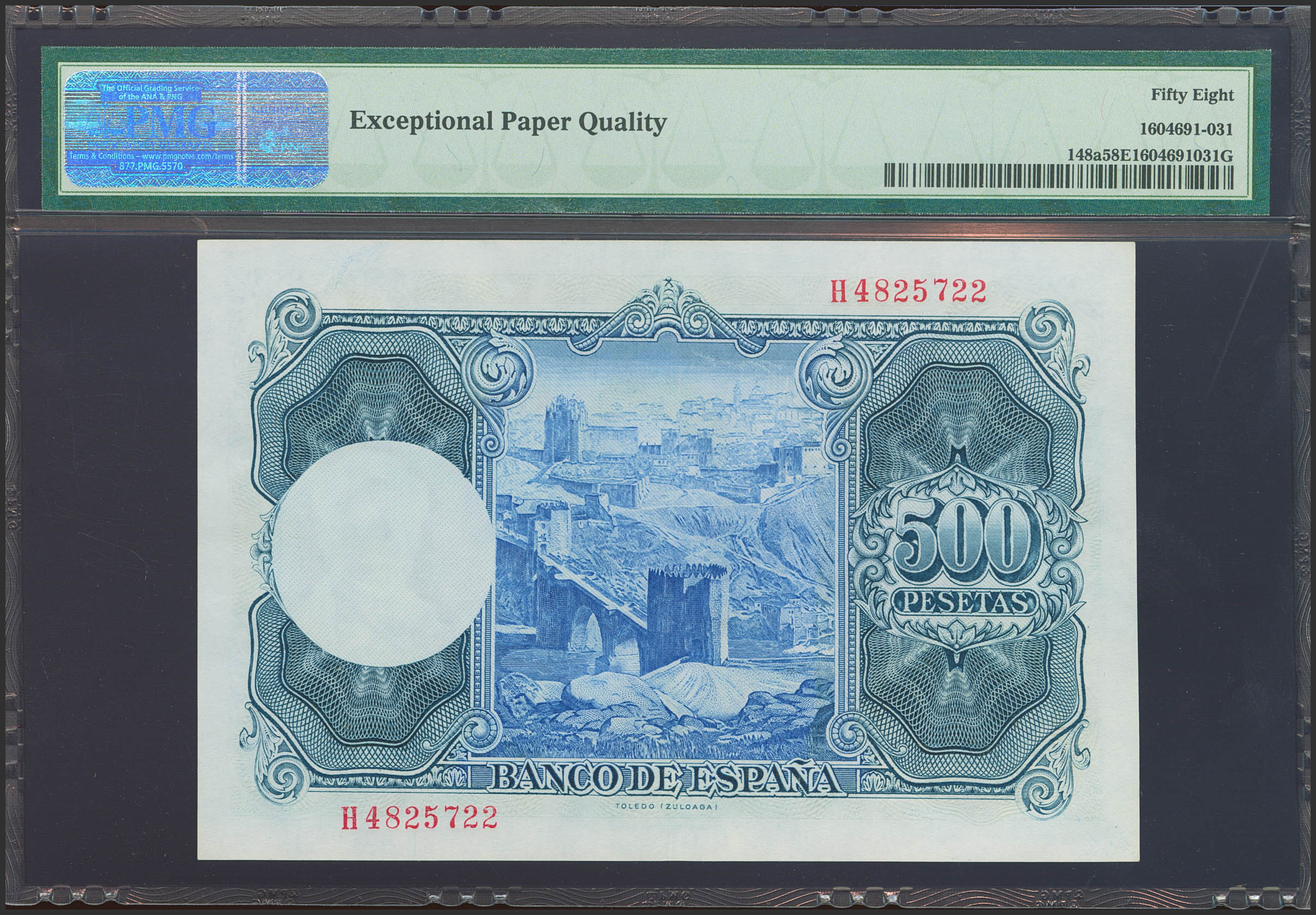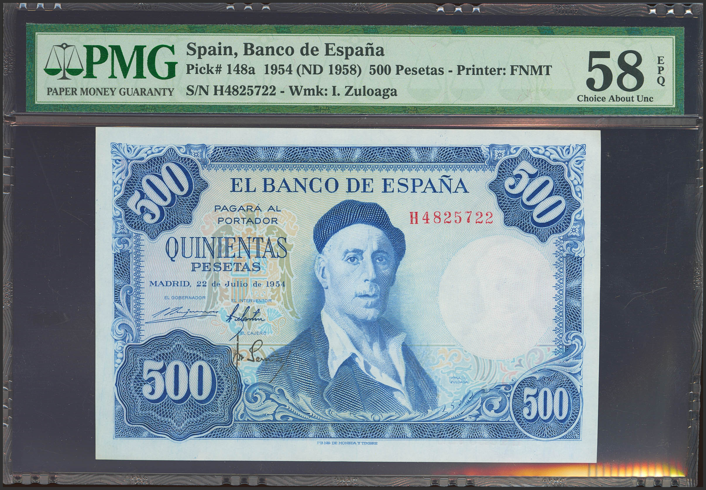 500 Pesetas. July 22, 1954. Series H. (Edifil 2021: 468b, Pick: 148a). Original size. Good Extremely Fine++. Encapsulated PMG58EPQ.