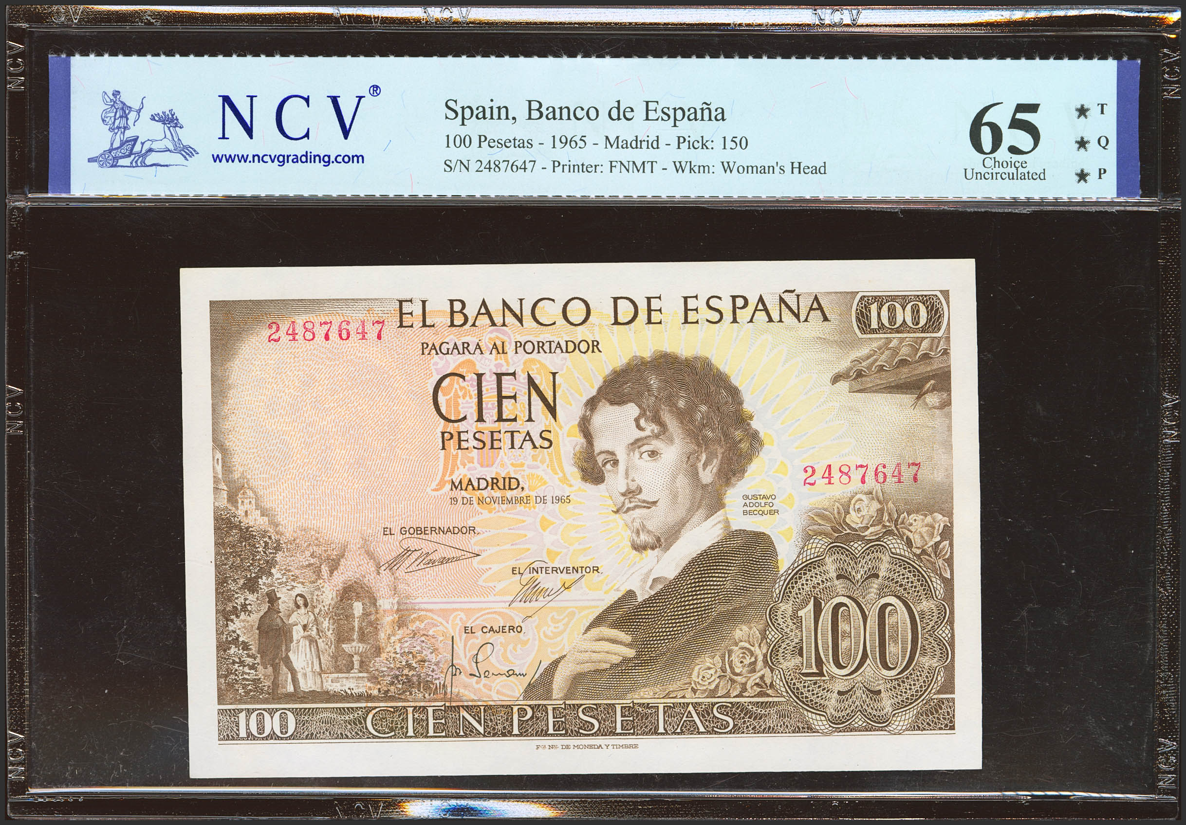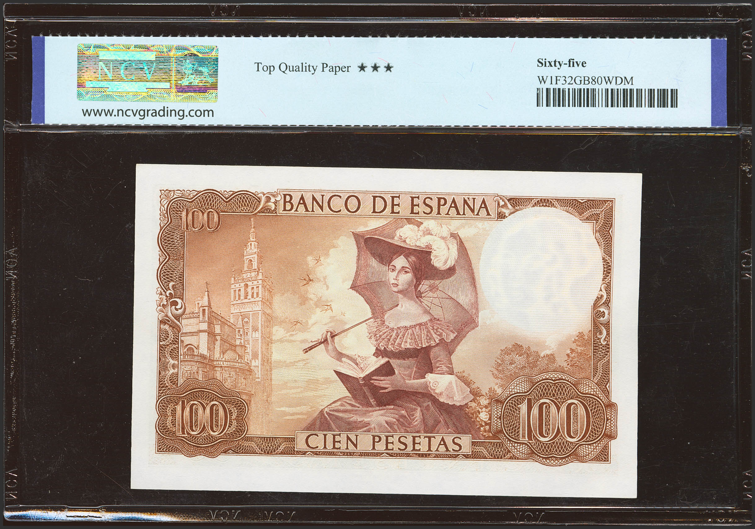 100 Pesetas. November 19, 1965. No series. (Edifil 2023: 470, Pick: 150). Rare, original marking. Uncirculated. Encapsulated NCV65TQP.