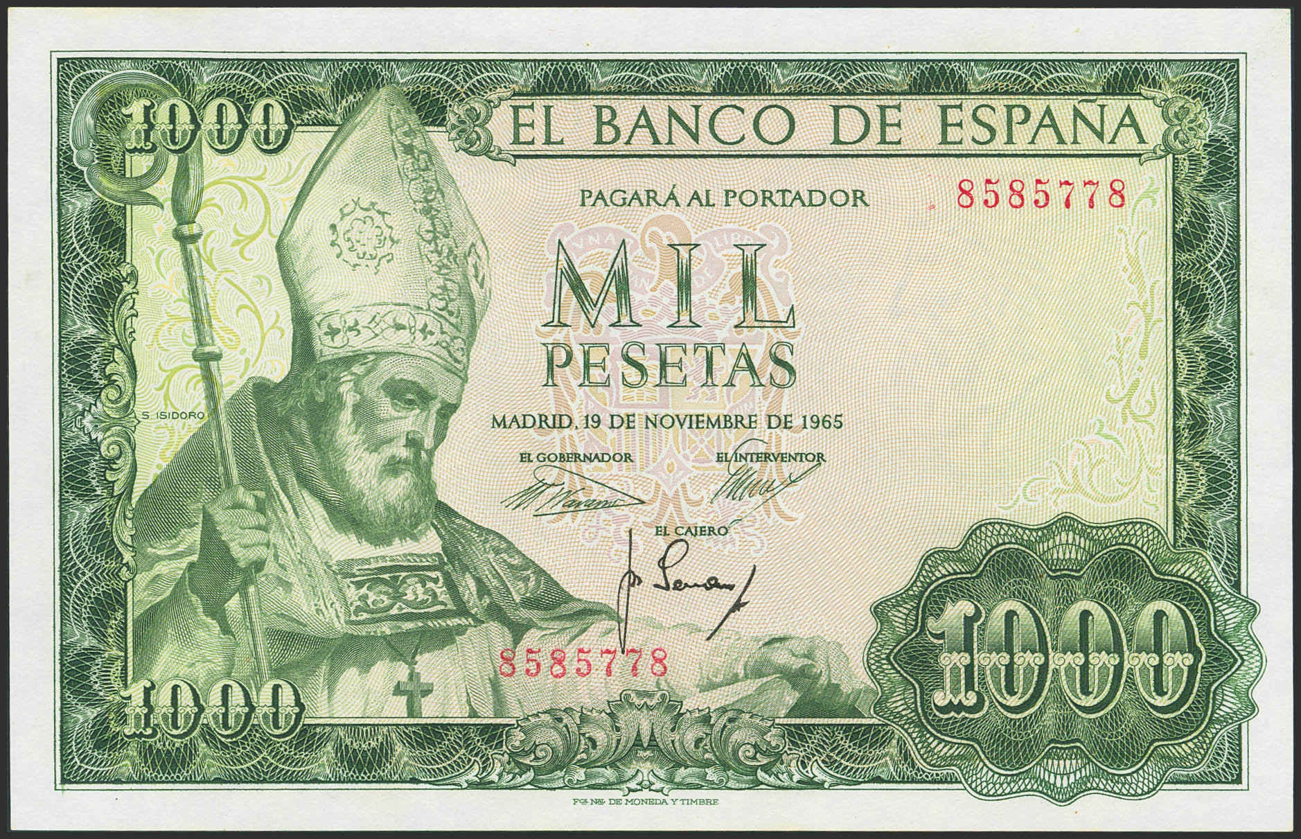 1000 Pesetas. November 19, 1965. No series. (Edifil 2023: 471). Retains much of the original finish. Good Extremely Fine++.