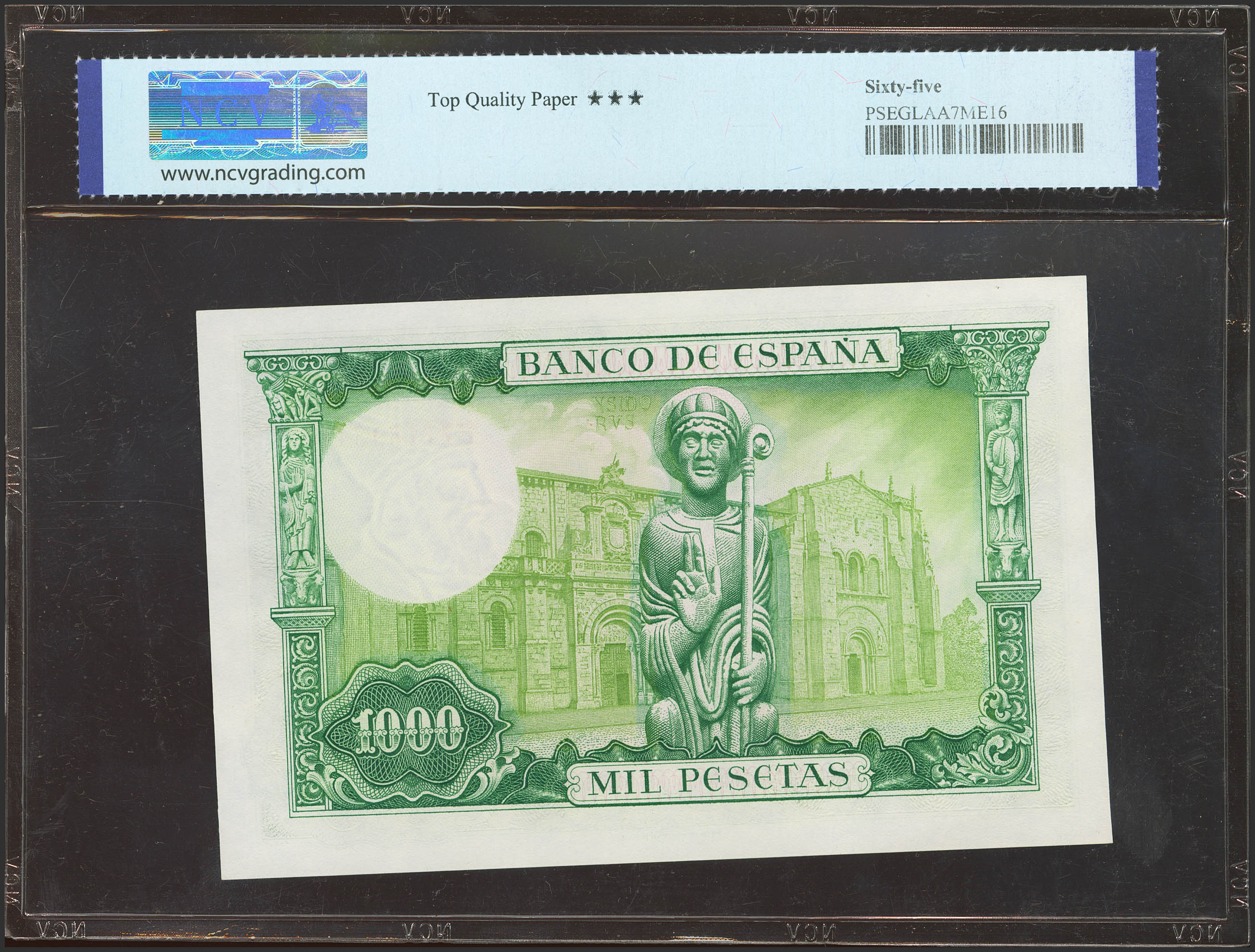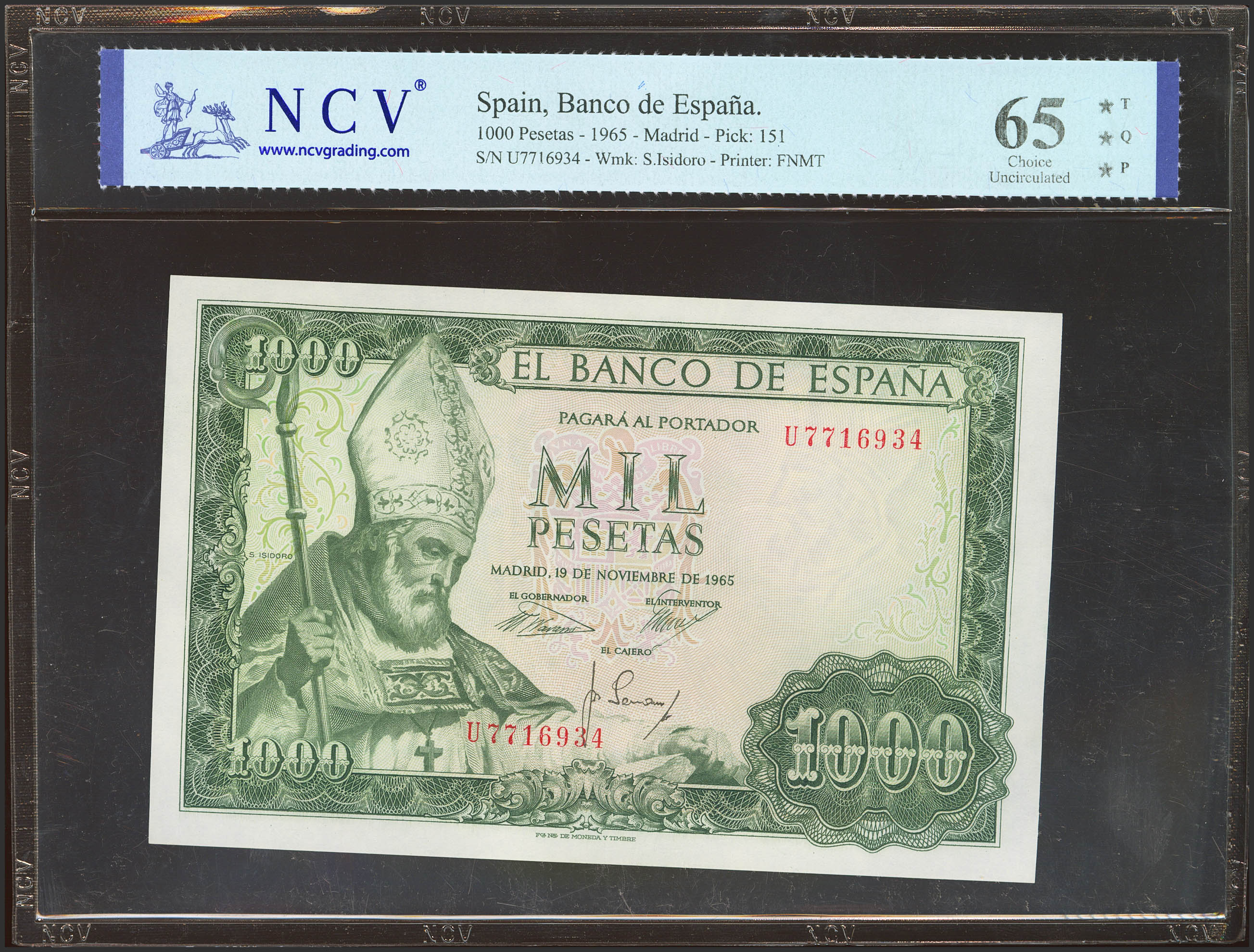 1000 Pesetas. November 19, 1965. Series U. (Edifil 2023: 471b, Pick: 151). Original size. Uncirculated. Encapsulated NCV65TQP.