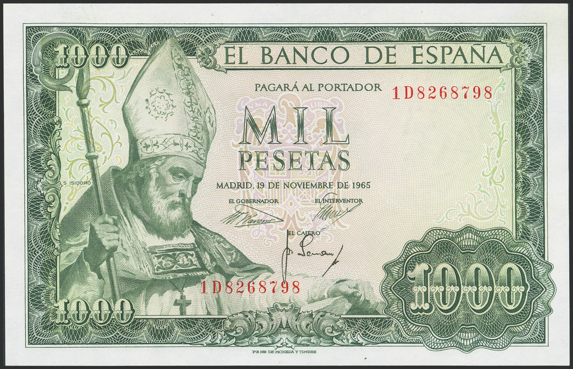 1000 Pesetas. November 19, 1965. Series 1D. (Edifil 2023: 471b). It retains all its original appearance. Uncirculated.