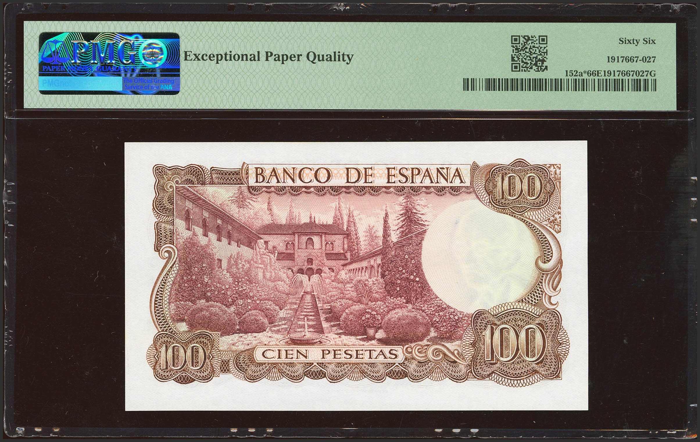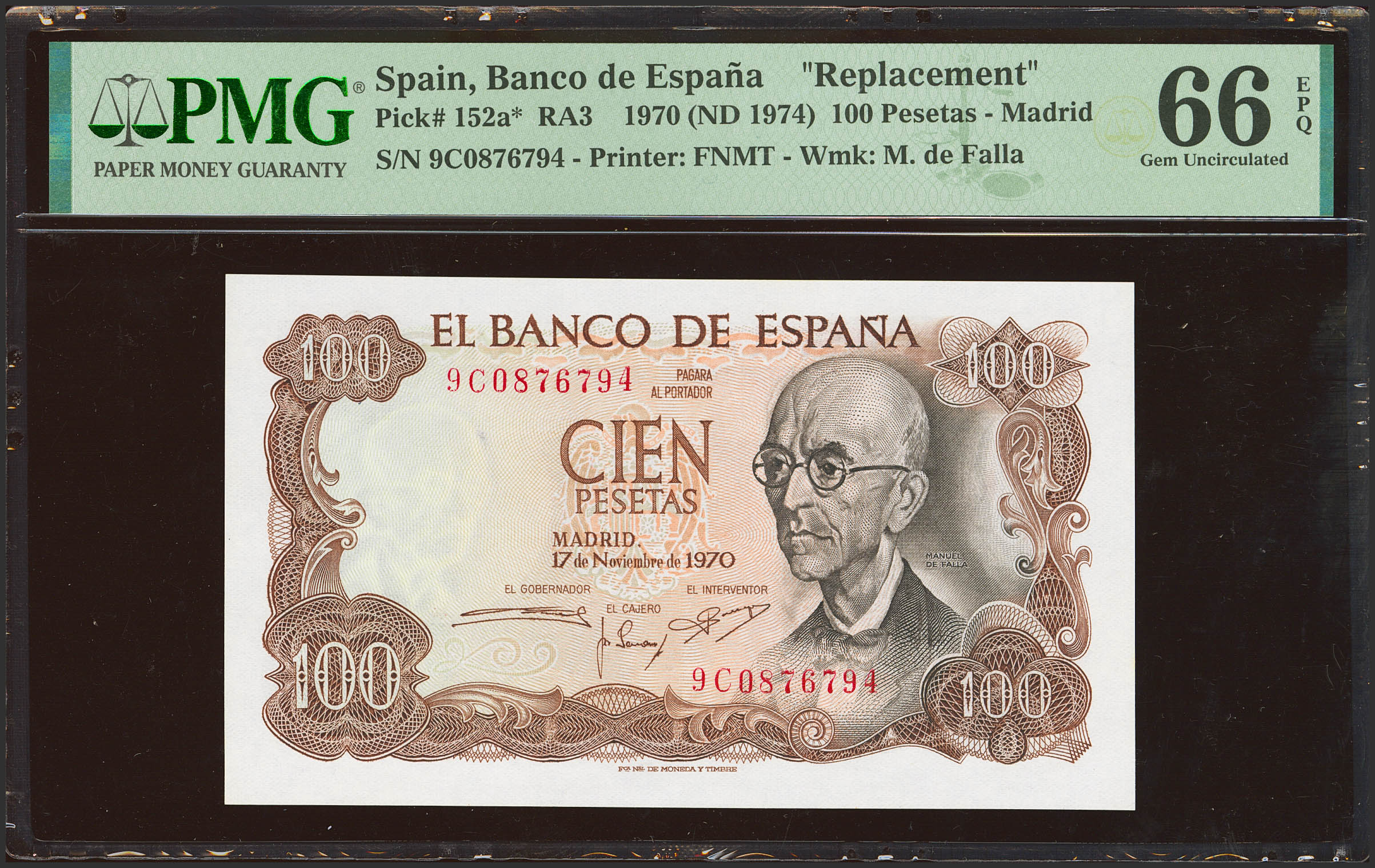 100 Pesetas. November 17, 1970. Special series 9C. (Edifil 2023: 472d, Pick: 152a*). Rare in this quality, original finish. Uncirculated. Encapsulated PMG66EPQ.