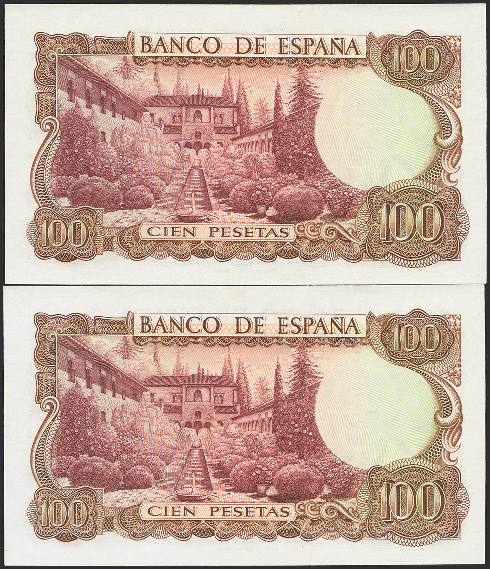 100 Pesetas. November 17, 1970. Correlative pair. Series 7W, last series issued. (Edifil 2023: 472c). Uncirculated.
