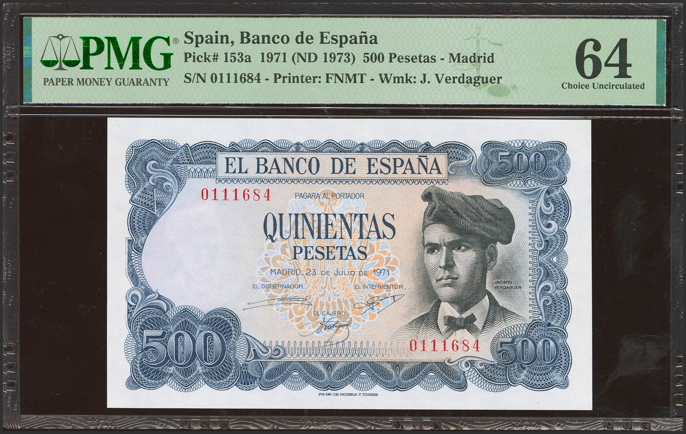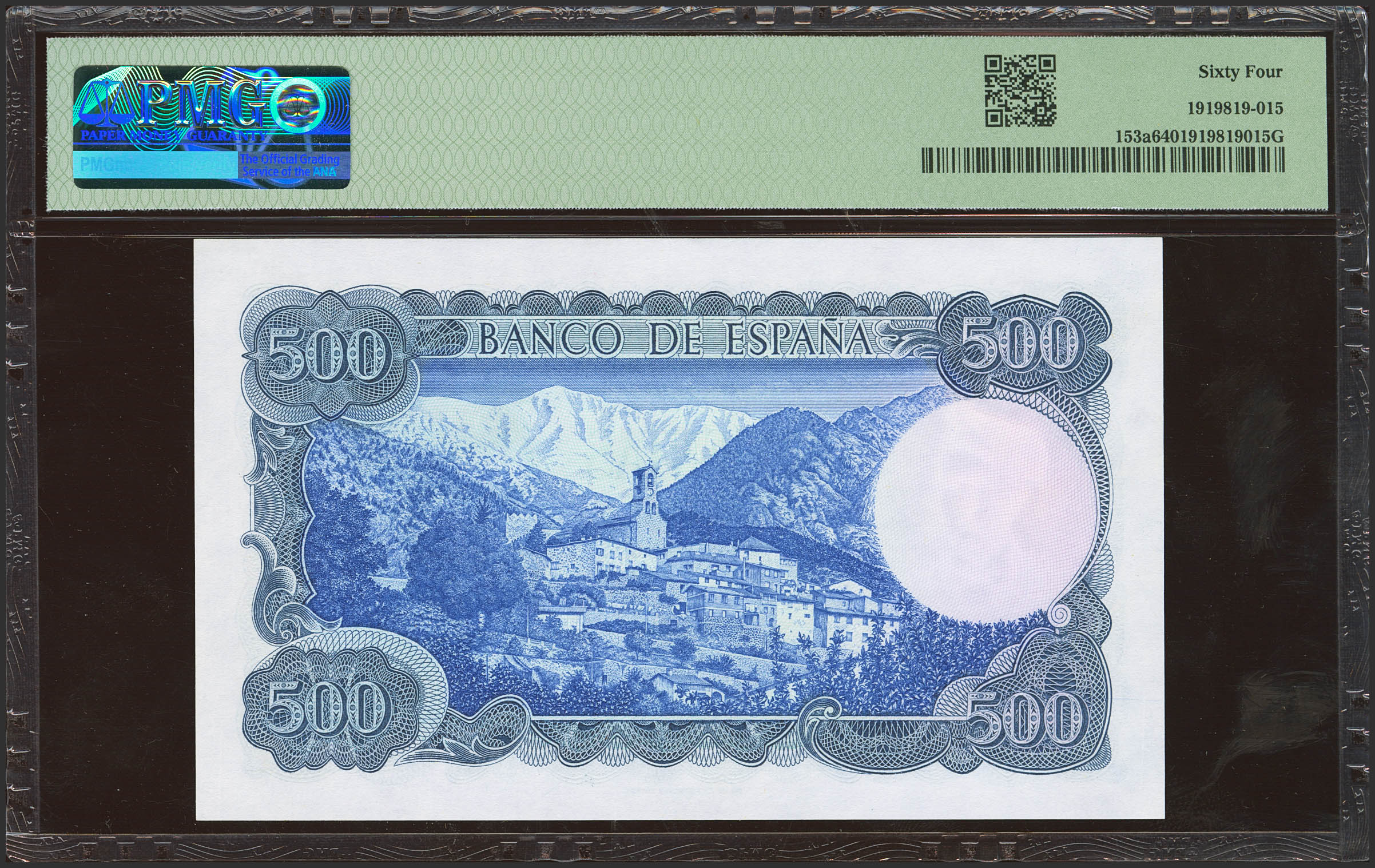 500 Pesetas. July 23, 1971. No series. (Edifil 2023: 473, Pick: 153a). Encapsulated PMG64.