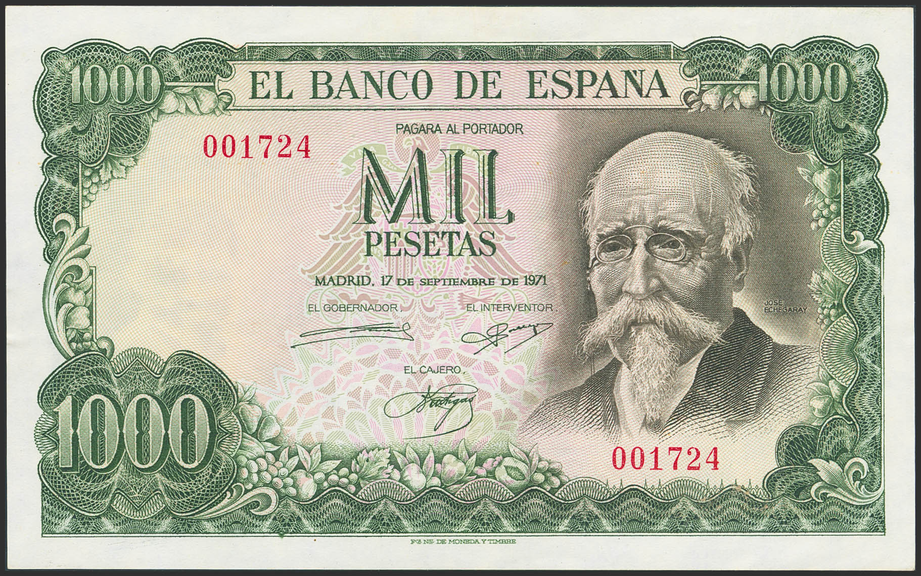 1000 Pesetas. September 17, 1971. Without series and low numbering. (Edifil 2017: 474). Original marking. Uncirculated-.