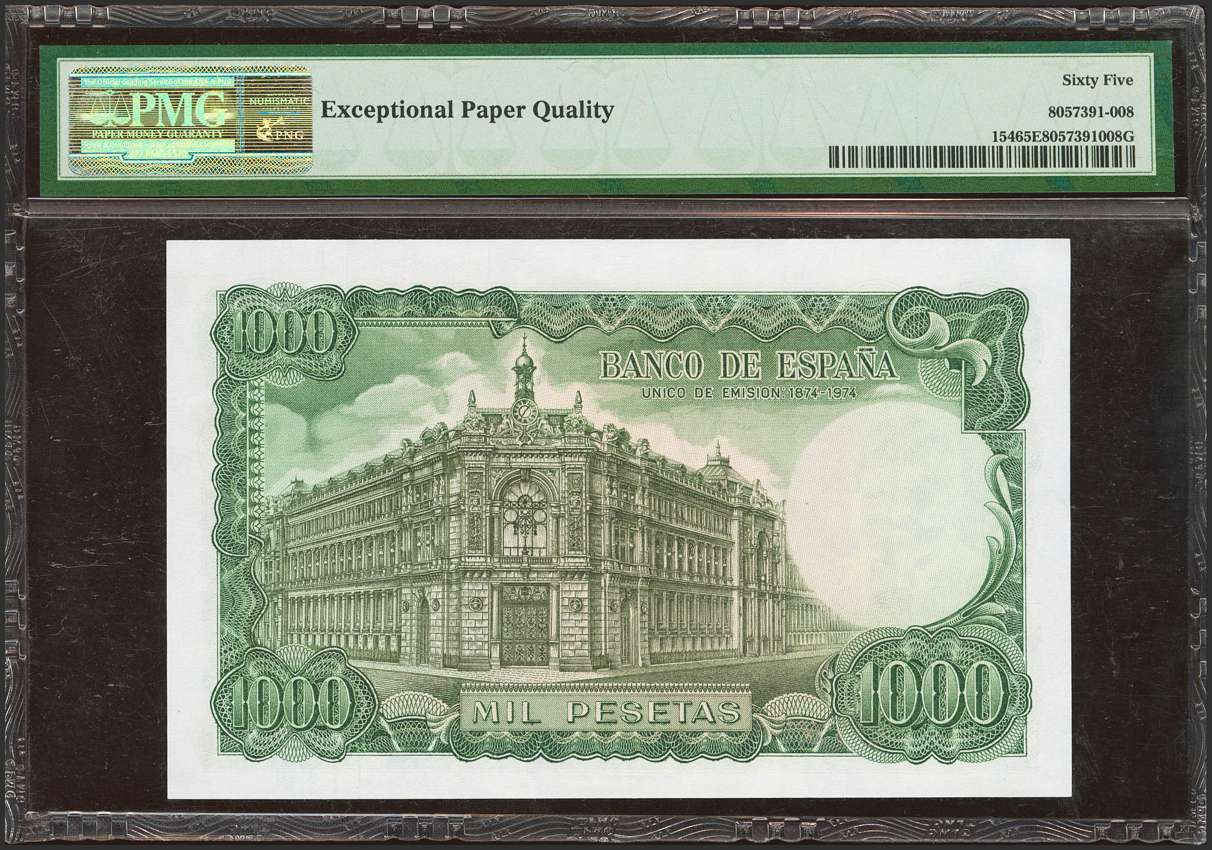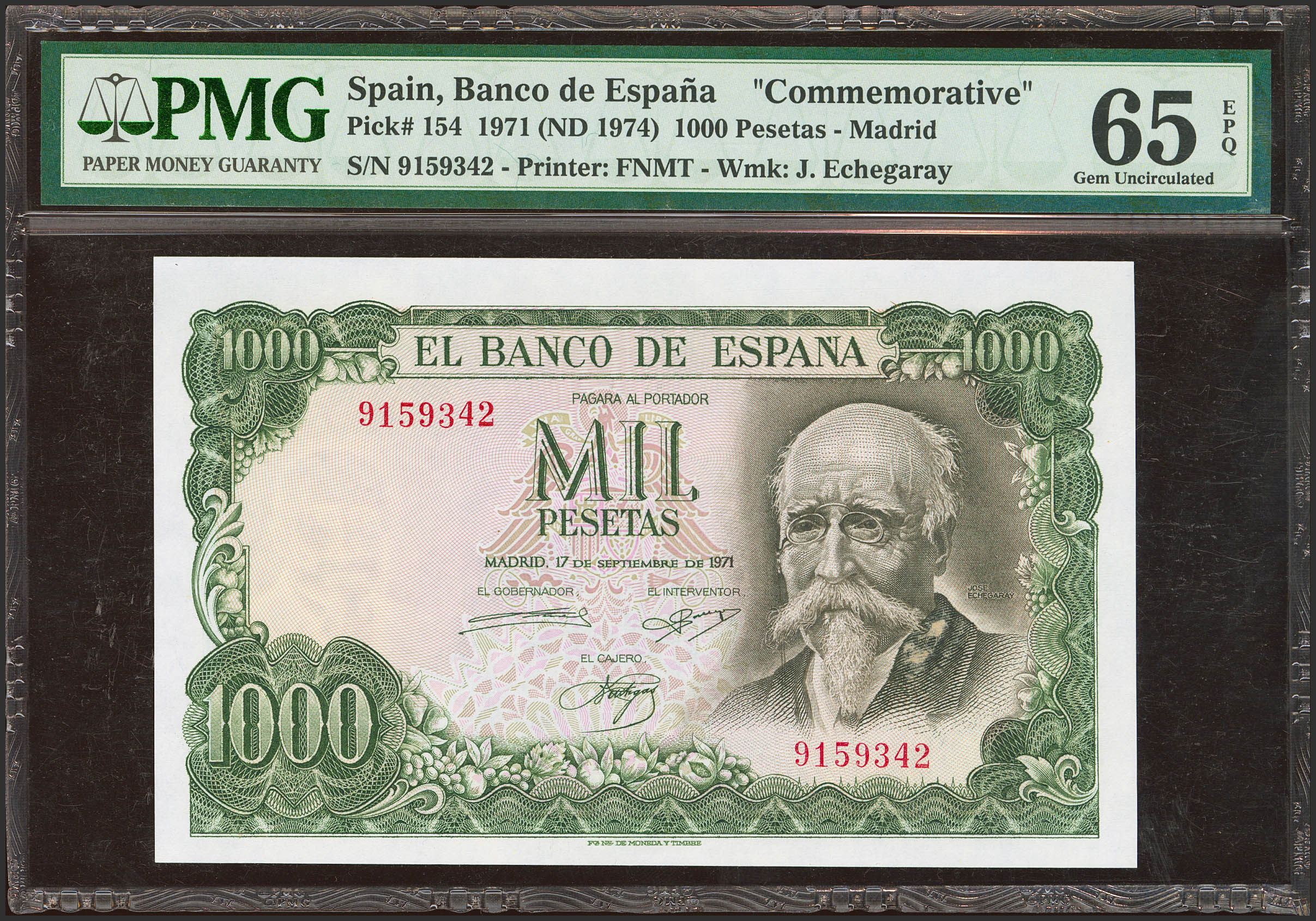 1000 Pesetas. September 17, 1971. No series. (Edifil 2023: 474, Pick: 154). Rare in this quality, original finish. Encapsulated PMG65EPQ.