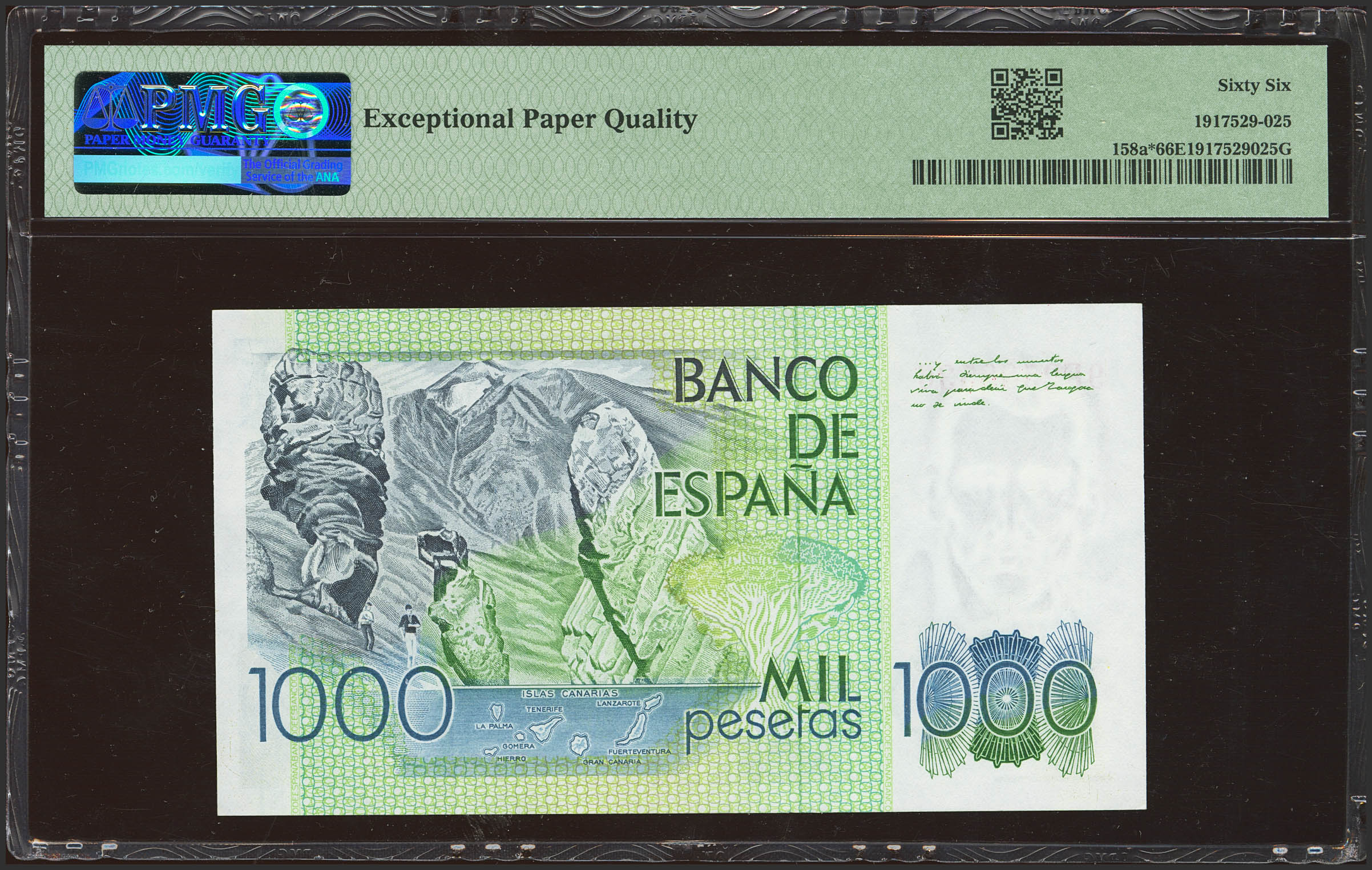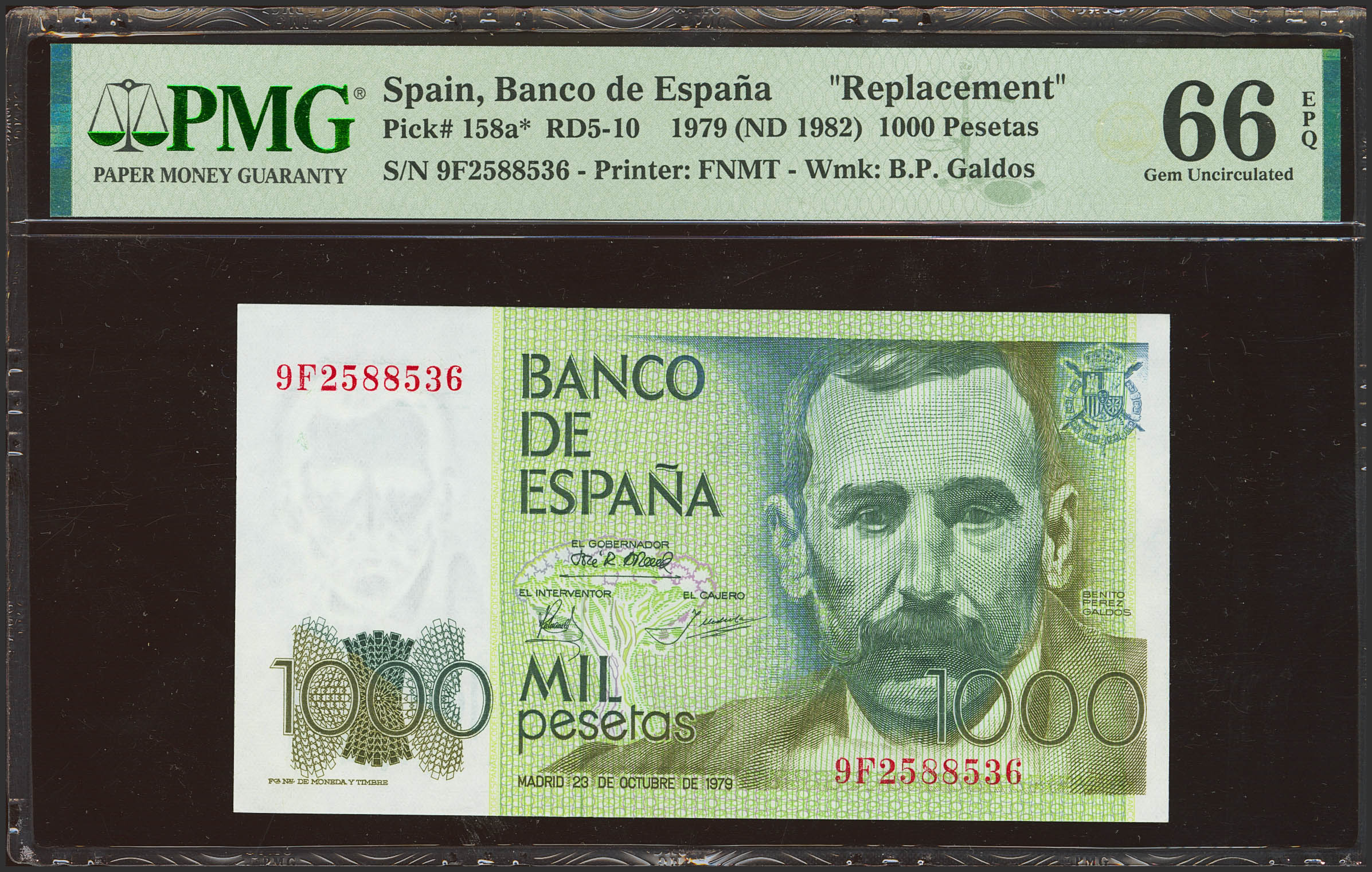 1000 Pesetas. October 23, 1979. Special series 9F. (Edifil 2021: 477b, Pick: 158a*). Very rare series, especially in this exceptional Uncirculated quality. Encapsulated PMG66EPQ.