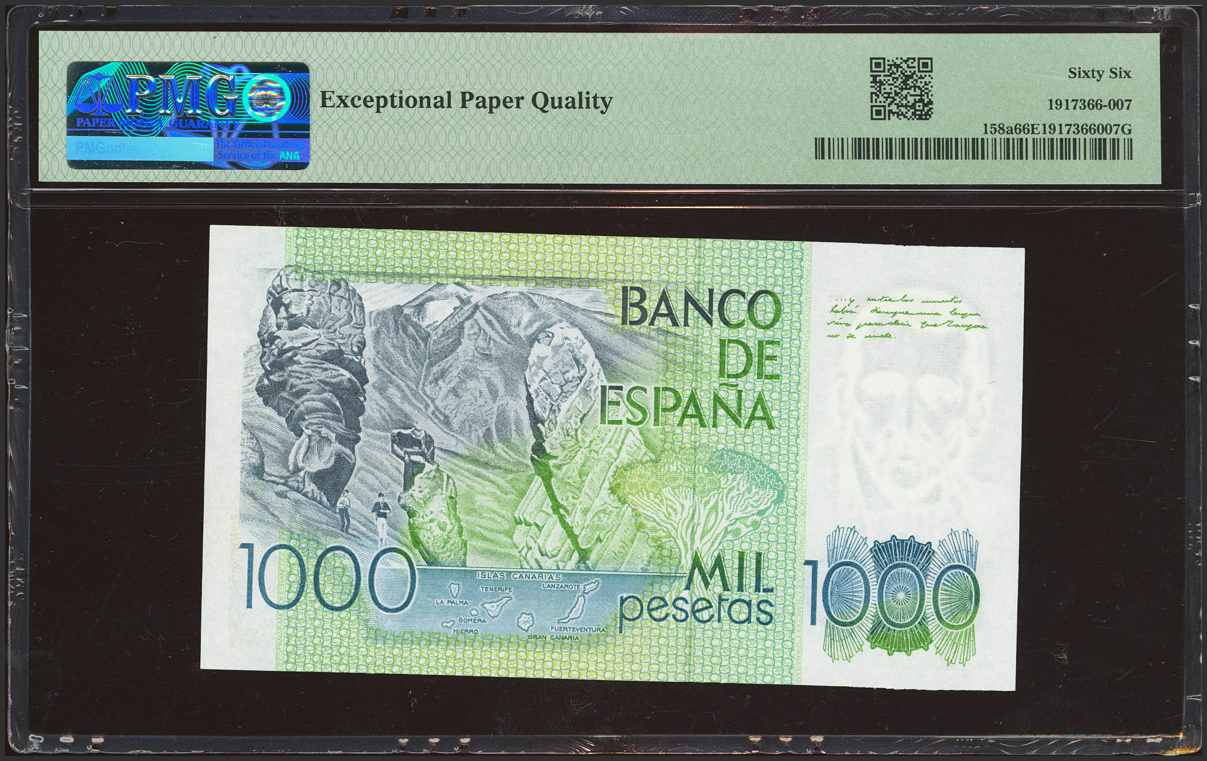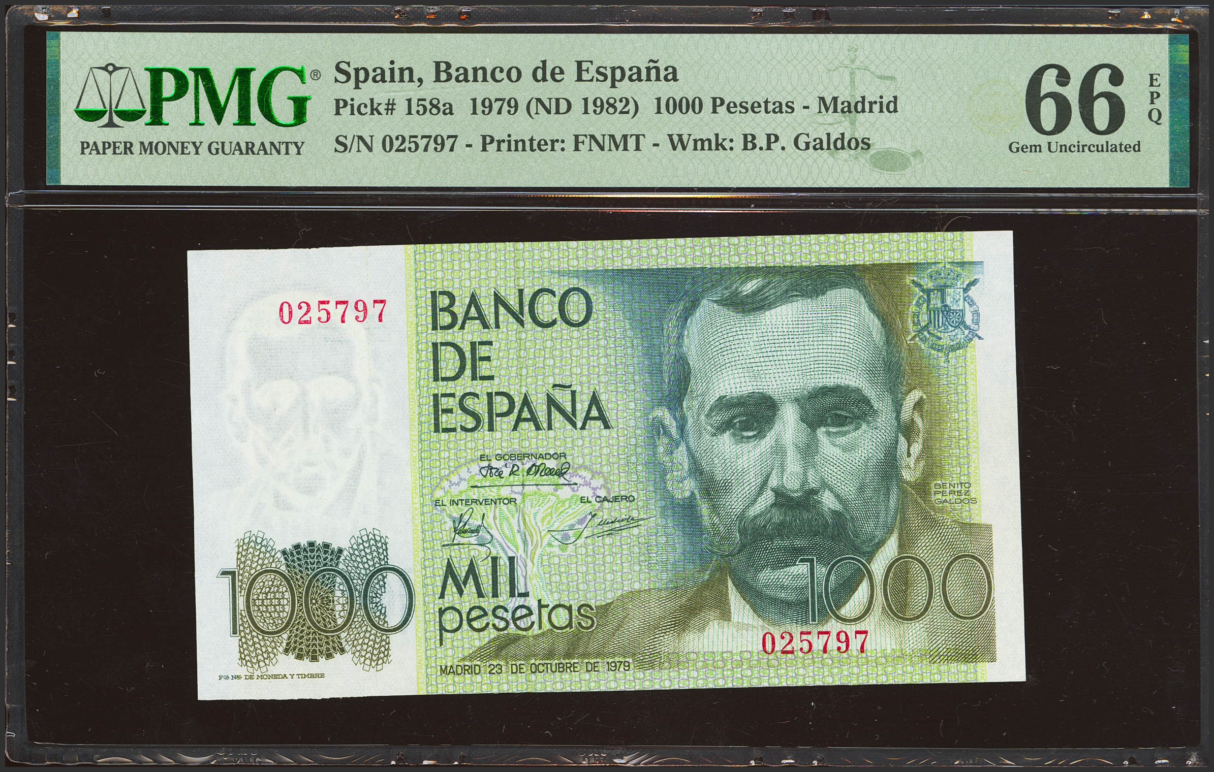 1000 Pesetas. October 23, 1979. No series. (Edifil 2021: 477, Pick: 158a). Rare in this exceptional quality. Uncirculated. Encapsulated PMG66EPQ.