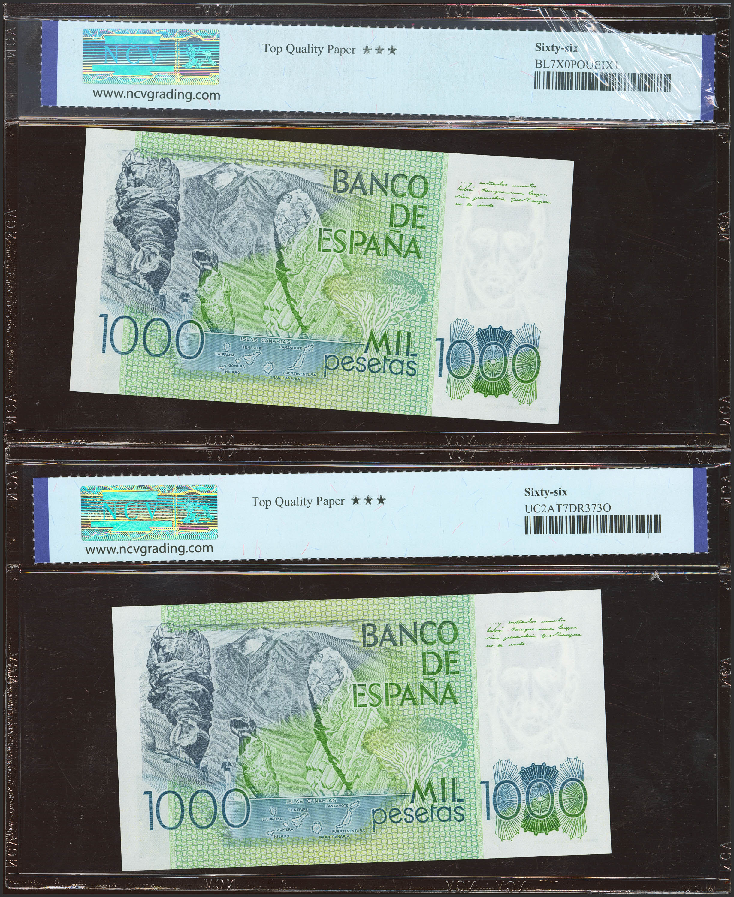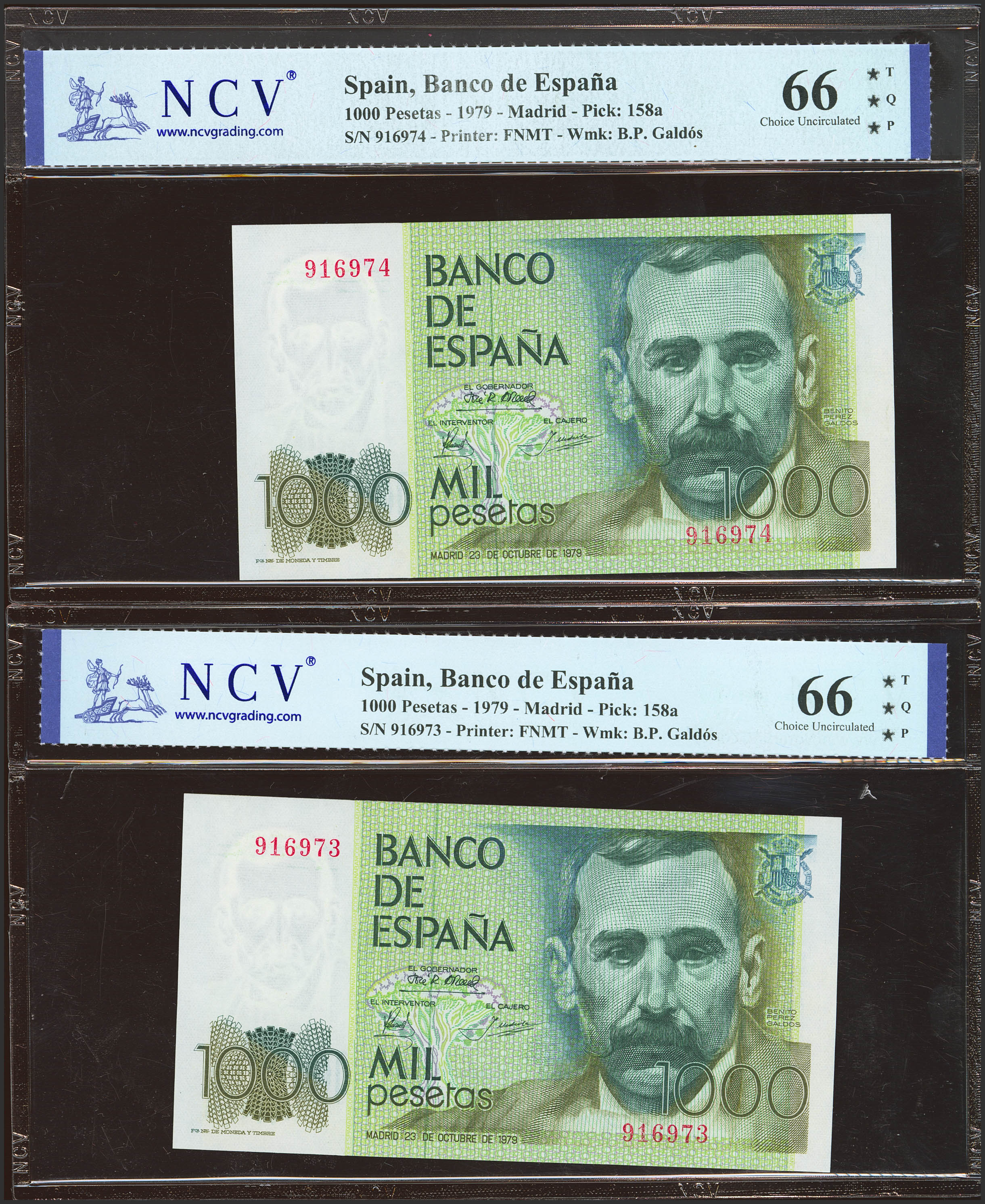 English 1000 Pesetas. October 23, 1979. Correlative pair. No series. (Edifil 2023: 477, Pick: 158a). Uncirculated. Encapsulated NCV66TQP, both.