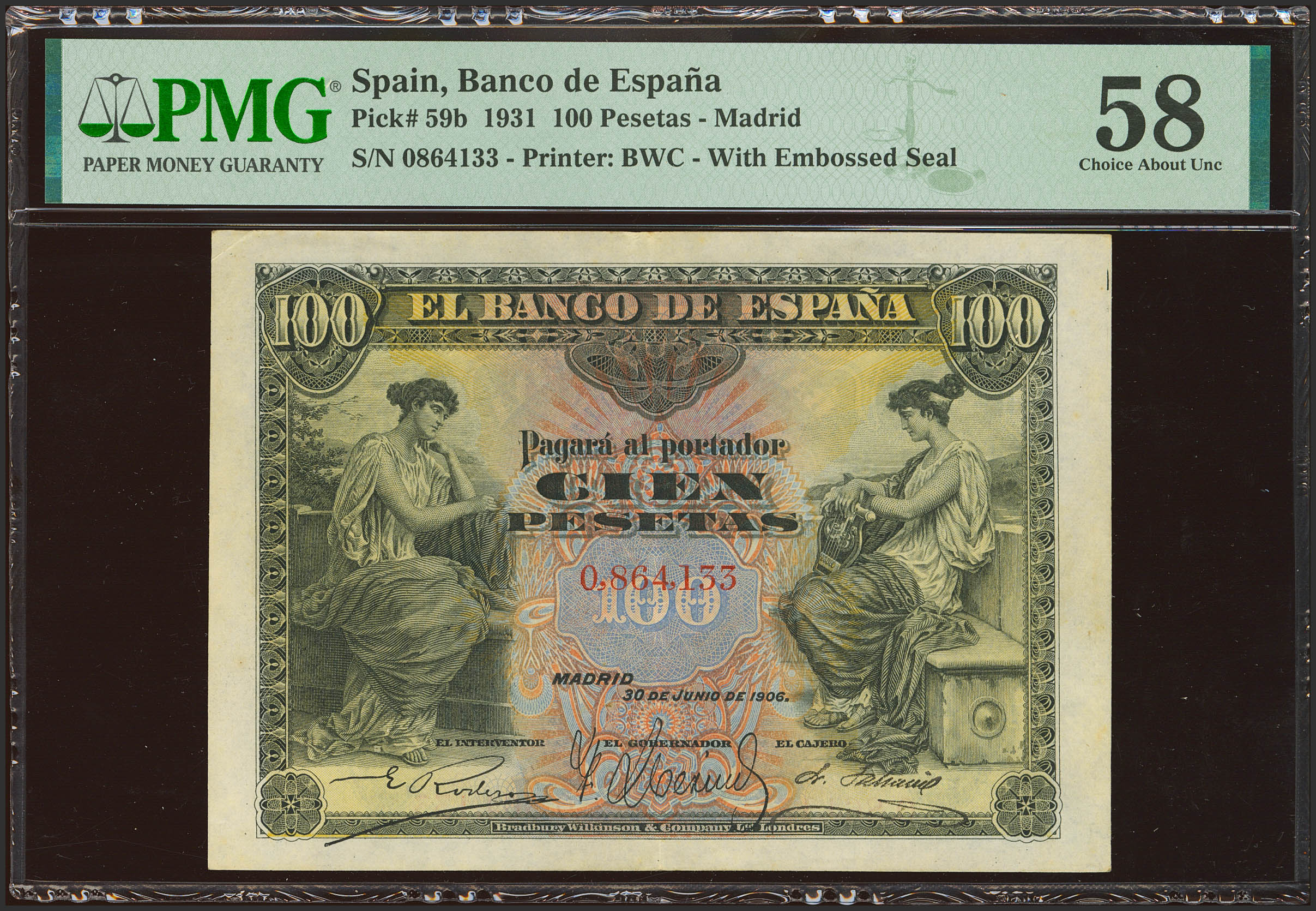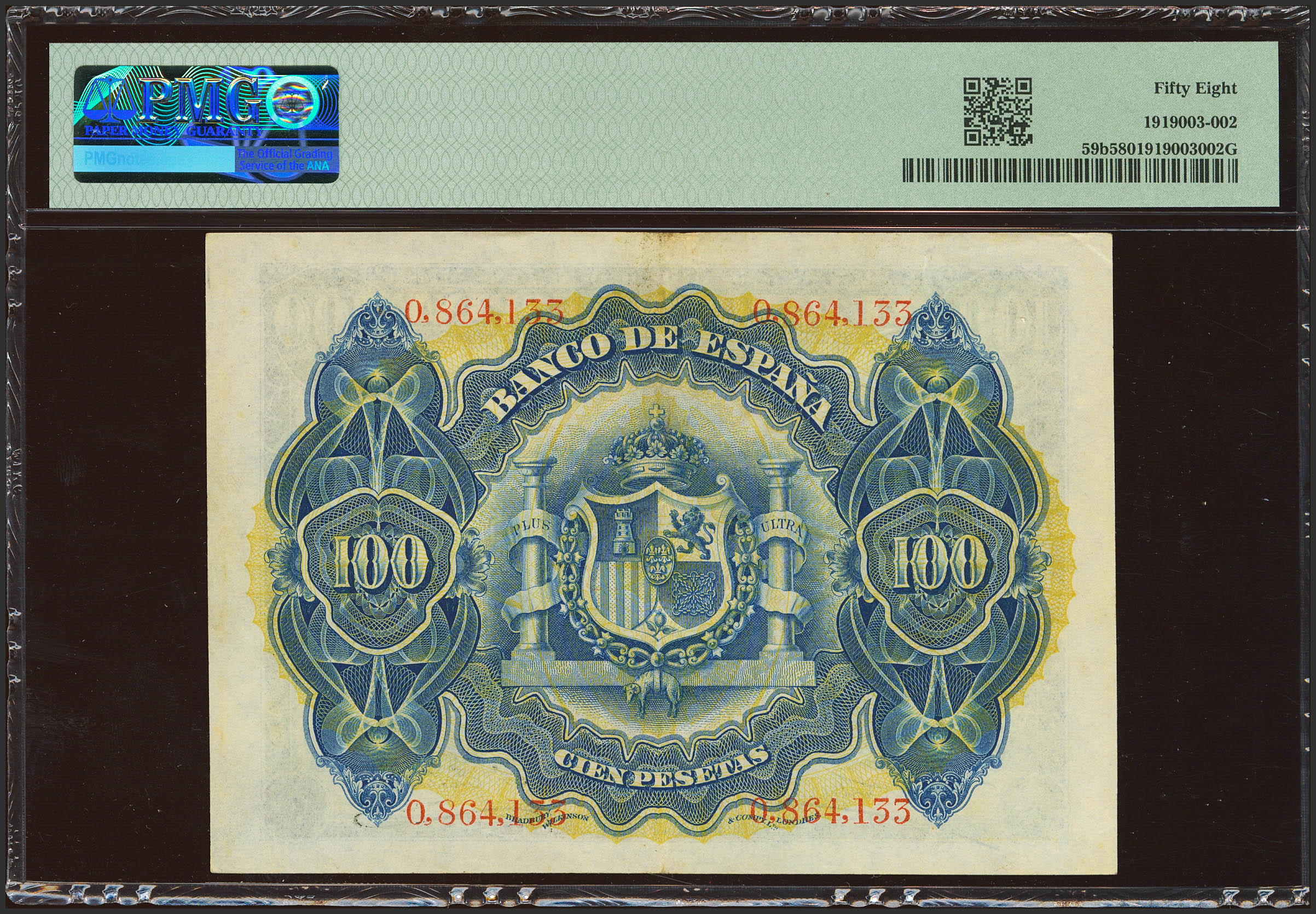 100 Pesetas. September 24, 1906. Without series and dry stamp PROVISIONAL GOVERNMENT OF THE REPUBLIC / APRIL 14, 1931. (Edifil 2023: 342, Pick: 59b). Good Extremely Fine+. Encapsulated PMG58.