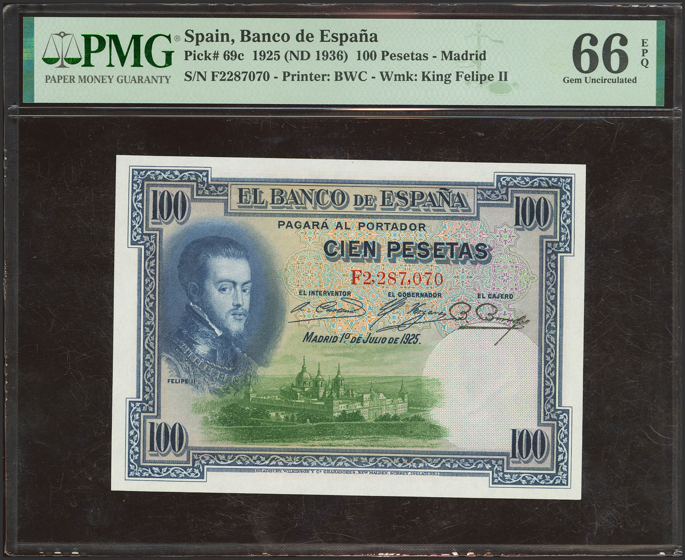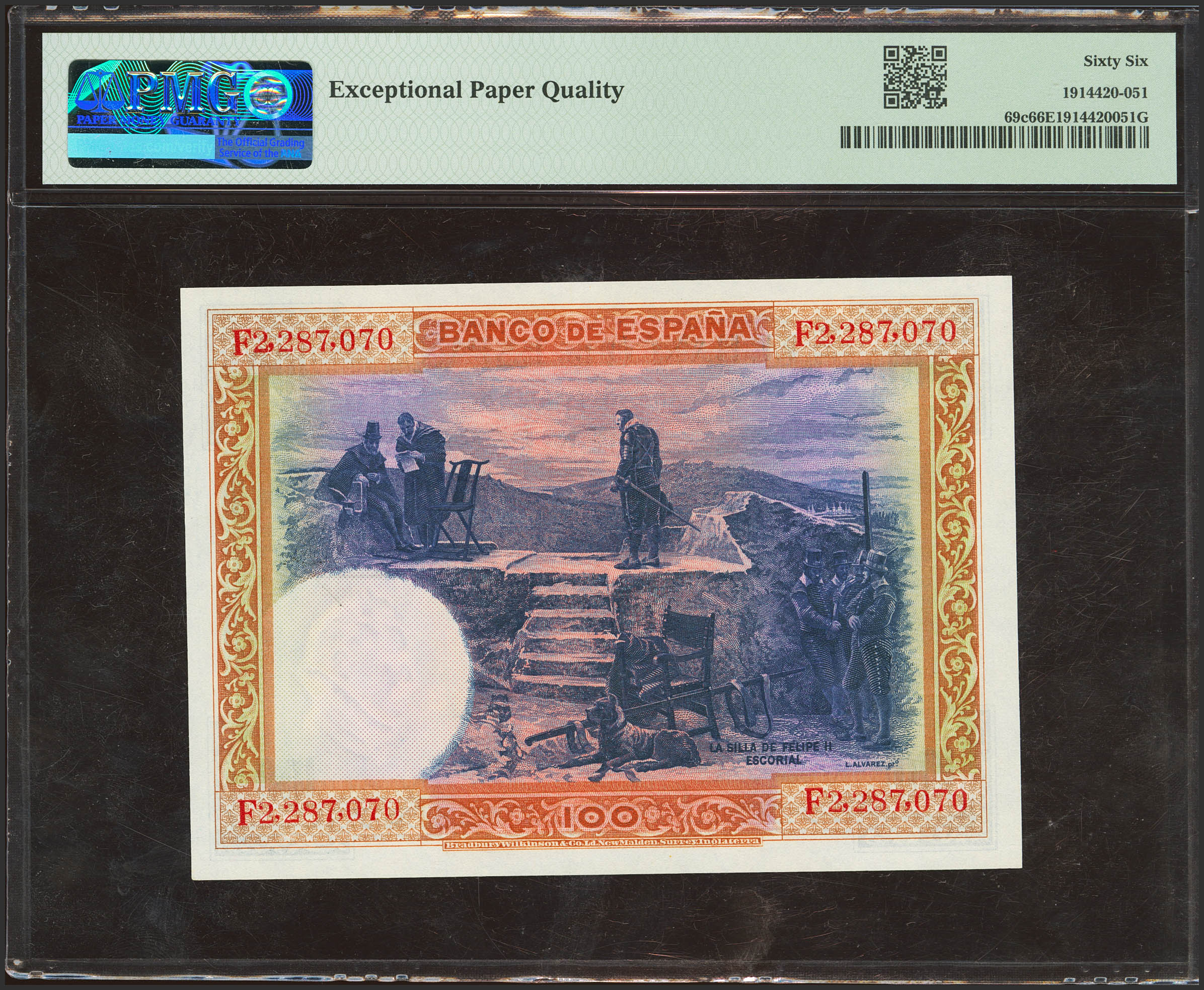 100 Pesetas. June 1, 1925. Series F. (Edifil 2021: 350, Pick: 69c). Original Uncirculated stamping. PMG66EPQ encapsulation.