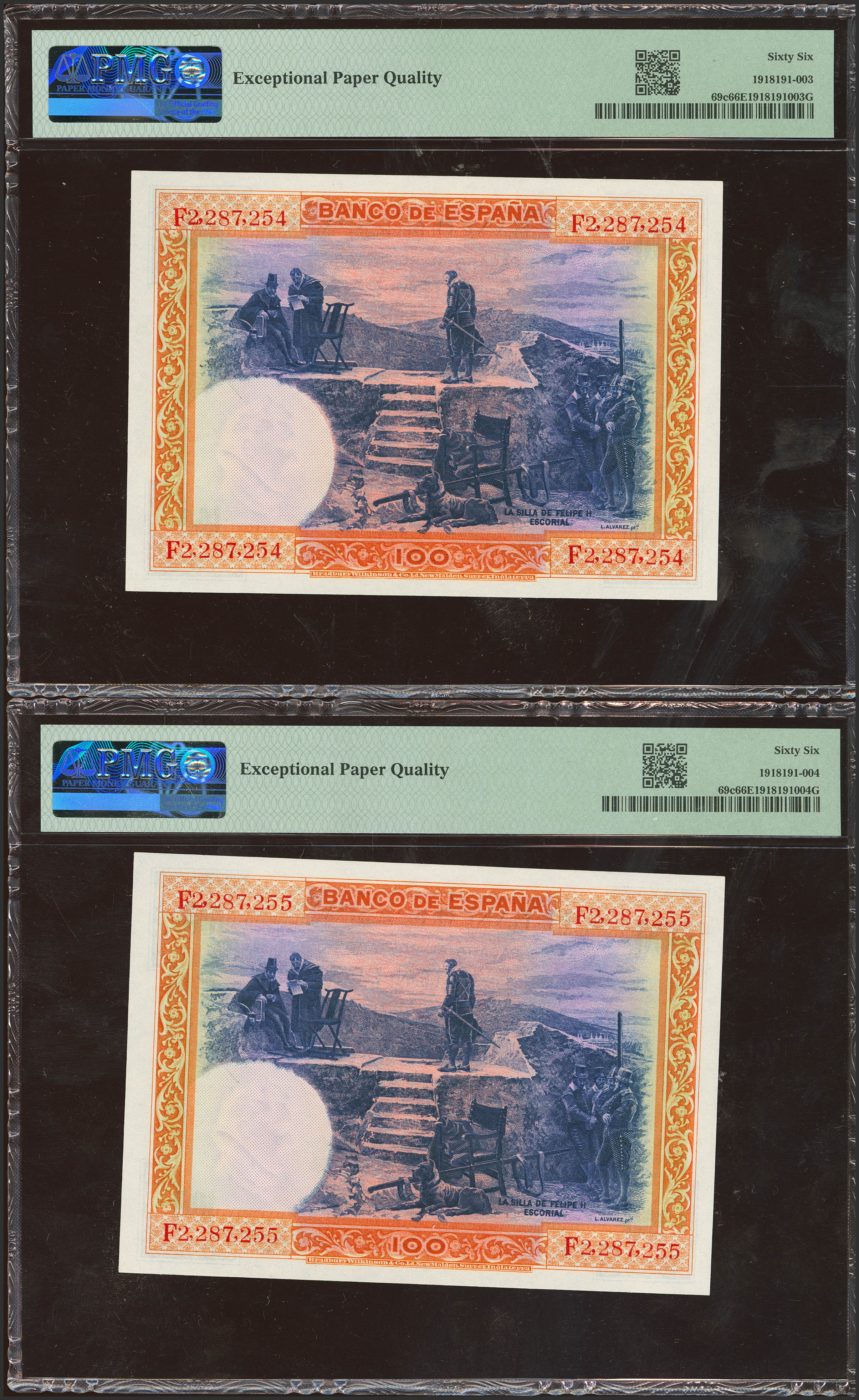 English 100 Pesetas. July 1, 1925. Correlative pair. Series F. (Edifil 2023: 350, Pick: 69c). Original marking. Both encapsulated PMG66EPQ.