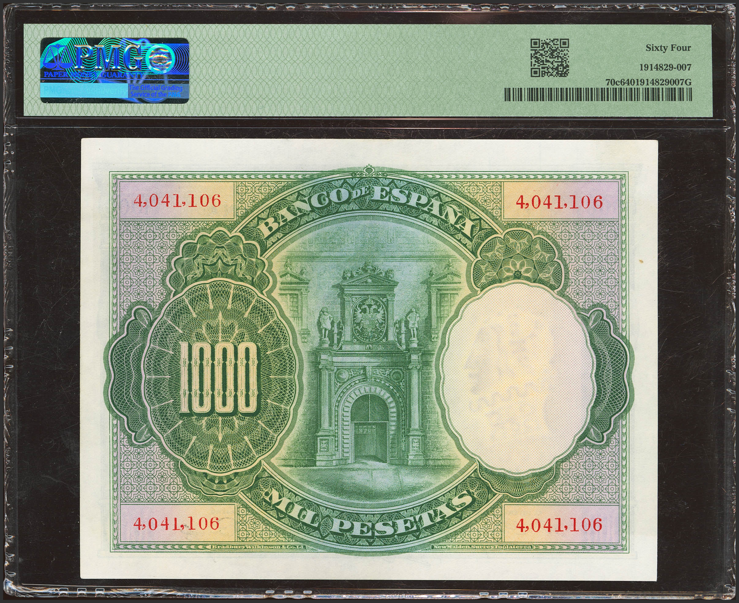 1000 Pesetas. July 1, 1925. Without series and numbered after 3646000. (Edifil 2021: 351, Pick: 70c). Very rare in this exceptional quality. Uncirculated. Encapsulated PMG64 (to give us an idea of the rarity, as of October 1, 2024, this banknote is the sixth best rated along with four other banknotes in PMG).