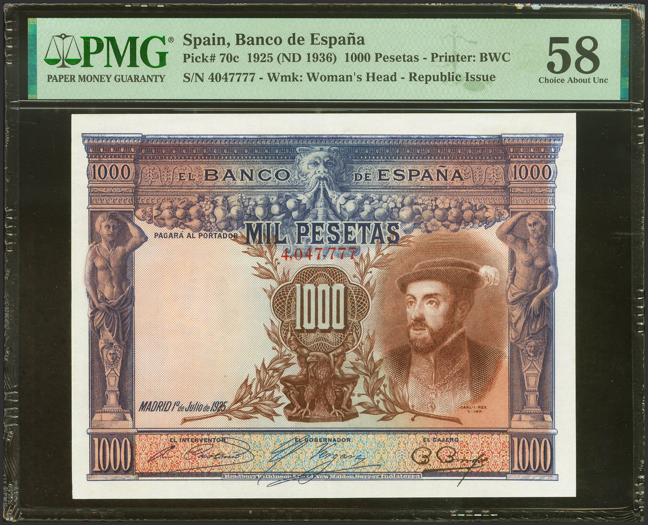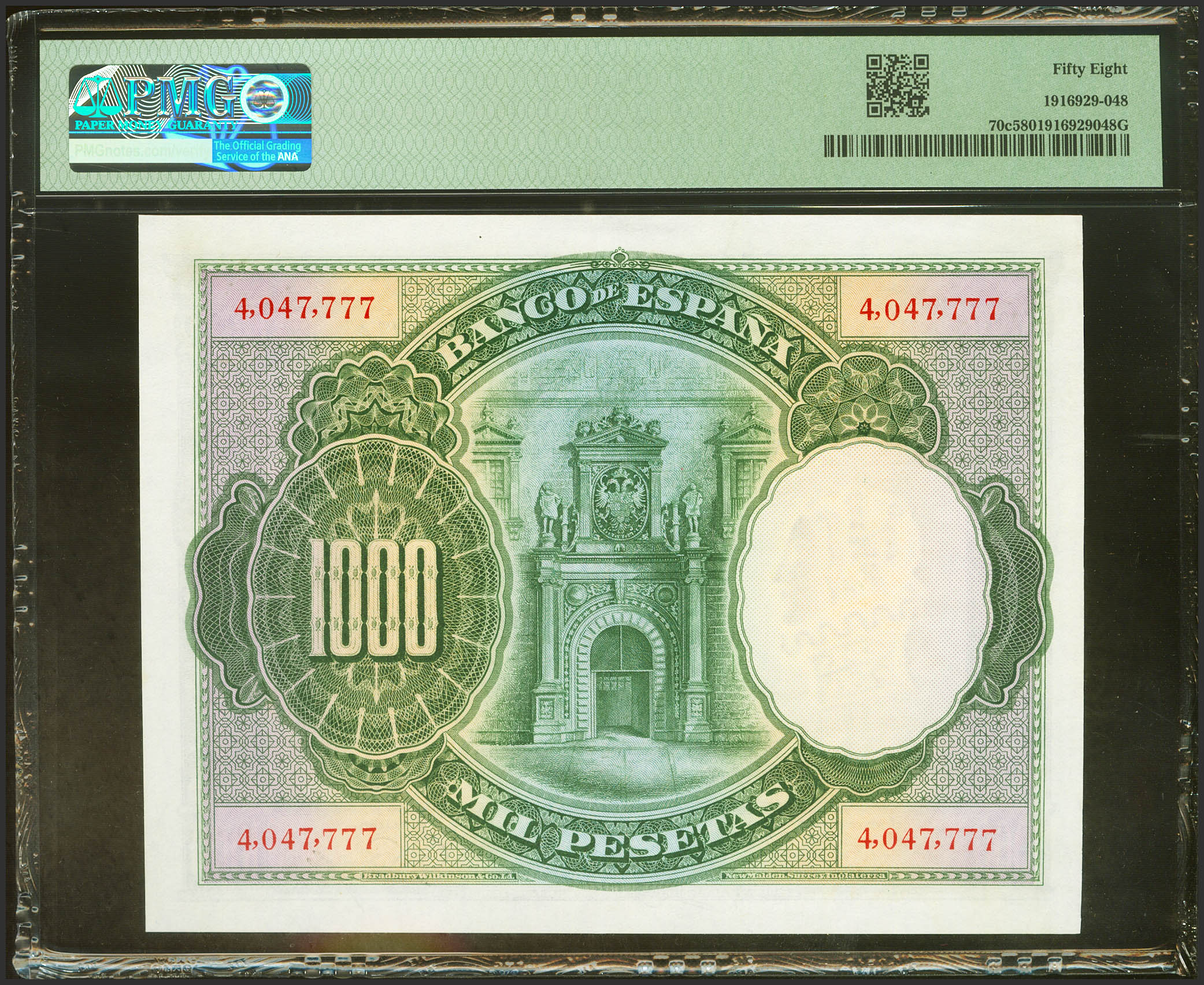 1000 Pesetas. July 1, 1925. No series and numbered higher than 3646000. (Edifil 2023: 351, Pick: 70c). Unusual in this quality. Good Extremely Fine+. Encapsulated PMG58.