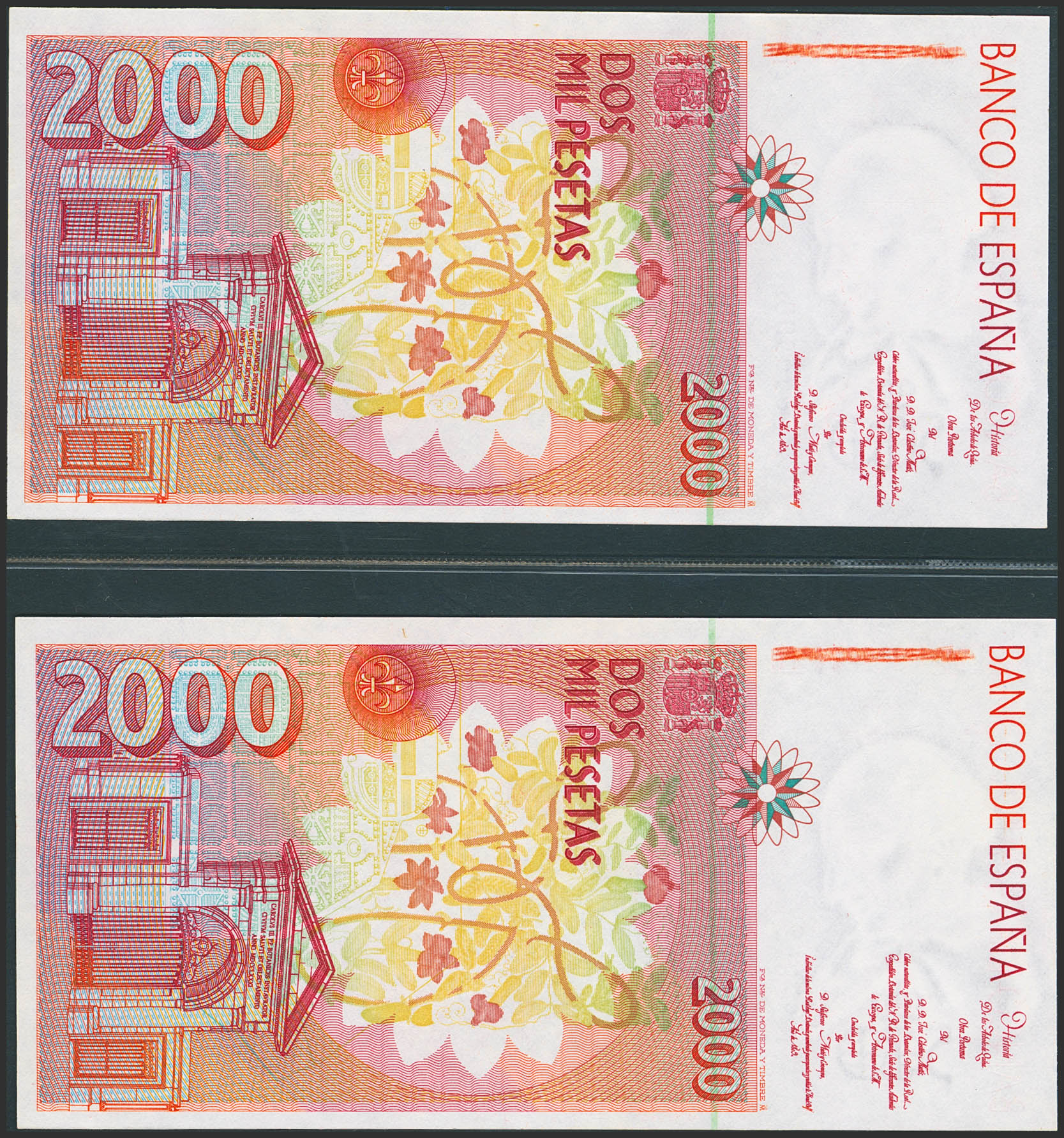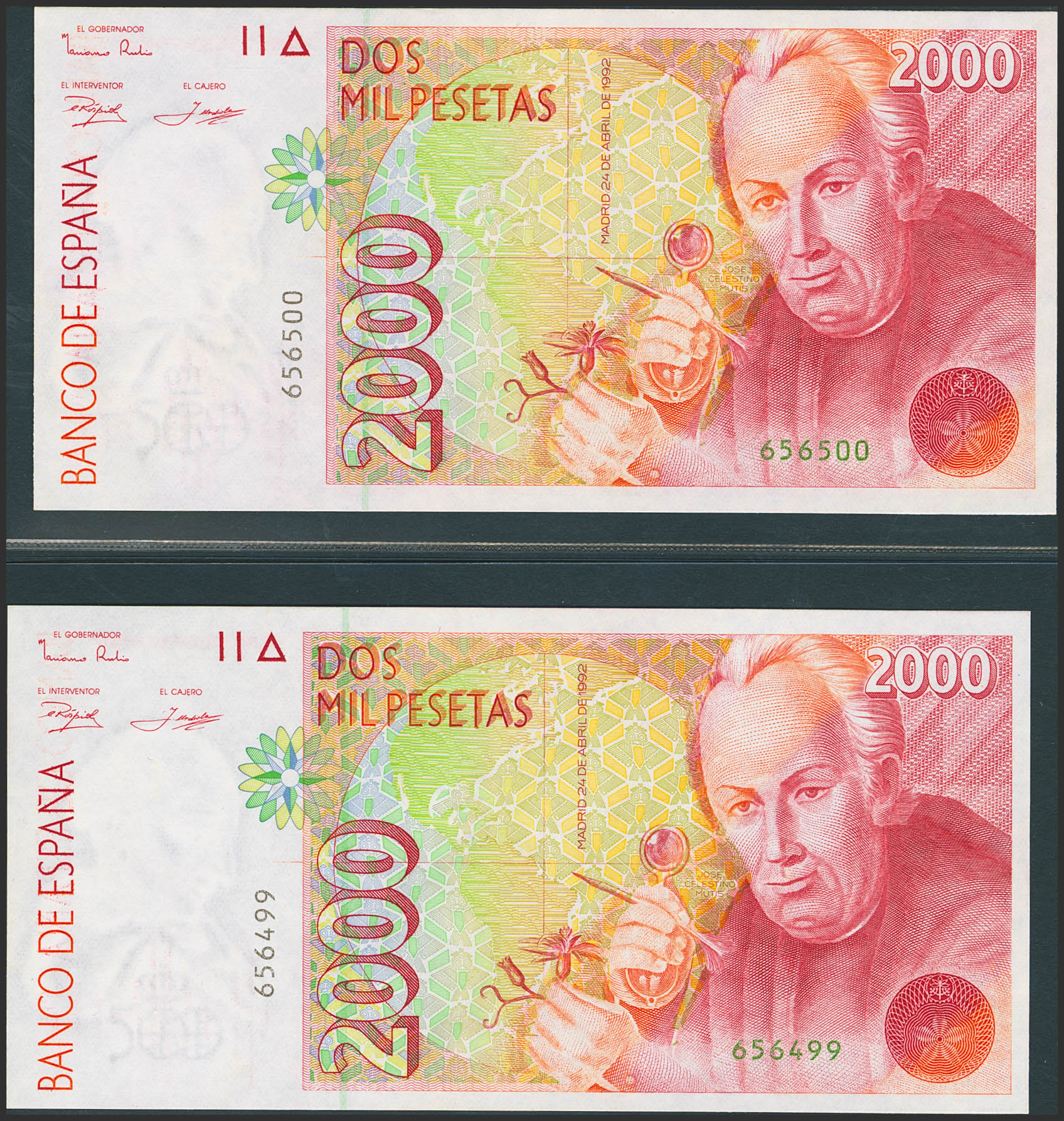 2000 Pesetas. April 24, 1992. Correlative pair. No series. (Edifil 2021: 482). Uncirculated.