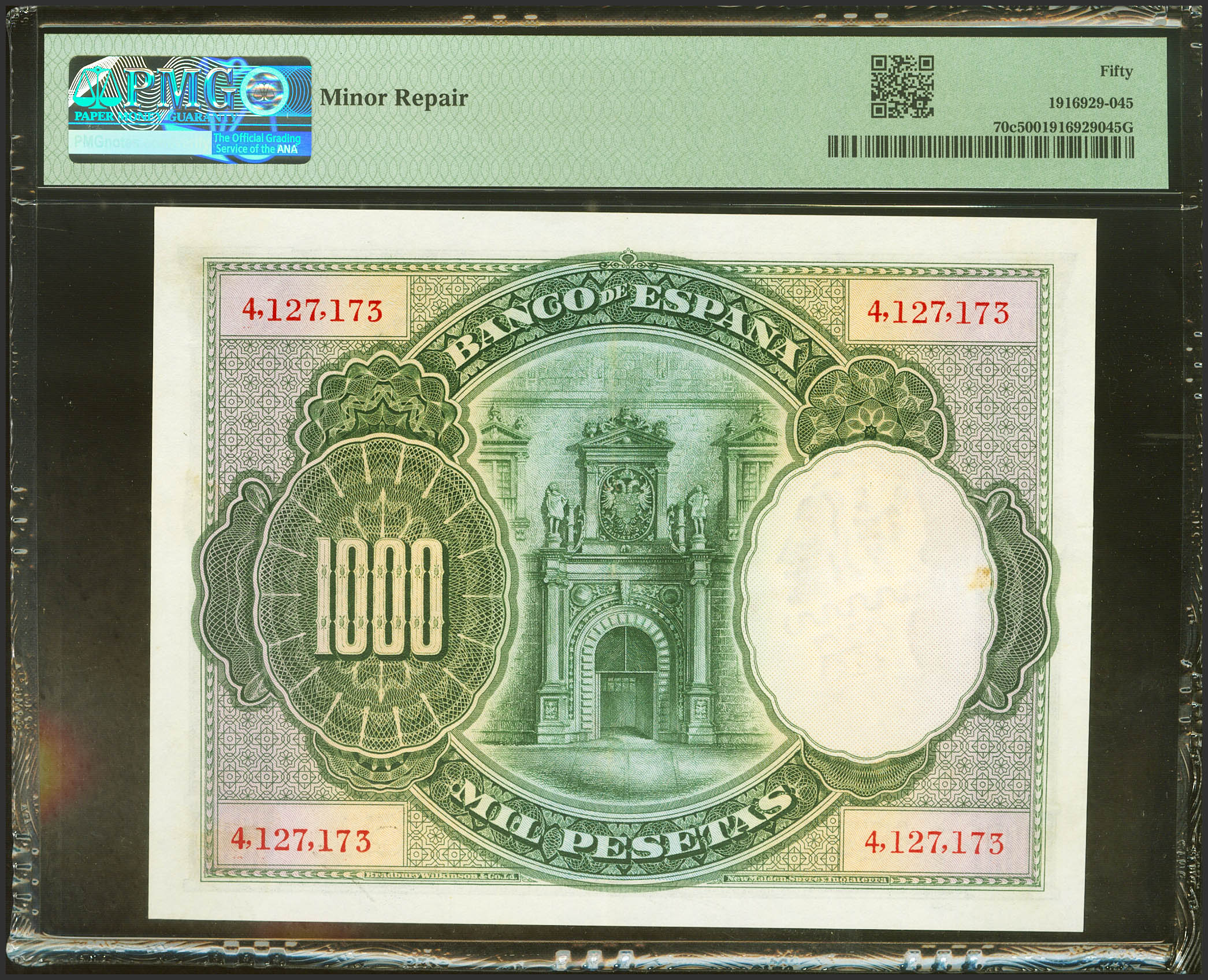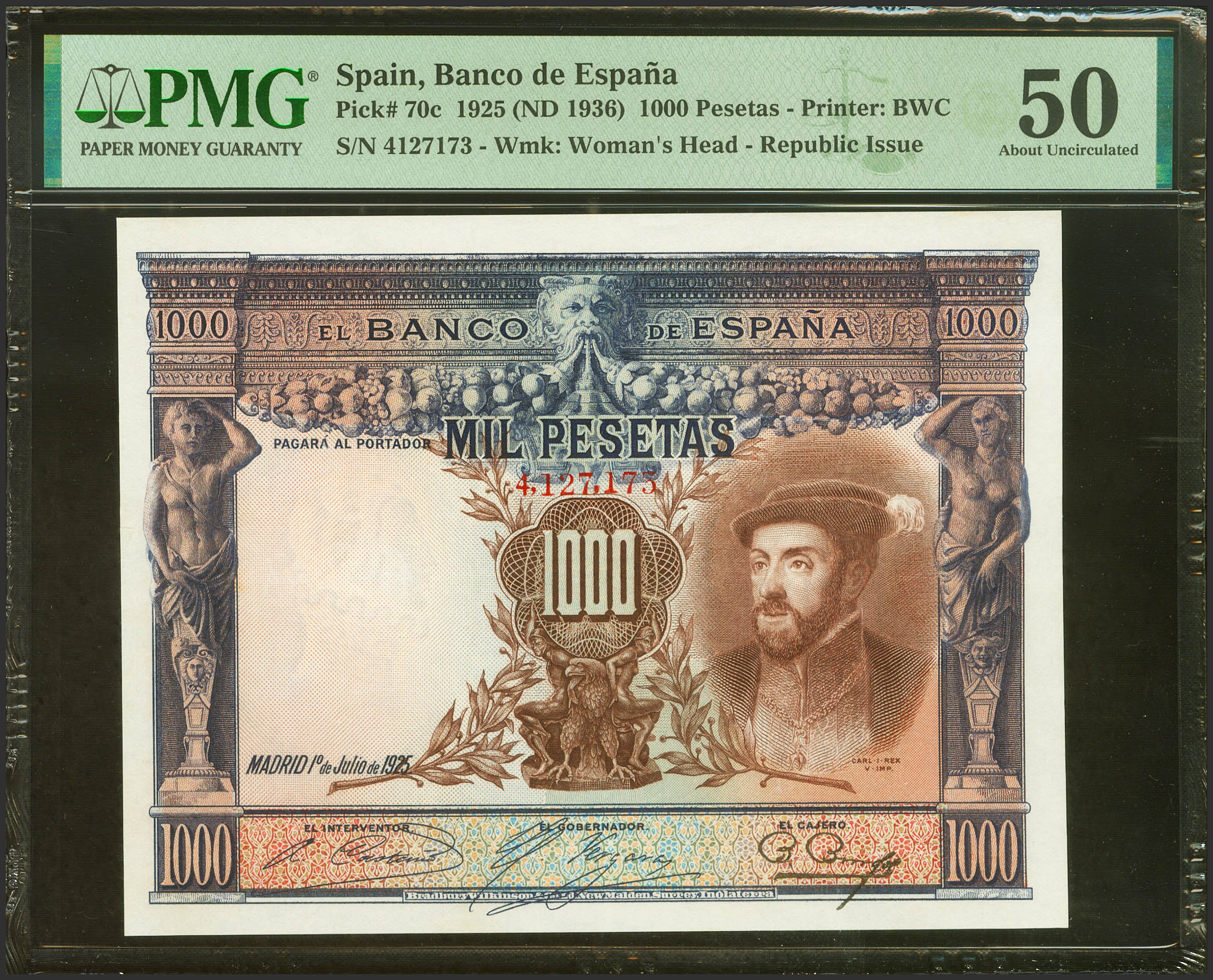 English 1000 Pesetas. July 1, 1925. Without series and numbered after 3646000. (Edifil 2021: 351, Pick: 70c). Unusual in this quality. Extremely Fine. Encapsulated PMG50 (minor repair).