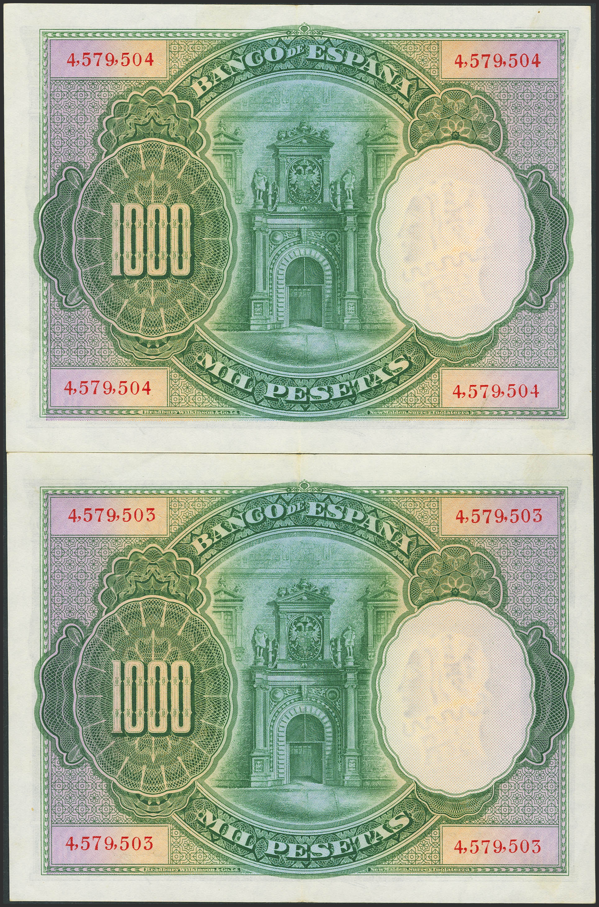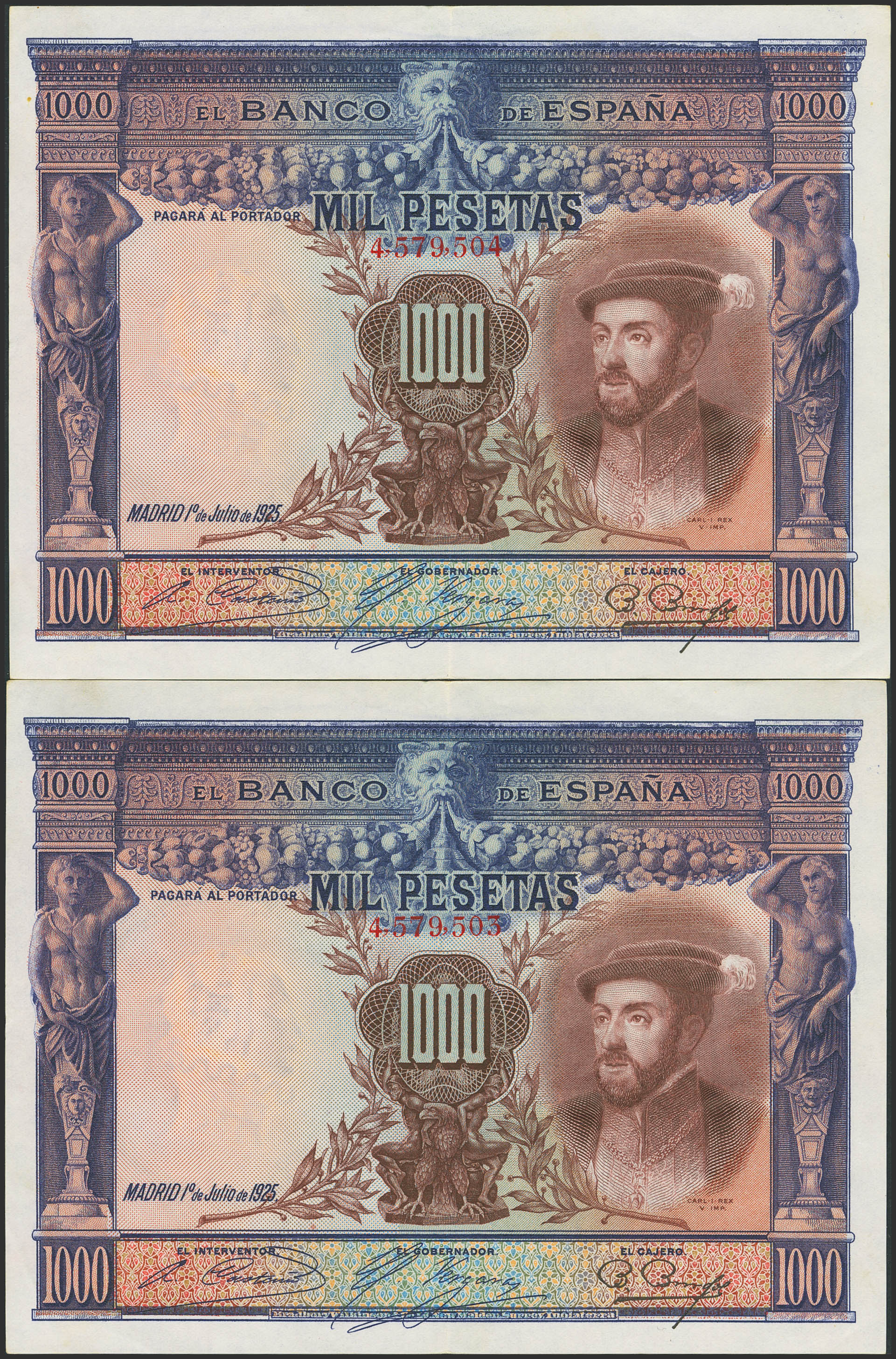 1000 Pesetas. July 1, 1925. Correlative pair. Without series and numbered after 3646000. (Edifil 2021: 351, Pick: 70c). Retains part of the original finish. Extremely Fine.