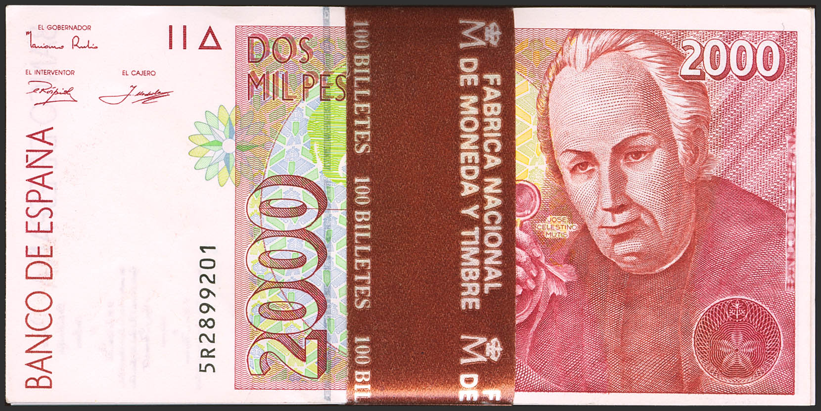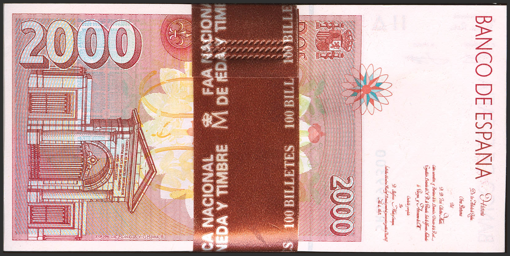Set of 100 consecutive 2000 Pesetas banknotes issued on April 24, 1992 (design modified in 1995) and with the 5R series, in a "bundle" and with its original seal. (Edifil 2023: 482Aa). Uncirculated/Uncirculated-.