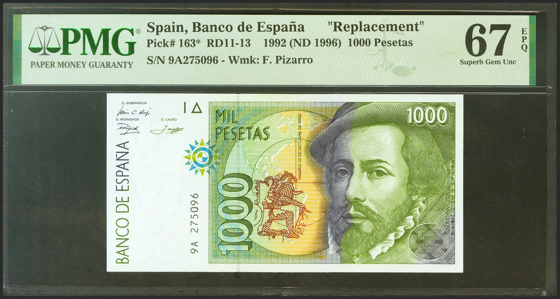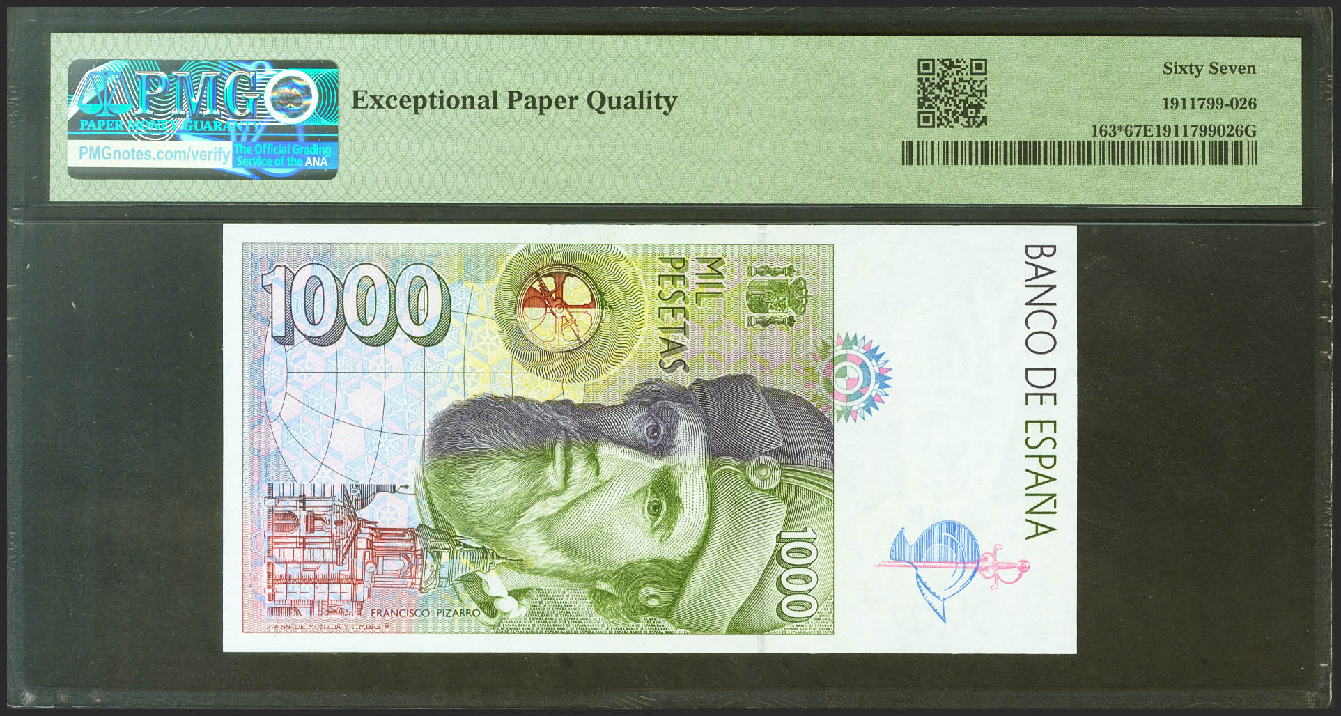 1000 Pesetas. October 12, 1992. Special series 9A. (Edifil 2021: 483c, Pick: 163*). Extraordinarily rare in this exceptional quality, original finish. Uncirculated. Encapsulated PMG67EPQ.