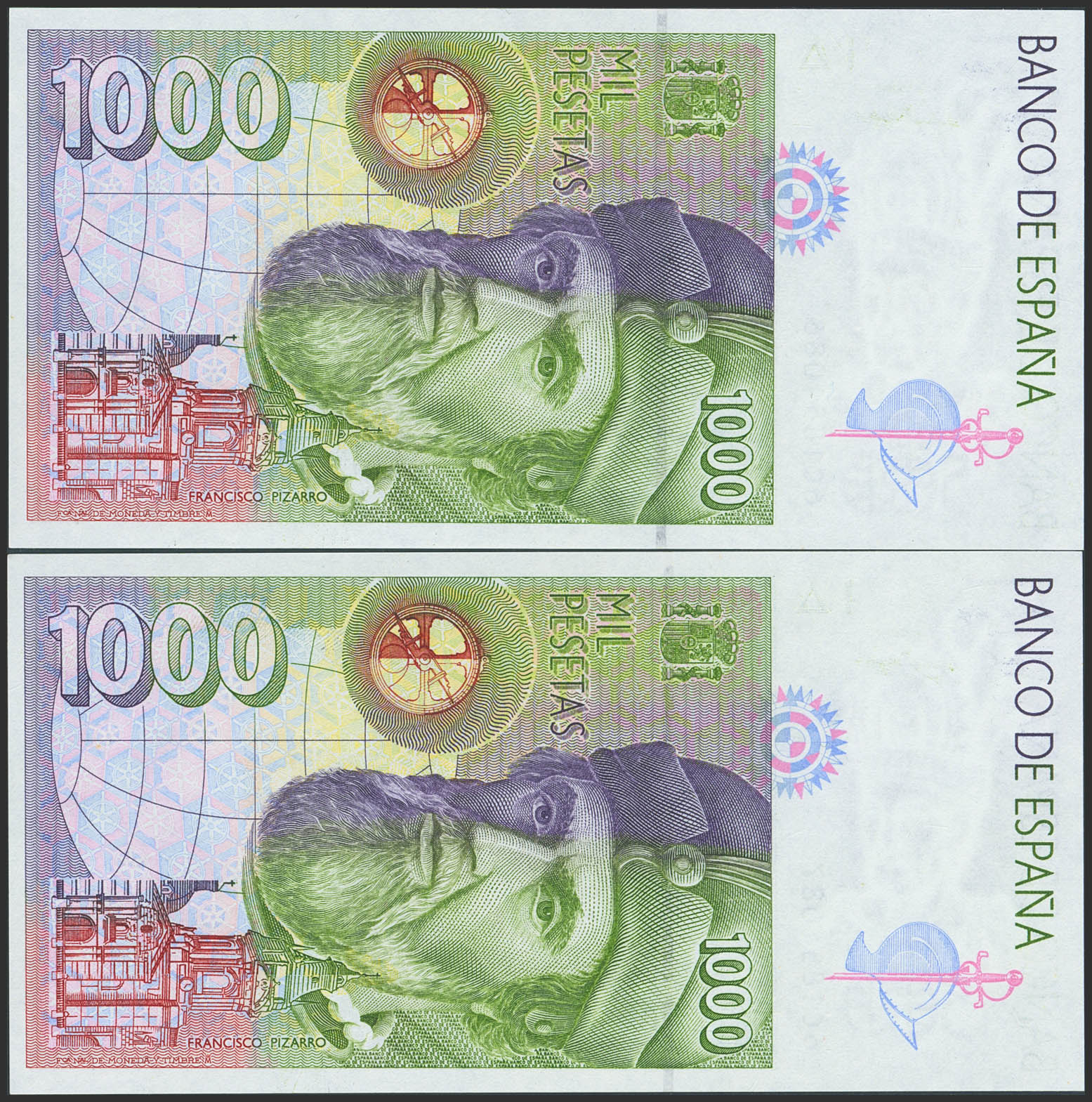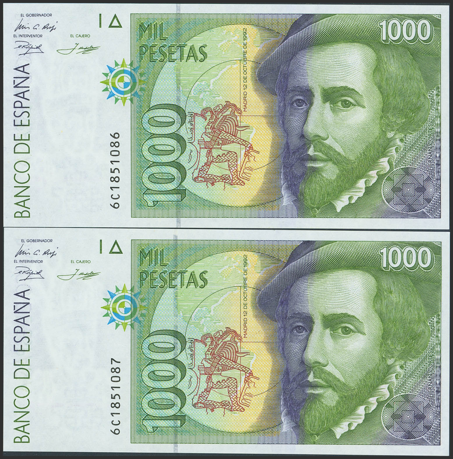 1000 Pesetas. October 12, 1992. Correlative pair. Series 6C. (Edifil 2023: 483b). Uncirculated.