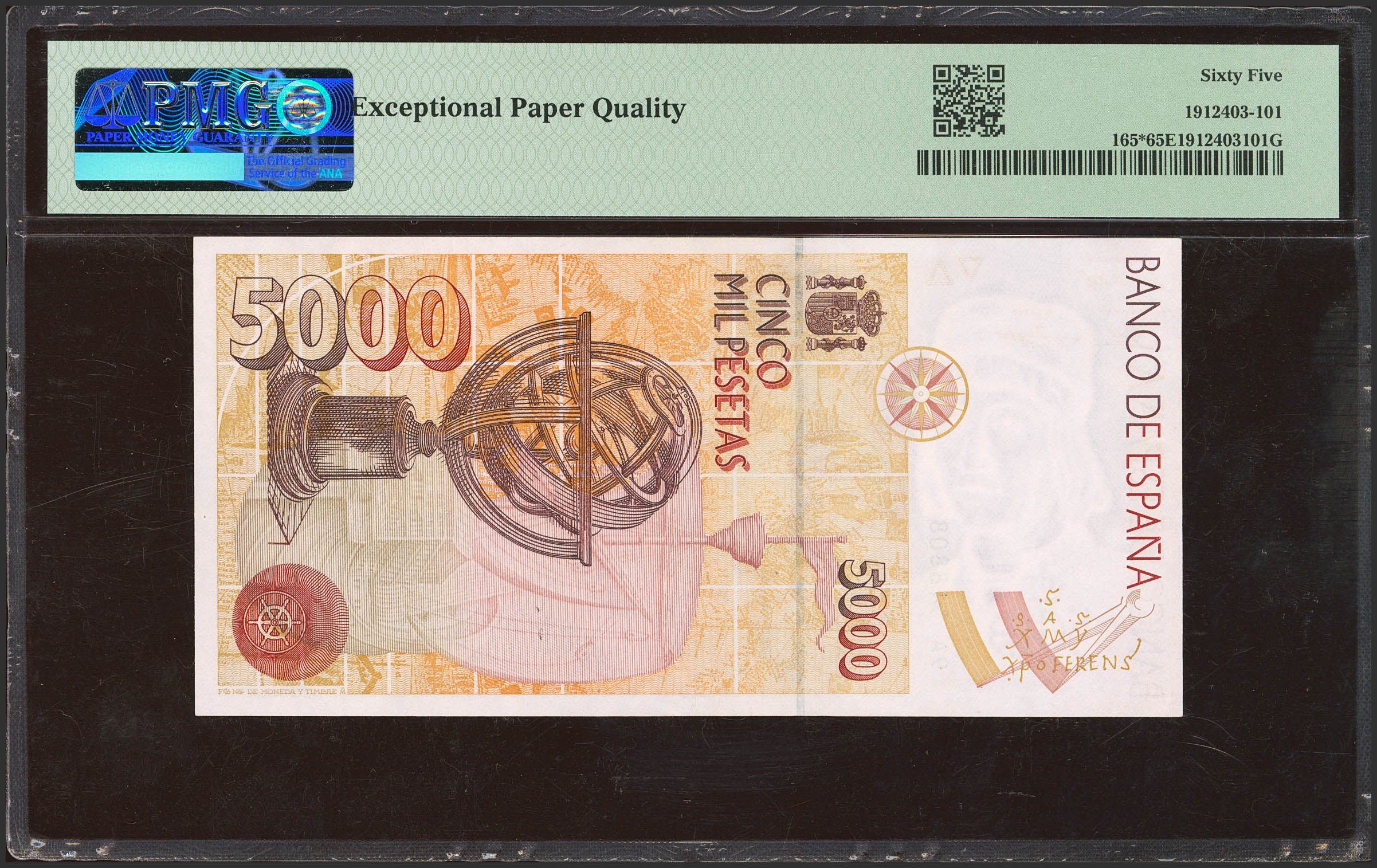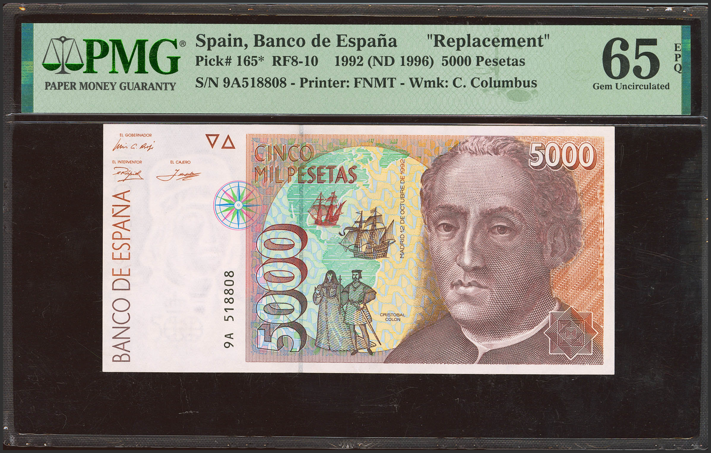 5000 Pesetas. October 12, 1992. Special series 9A. (Edifil 2021: 484b, Pick: 165*). Rare in this exceptional quality. Uncirculated. Encapsulated PMG65EPQ.