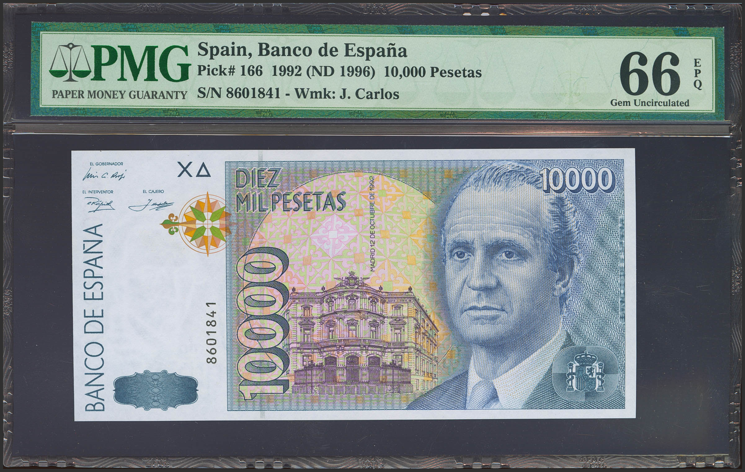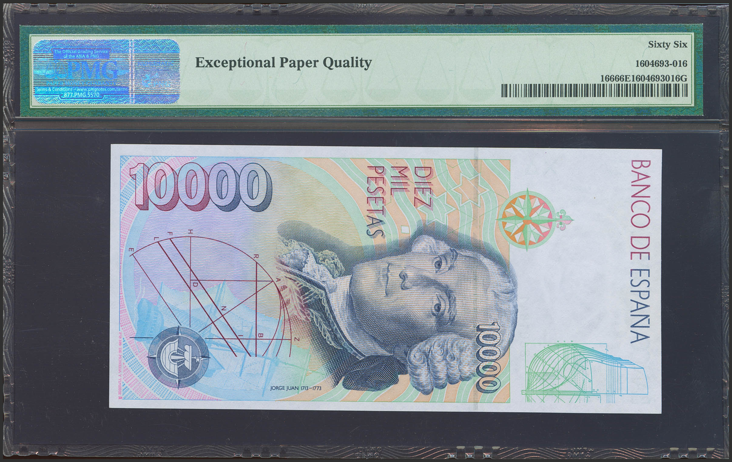 10000 Pesetas. October 12, 1992. No series. (Edifil 2023: 485, Pick: 166). Uncirculated. Encapsulated PMG66EPQ.