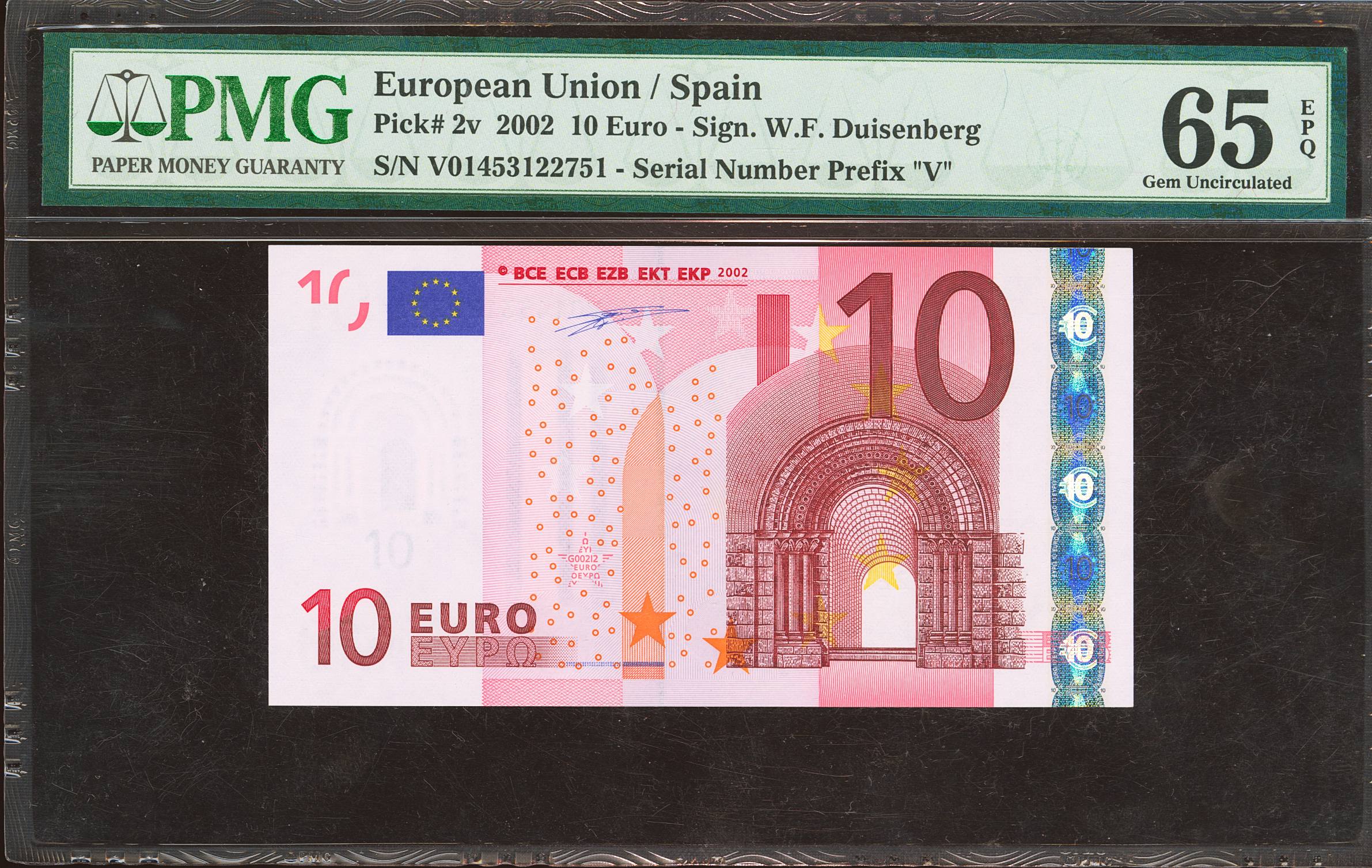 10 Euros. January 1, 2002. Duisenberg firm. Series V (Spain). (Edifil 2023: 487, Pick: 2v). Uncirculated. PMG65EPQ encapsulation.