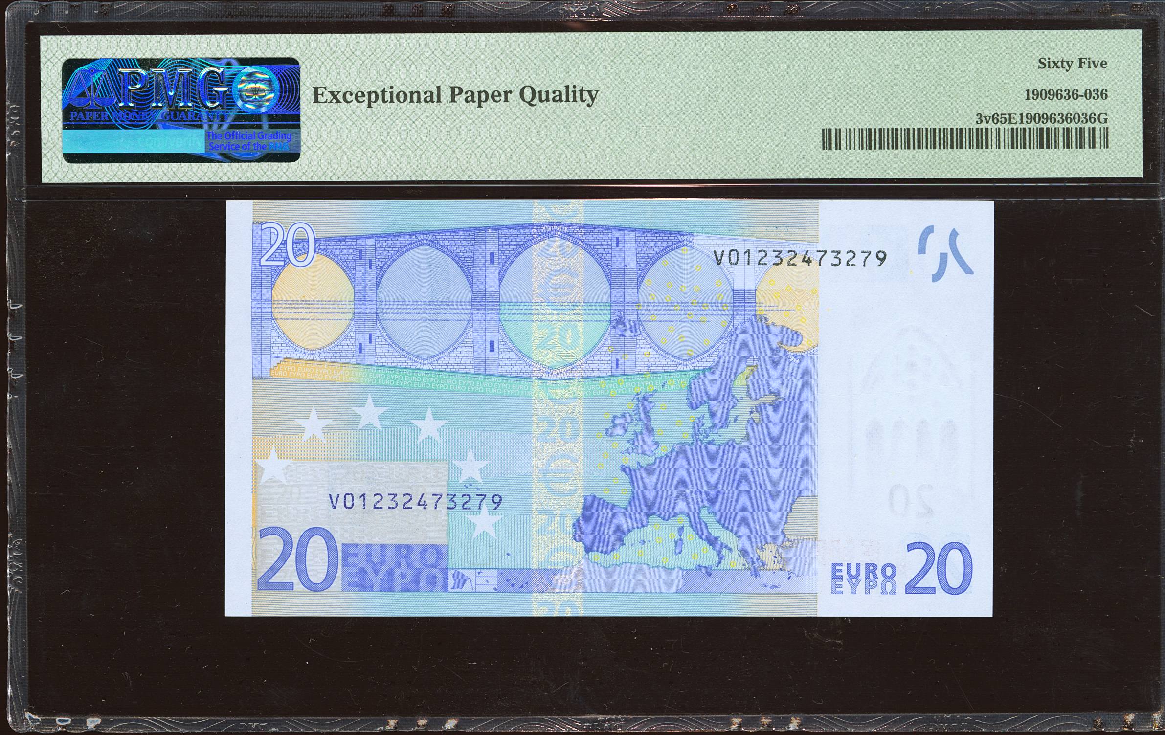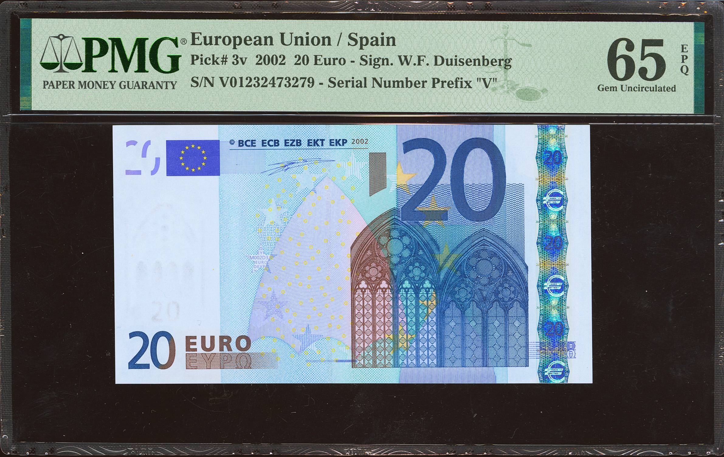 20 Euros. January 1, 2002. Duisenberg firm. Series V (Spain). (Edifil 2023: 488, Pick: 3v). Uncirculated. PMG65EPQ encapsulation.