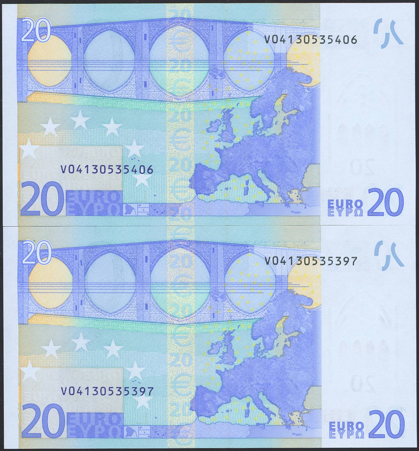 20 Euros. January 1, 2002. Correlative pair (it should be remembered that the last digit of all banknotes denominated in euros is for internal control by the European Central Bank; the penultimate digit is the one that marks the correlativity of the banknotes). Duisenberg signature. Series V (Spain). (Edifil 2023: 488). Uncirculated.