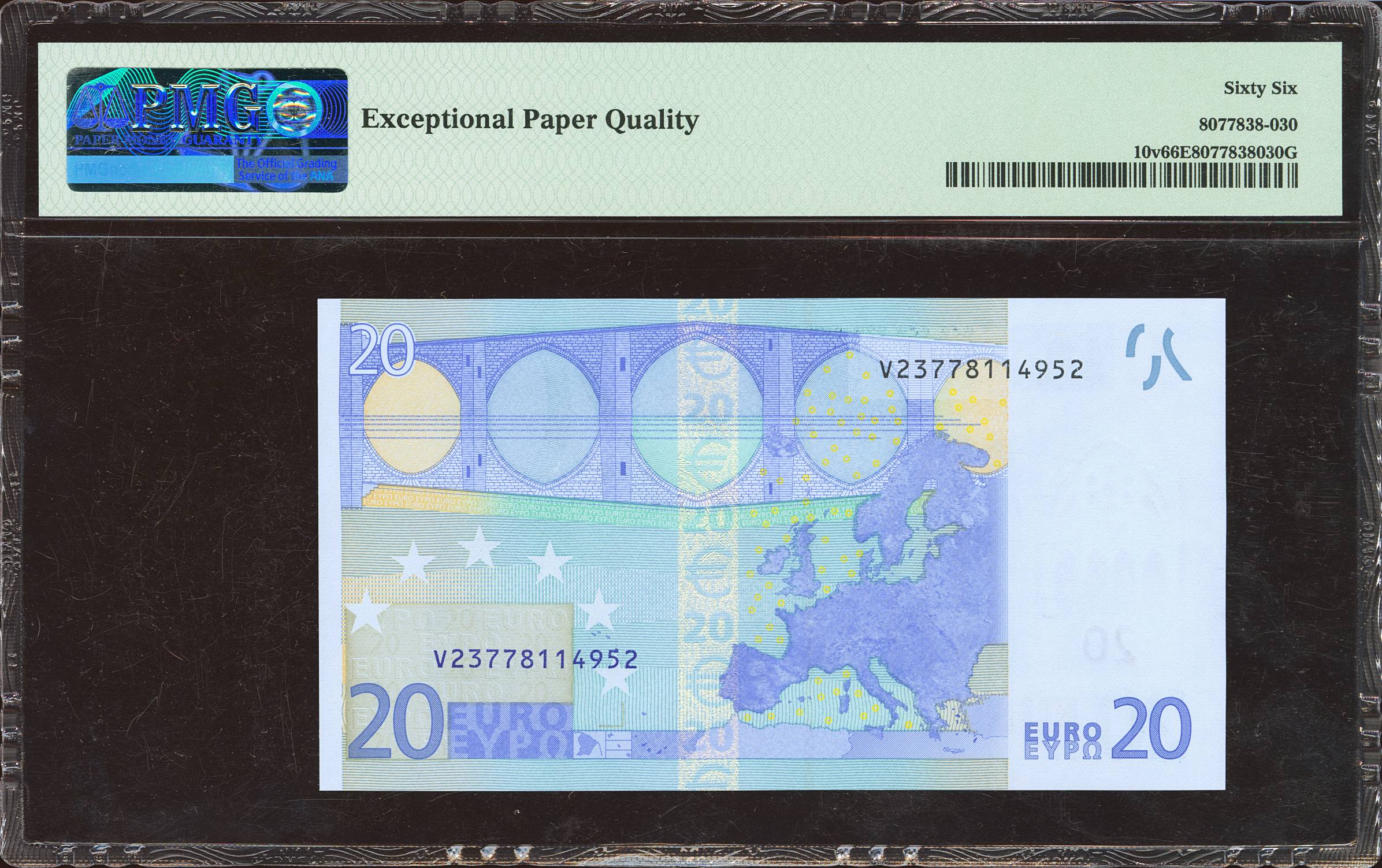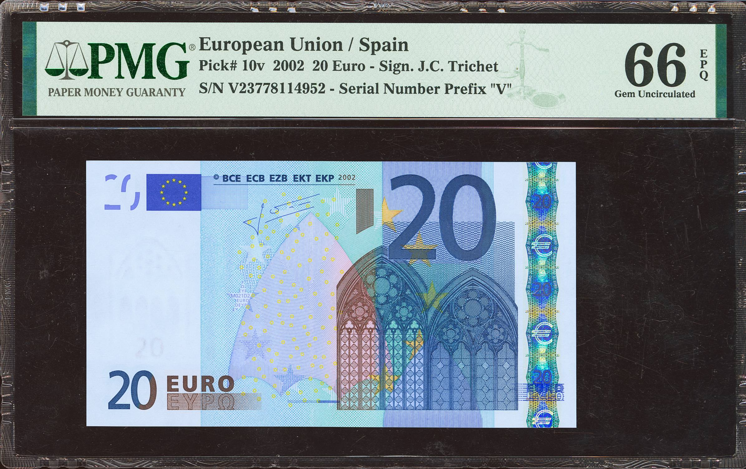 20 Euros. January 1, 2002. Trichet signature. Series V (Spain). (Edifil 2021: 488A, Pick: 10v). Uncirculated. PMG66EPQ encapsulation.