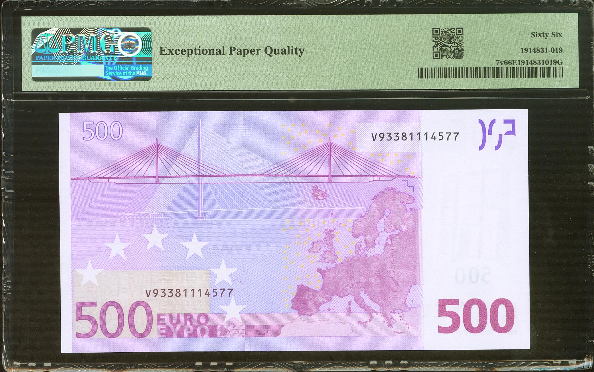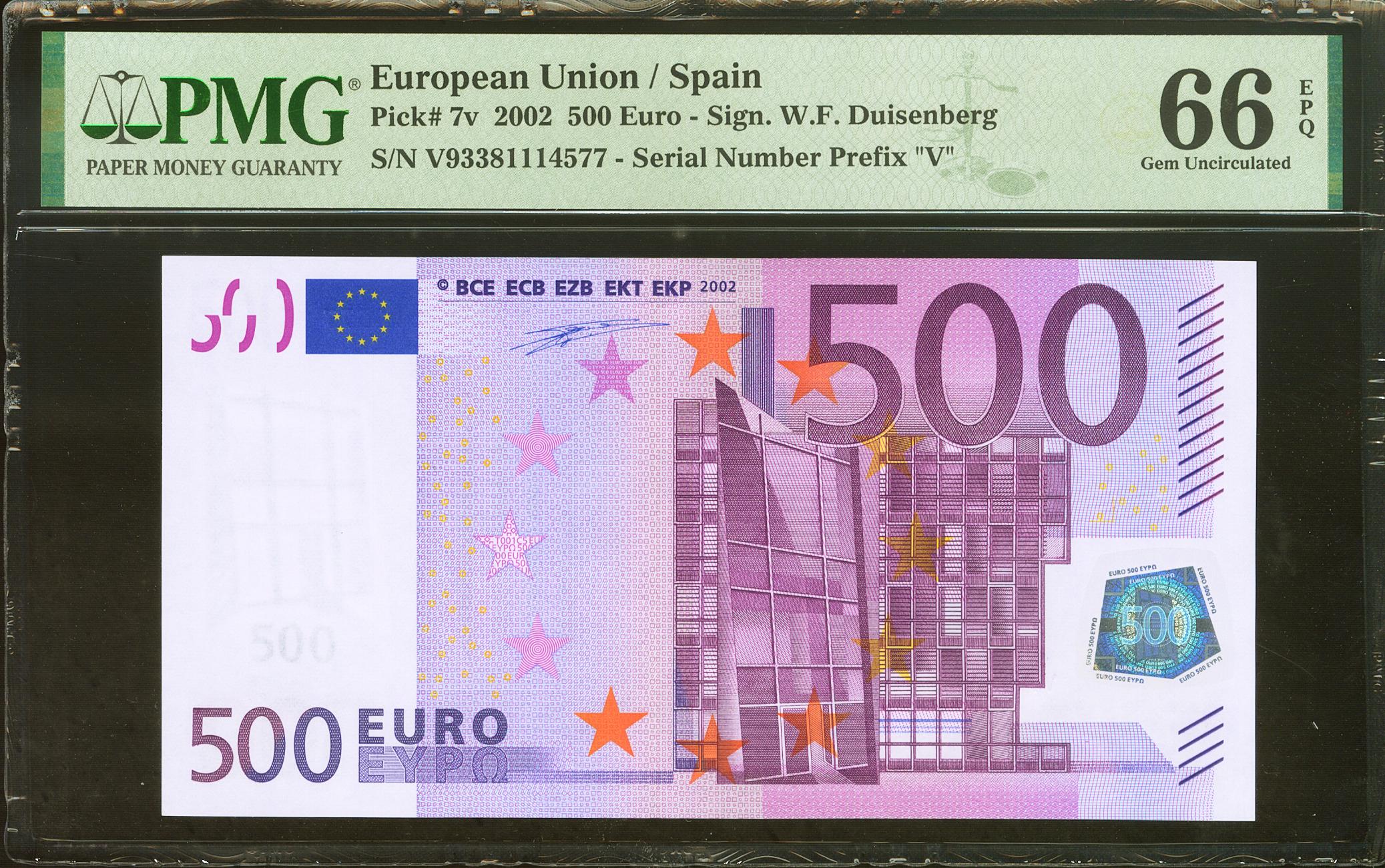 500 Euros. January 1, 2002. Duisenberg signature. Series V (Spain). (Edifil 2021: 492). Unusual. Uncirculated. PMG66EPQ encapsulation.