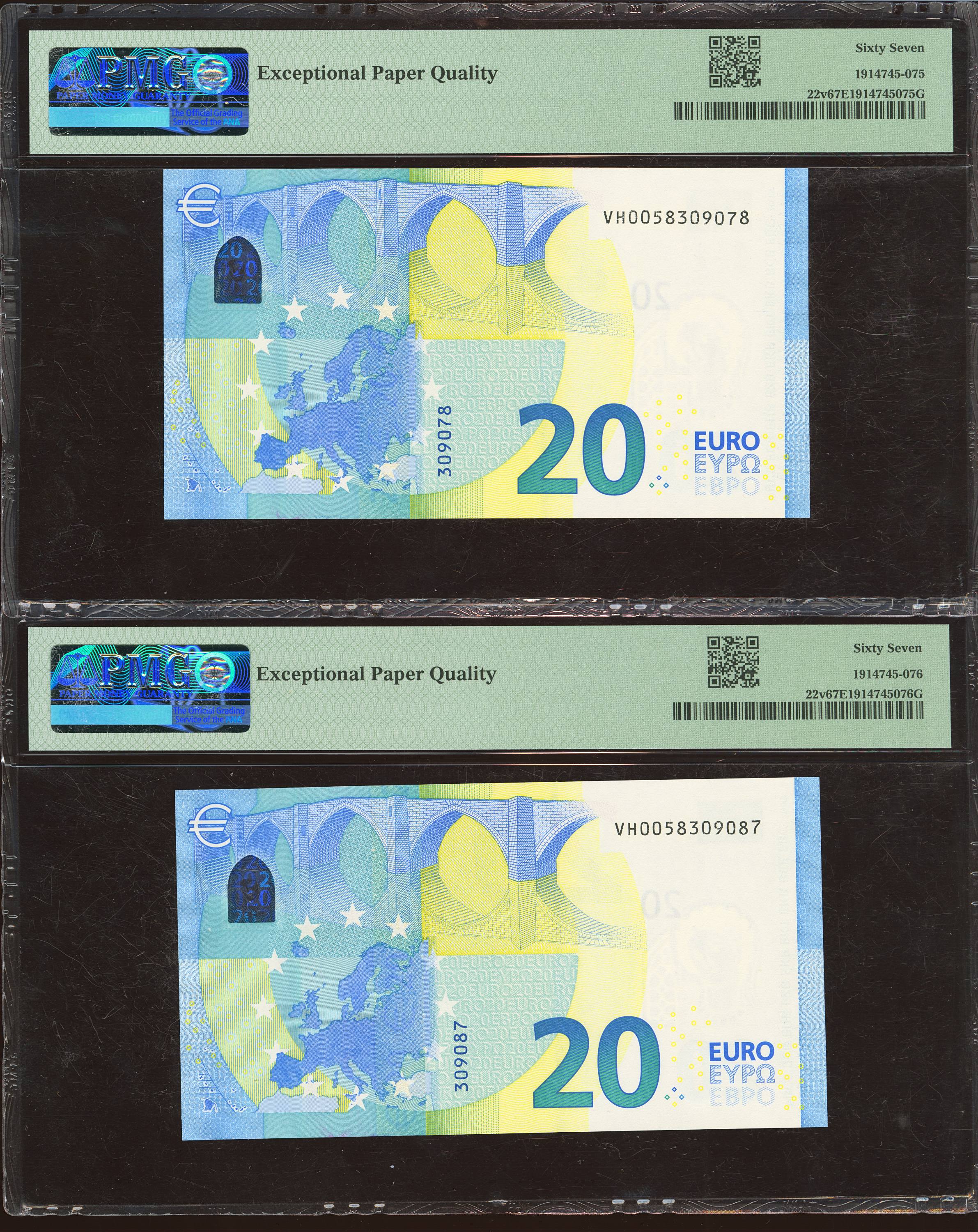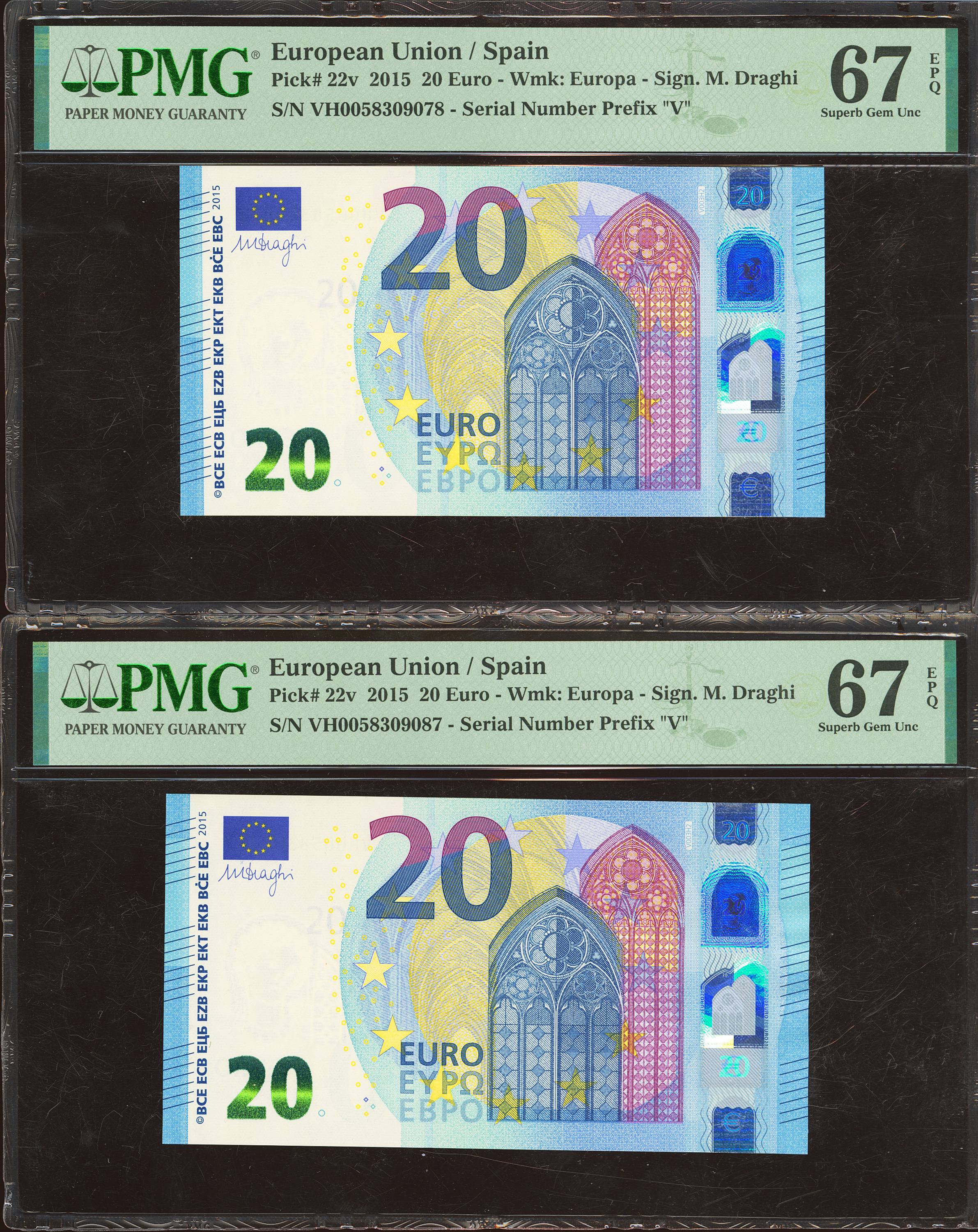 20 Euros. November 25, 2015. Consecutively matching pair (it should be remembered that the last digit of the numbering of all euro banknotes is for internal control by the European Central Bank; the penultimate digit is the one that marks the consecutiveness of the banknotes). Signature Draghi. Special series VH (Spain). (Edifil 2023: 495a, Pick: 22v). Uncirculated. Both encapsulated PMG67EPQ.