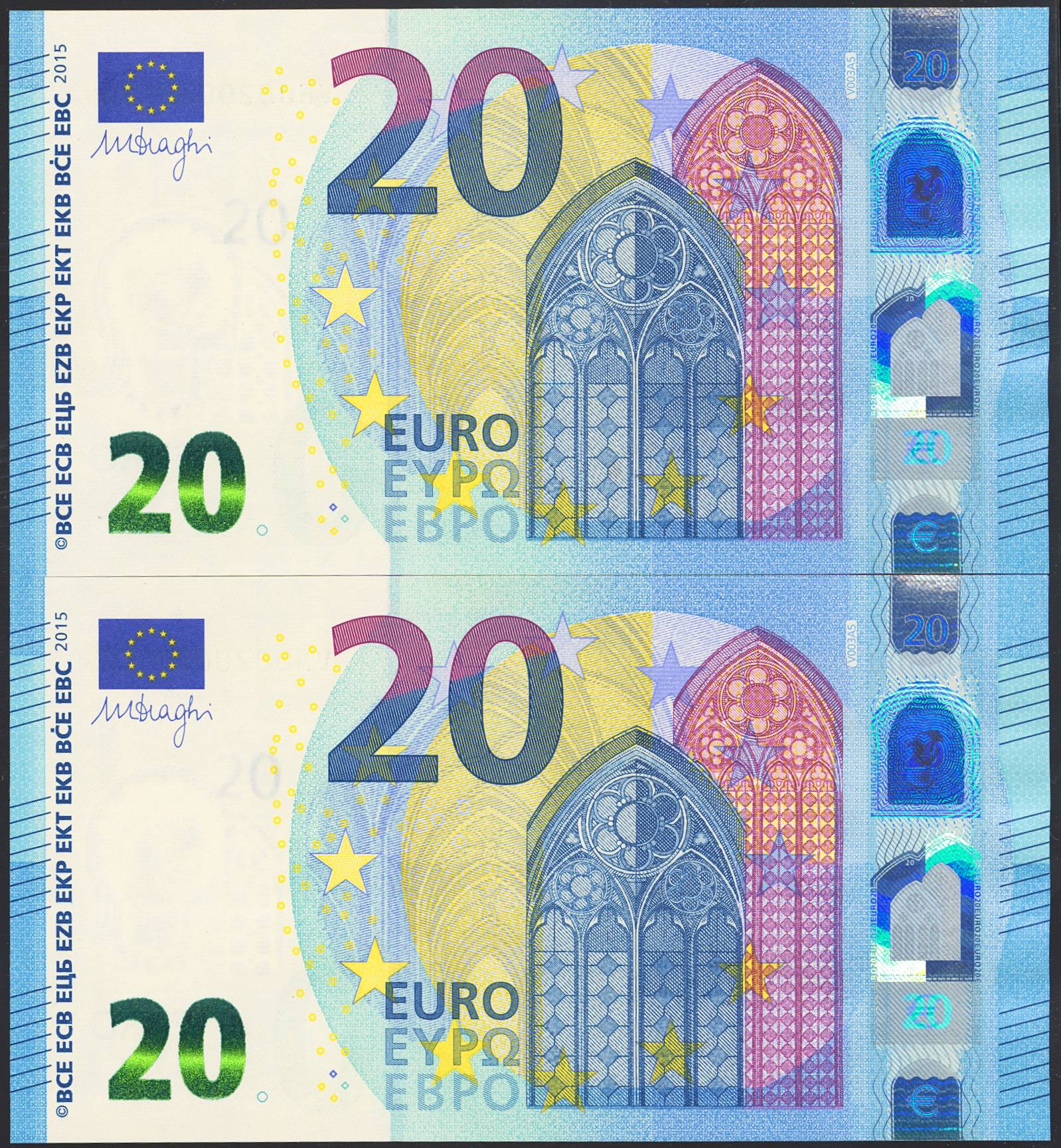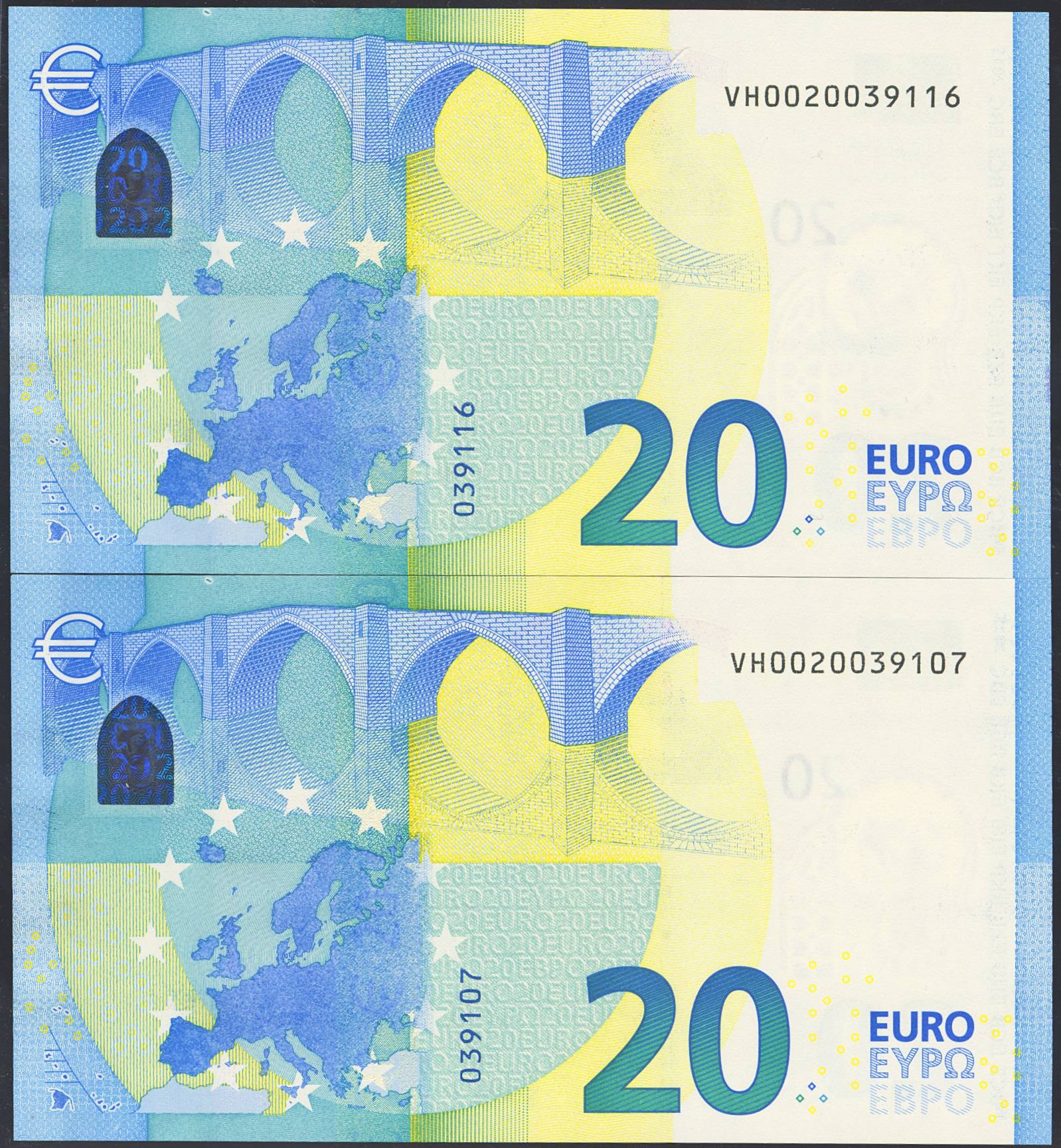 20 Euros. 25 November 2015. Correlative pair (it should be remembered that the last digit of the numbering of all banknotes denominated in euros is for internal control by the European Central Bank; the penultimate digit is the one that marks the correlativity of the banknotes). Signature Draghi. Special series VH (Spain). (Edifil 2023: 495a). Uncirculated.