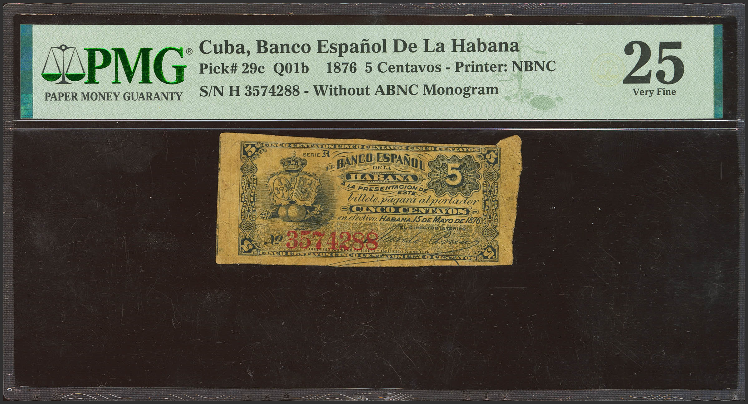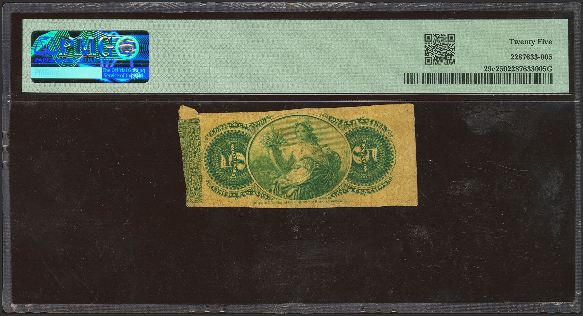 English SPANISH BANK OF HAVANA. 5 Centavos. May 15, 1876. Series H. (Edifil 2023: 42). Unusual. VF+. Encapsulated PMG25.