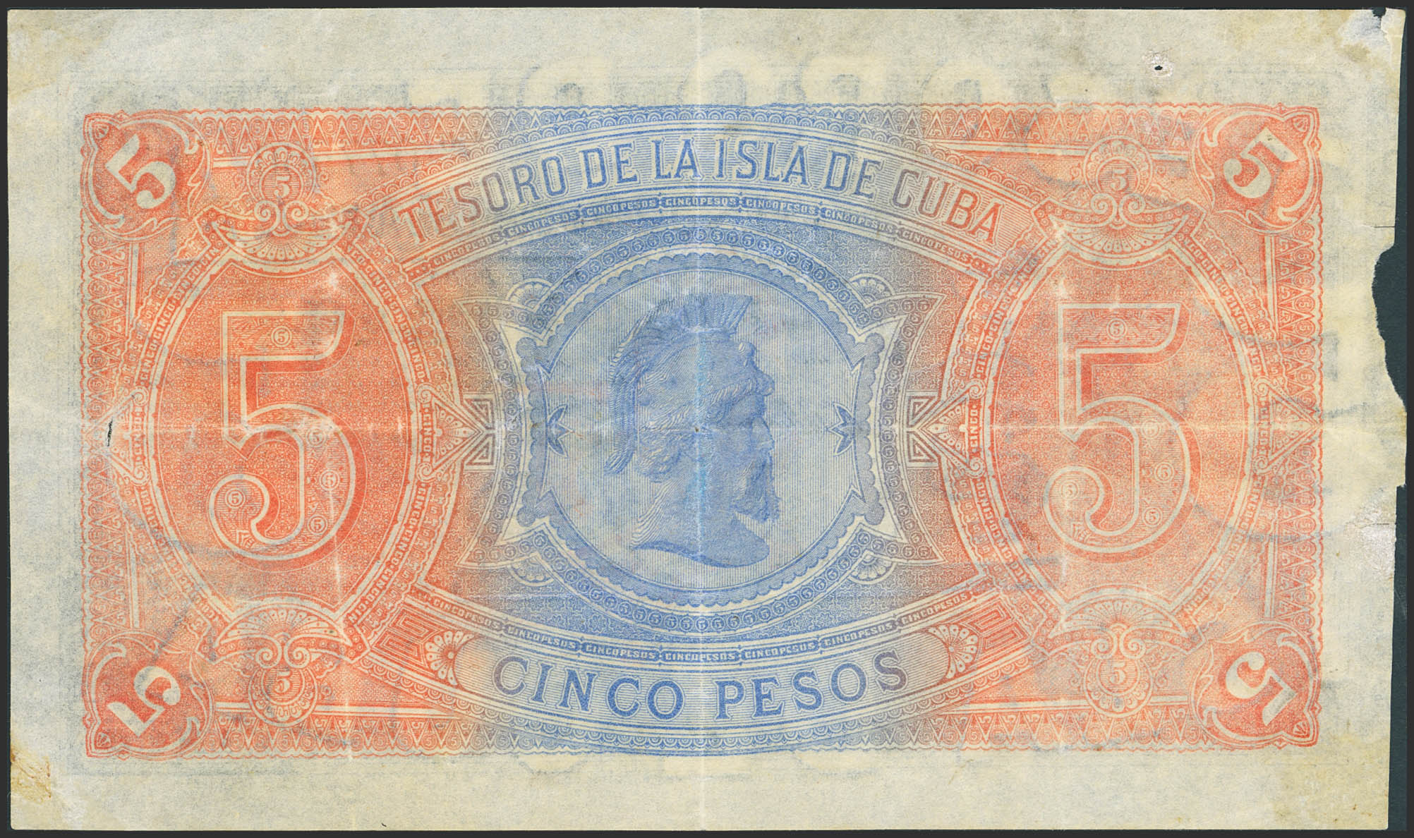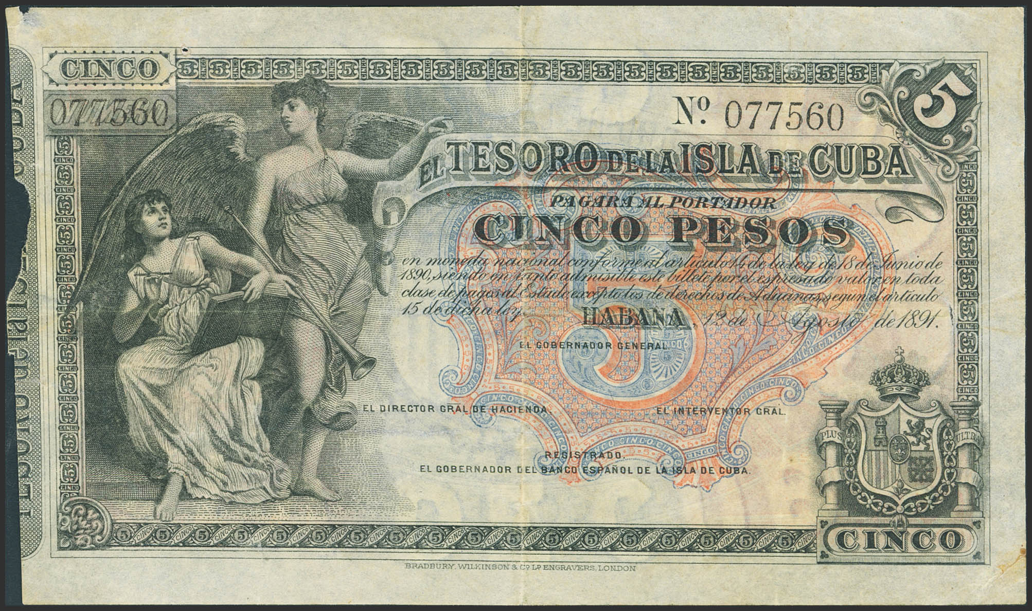 BANCO ESPAÑOL DE LA ISLA DE CUBA. 5 Pesos. August 12, 1891. No series. (Edifil 2023: 64). Rare, needle point as is normal in the Bank of Cuba banknotes, very presentable banknote. VF-.