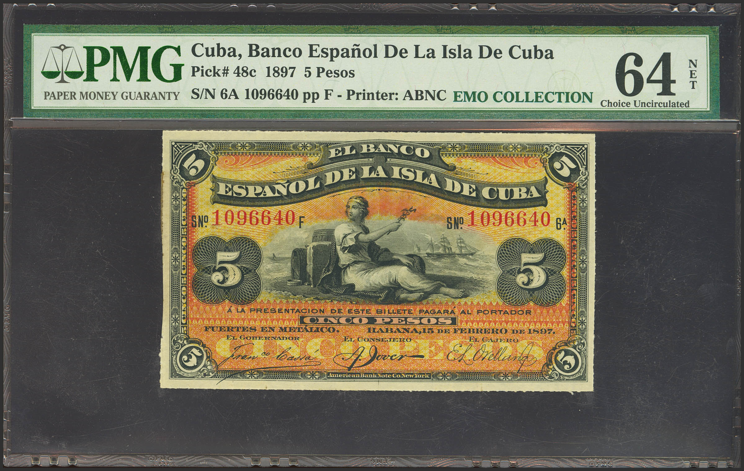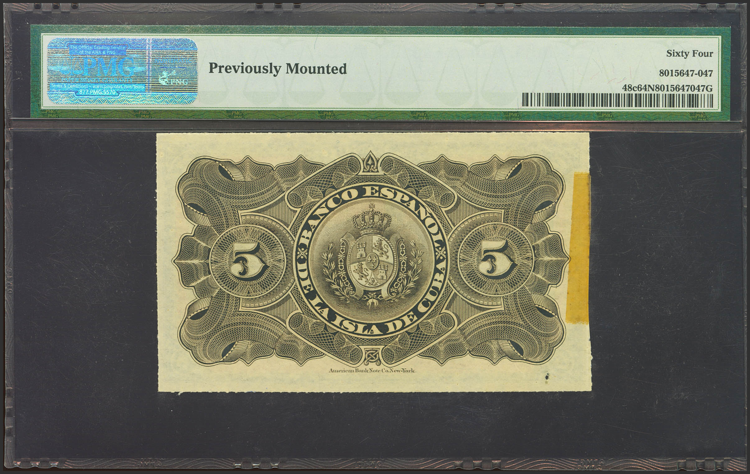 English BANCO ESPAÑOL DE LA ISLA DE CUBA. 5 Pesos. February 15, 1897. Series F. (Edifil 2023: 72, Pick: 48c). Rare, previously mounted. Uncirculated-. Encapsulated PMG64NET (previously mounted).