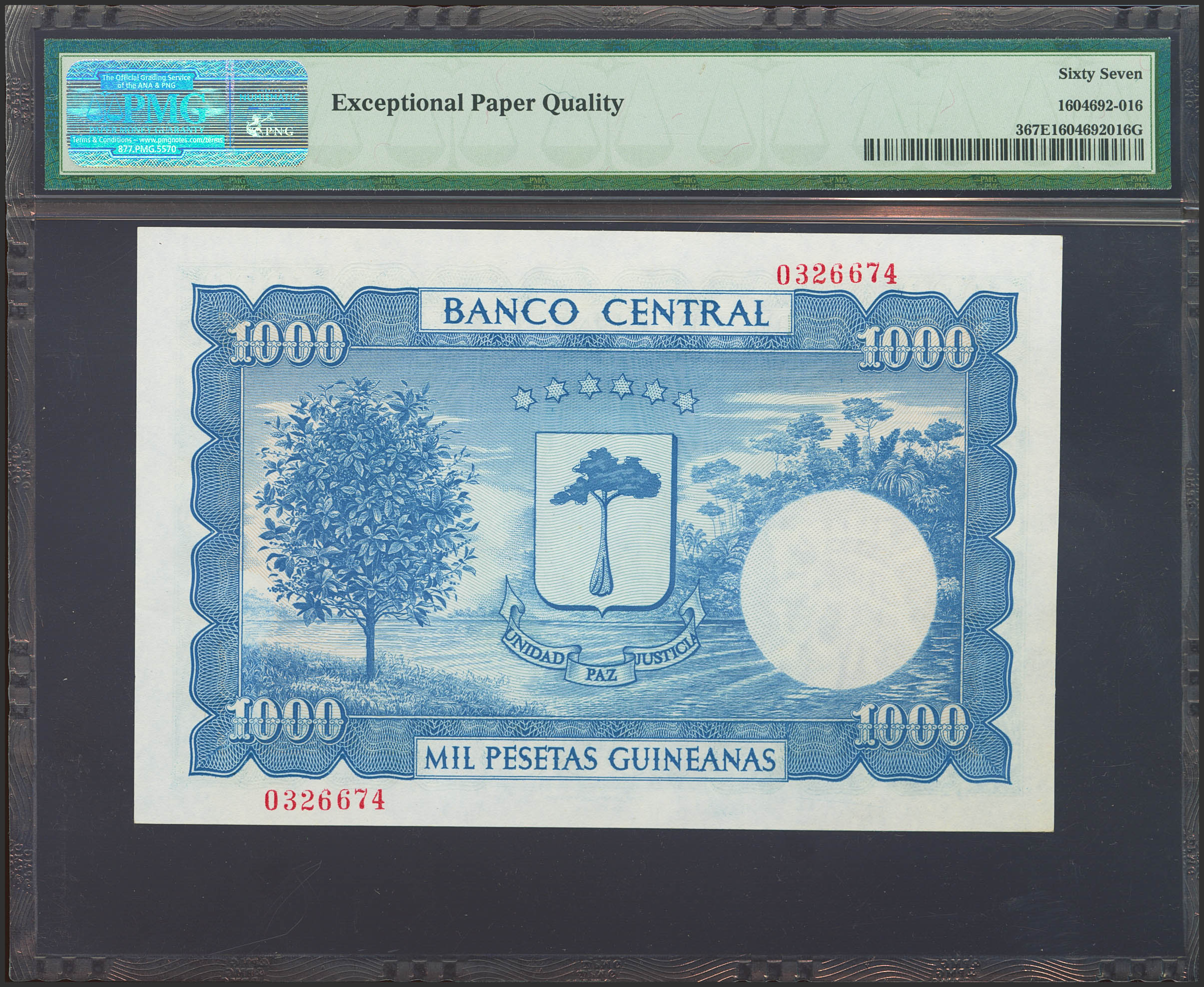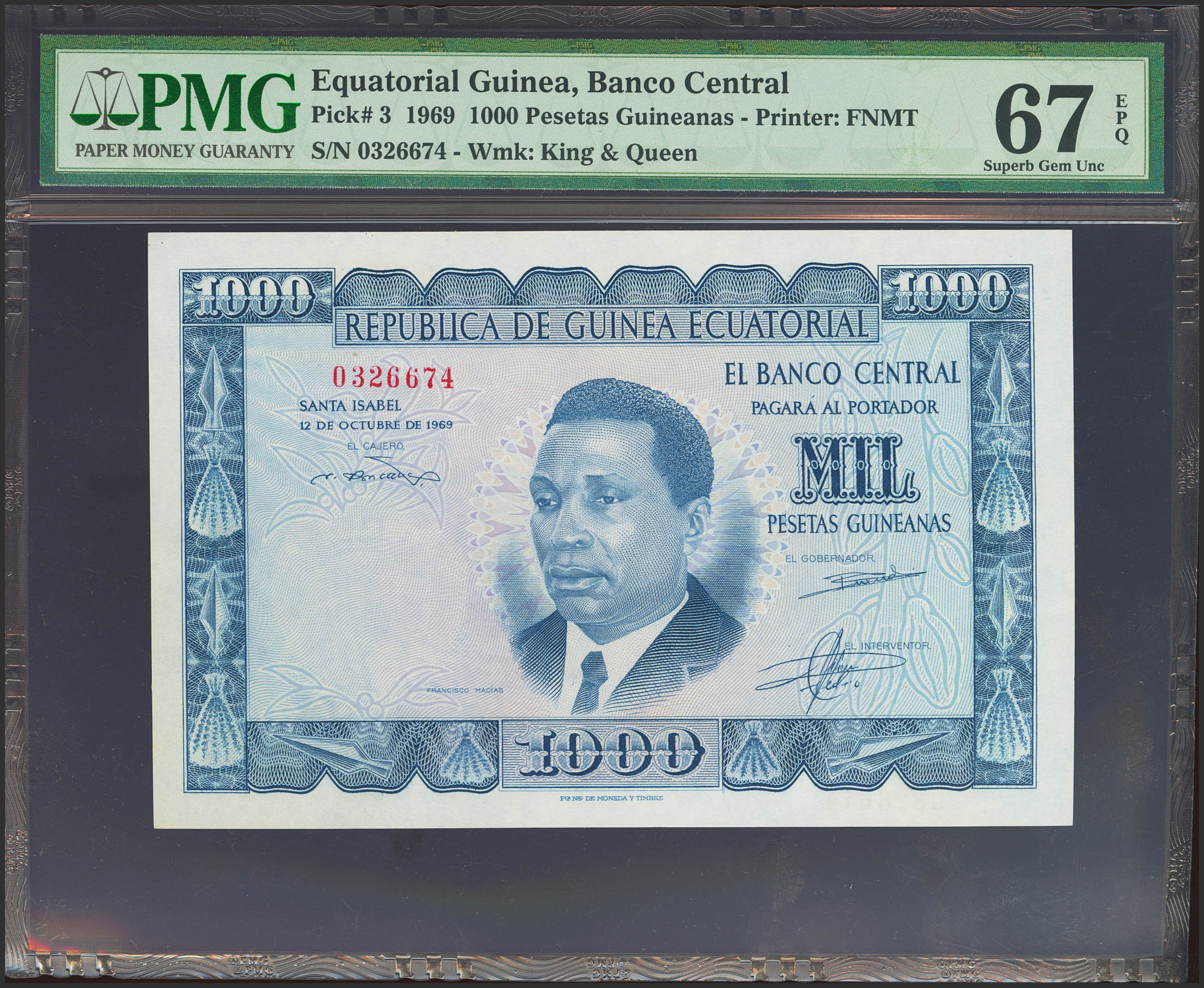 EQUATORIAL GUINEA. 1000 Pesetas. October 12, 1969. No series. (Pick: 3). Rare in this exceptional quality, original finish. Uncirculated. Encapsulated PMG67EPQ.