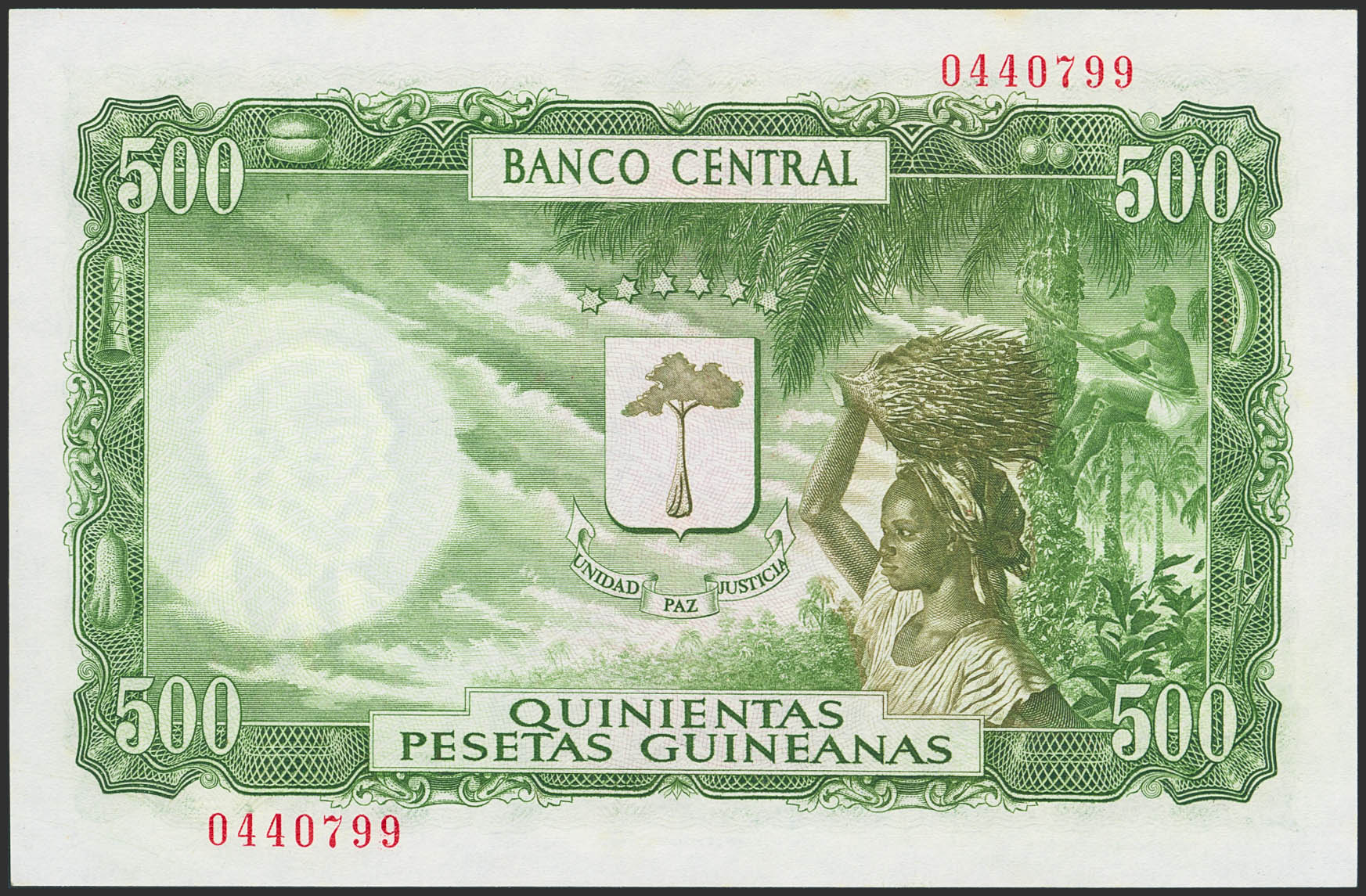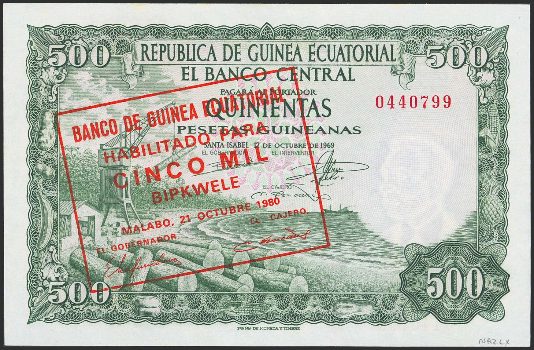 English EQUATORIAL GUINEA. 5000 Bipkwele on 500 Guinean Pesetas. December 1, 1969. (Pick: 19). Original marking, age spots. Uncirculated-.