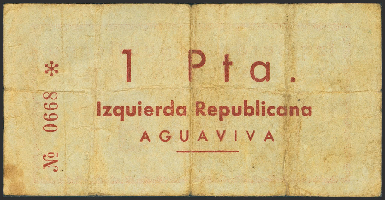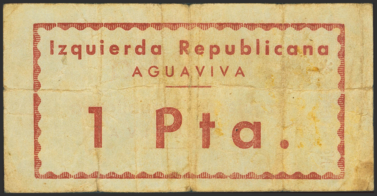 AGUAVIVA (TERUEL). 1 Peseta. (1937ca). (González: 80). Extremely rare, to give an idea of the rarity, in the González catalogue the photograph of the note is in black and white and according to our data it has never been offered at auction before. Very Fine-.