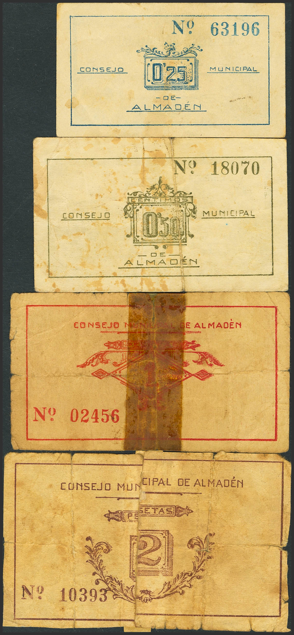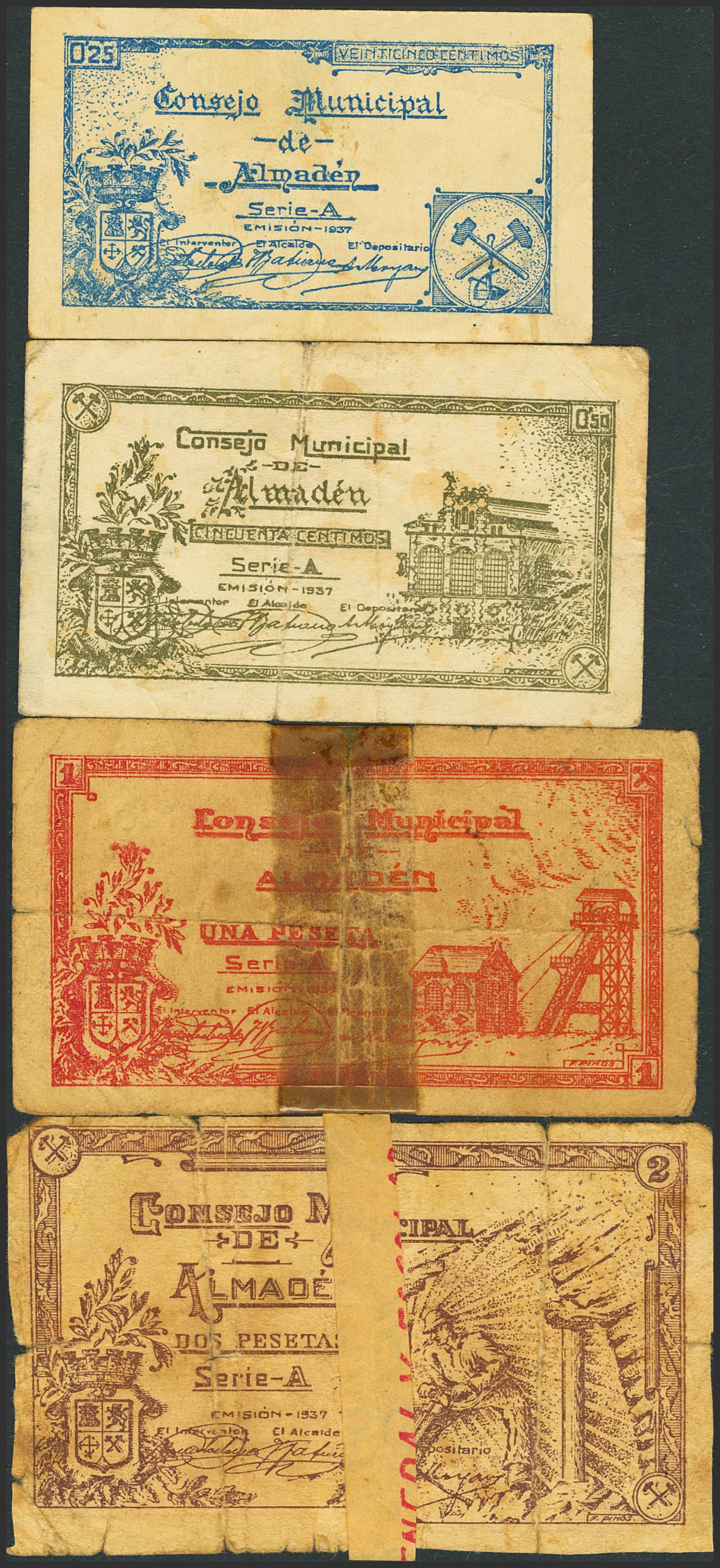 ALMADEN (CIUDAD REAL). 25 Cents, 50 Cents, 1 Peseta and 2 Pesetas. 1937. Series A, all of them. (González: 535, 536). Rare complete series. Very Fine/Good.