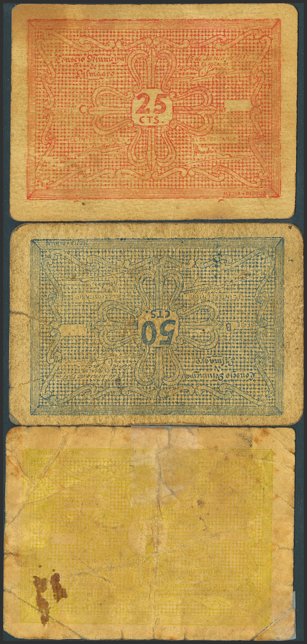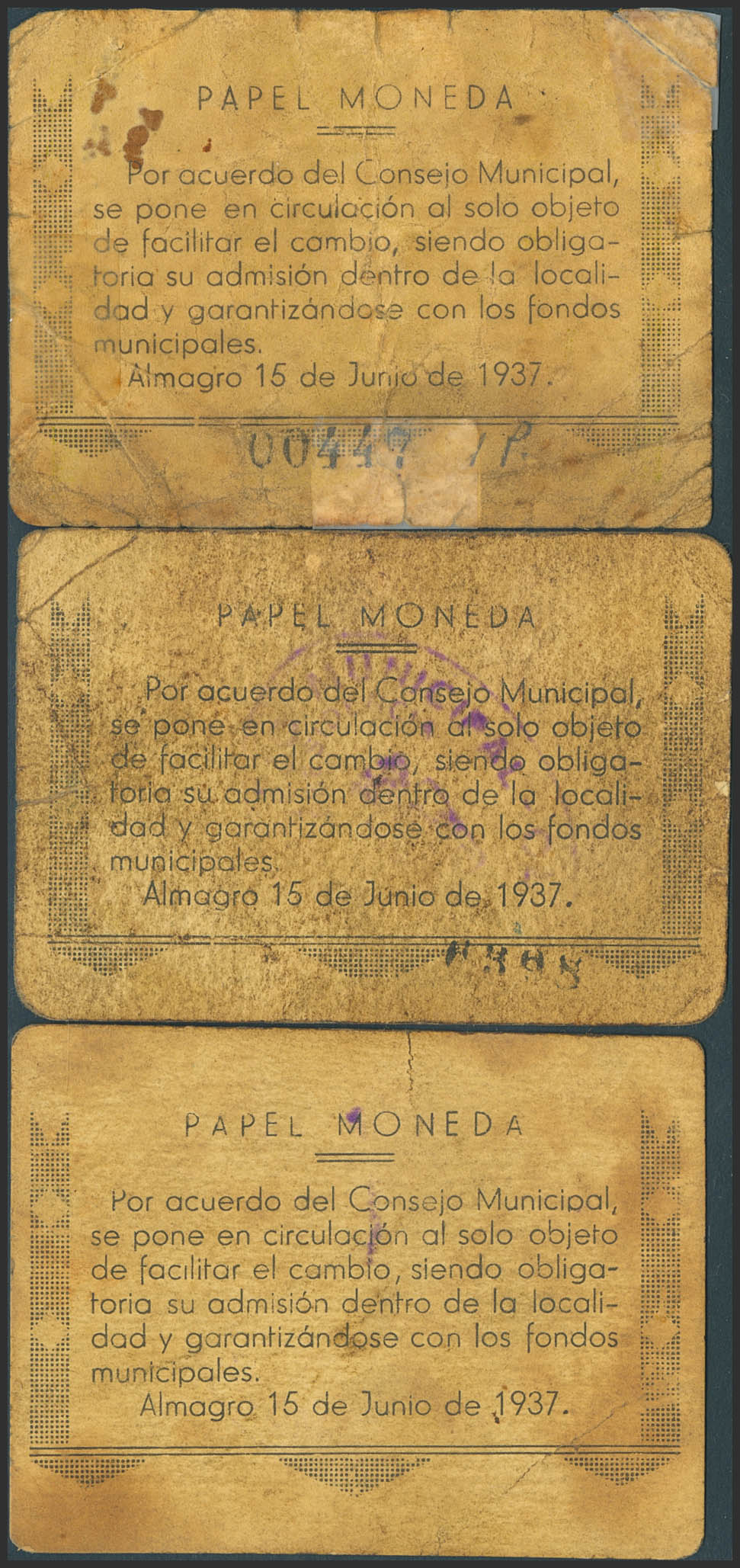 ALMAGRO (CIUDAD REAL). 25 Cents, 50 Cents and 1 Peseta. June 15, 1937. Series C, B and C, respectively. (González: 546/58). Rare complete series. Very Fine/Good-.